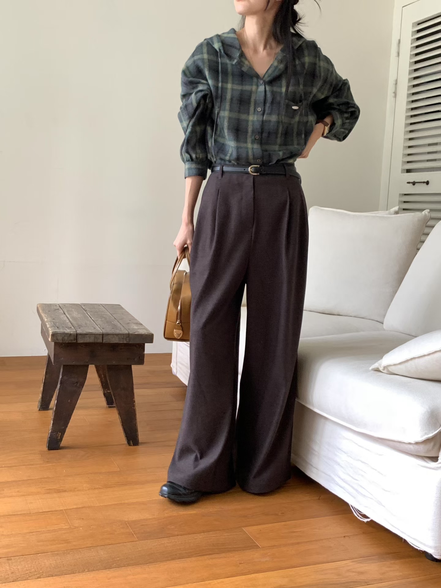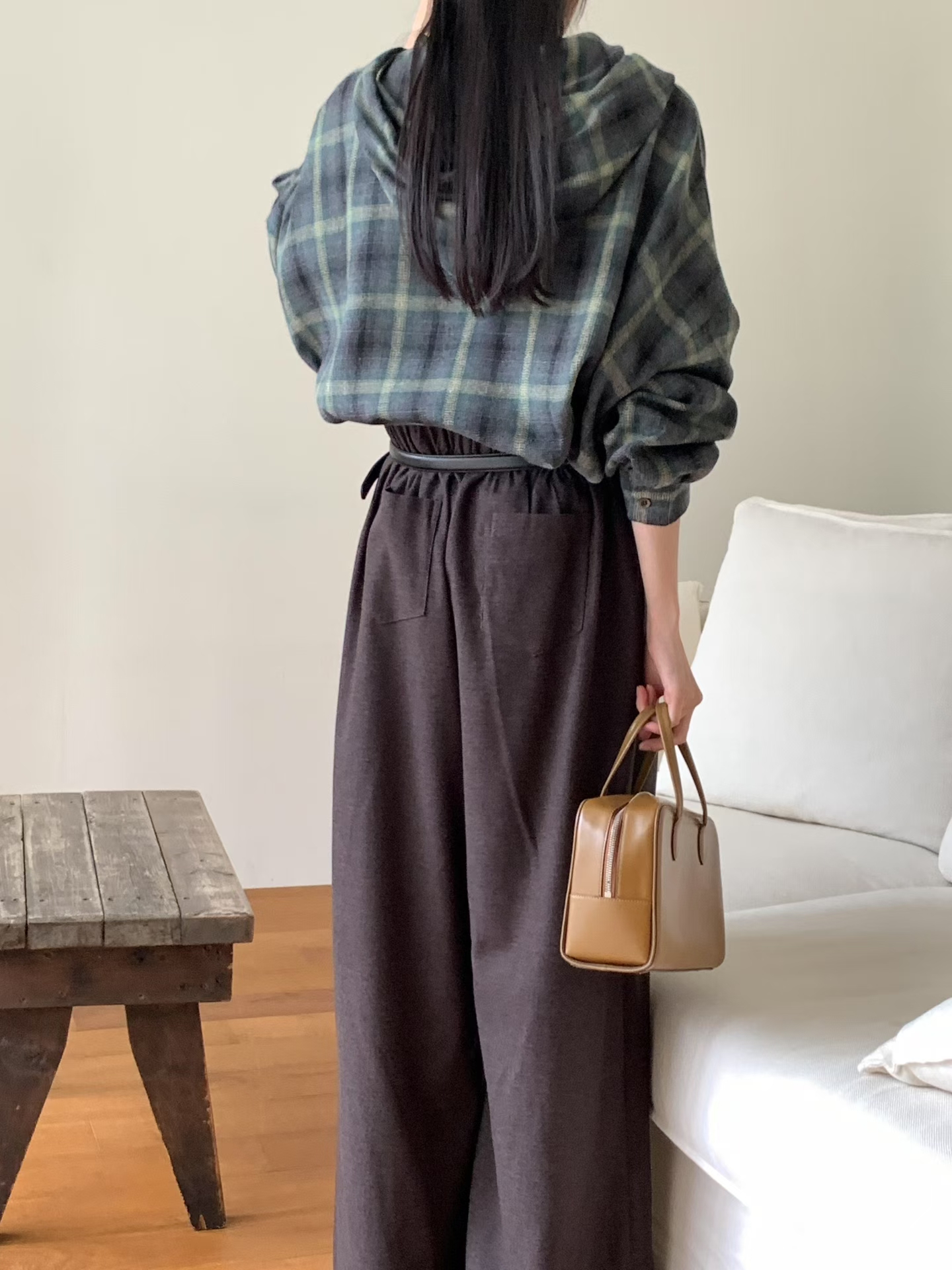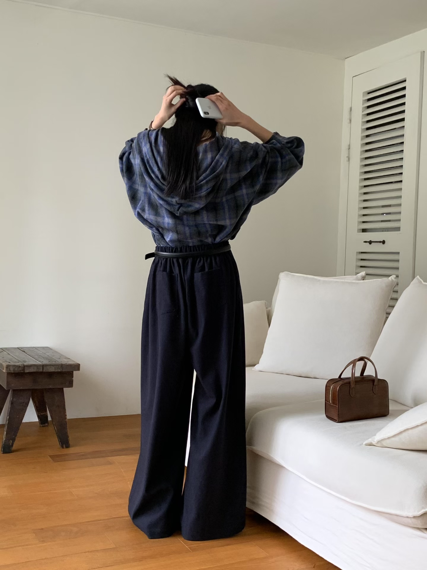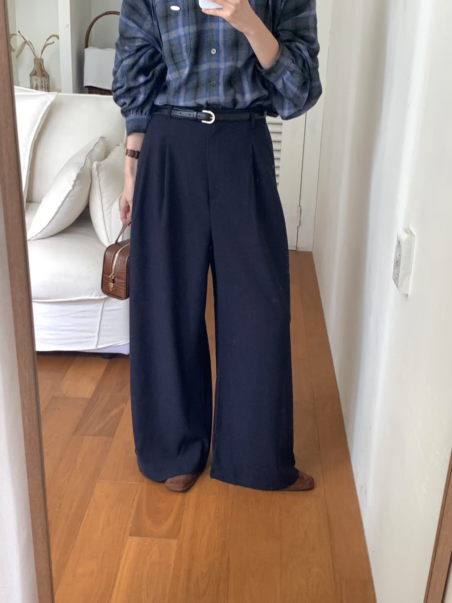 後鬆緊前壓褶秋冬厚款寬褲(附皮帶)