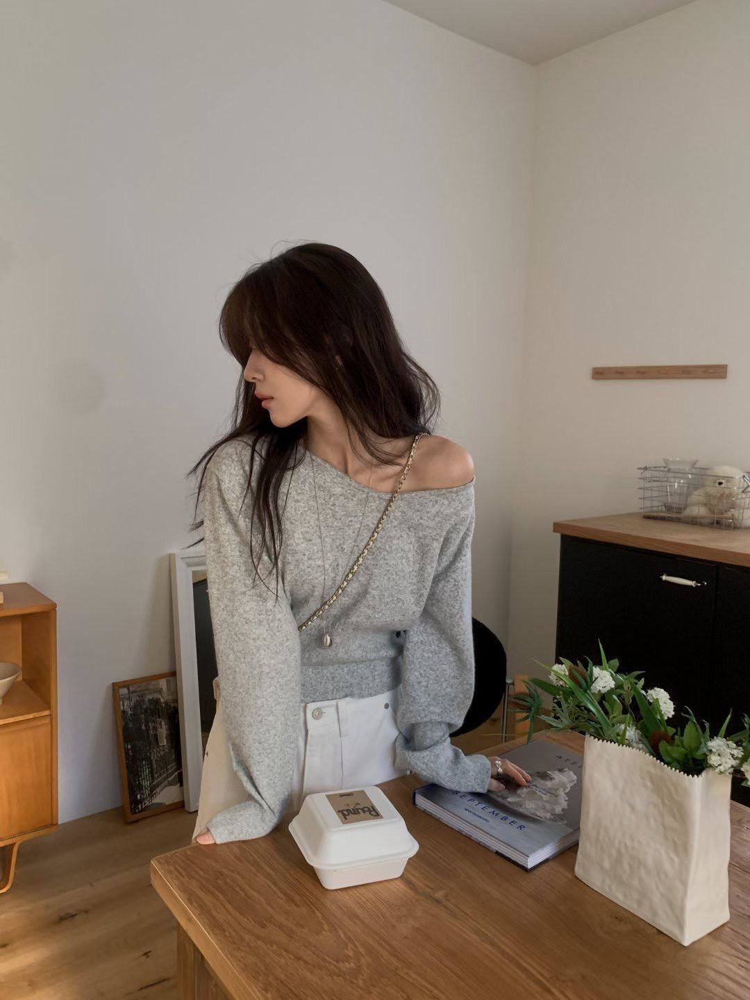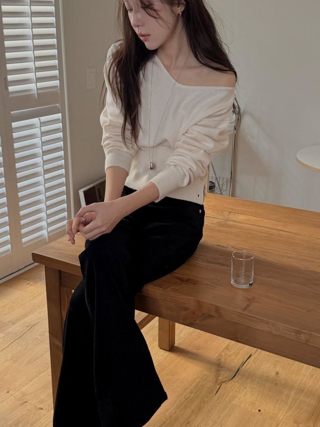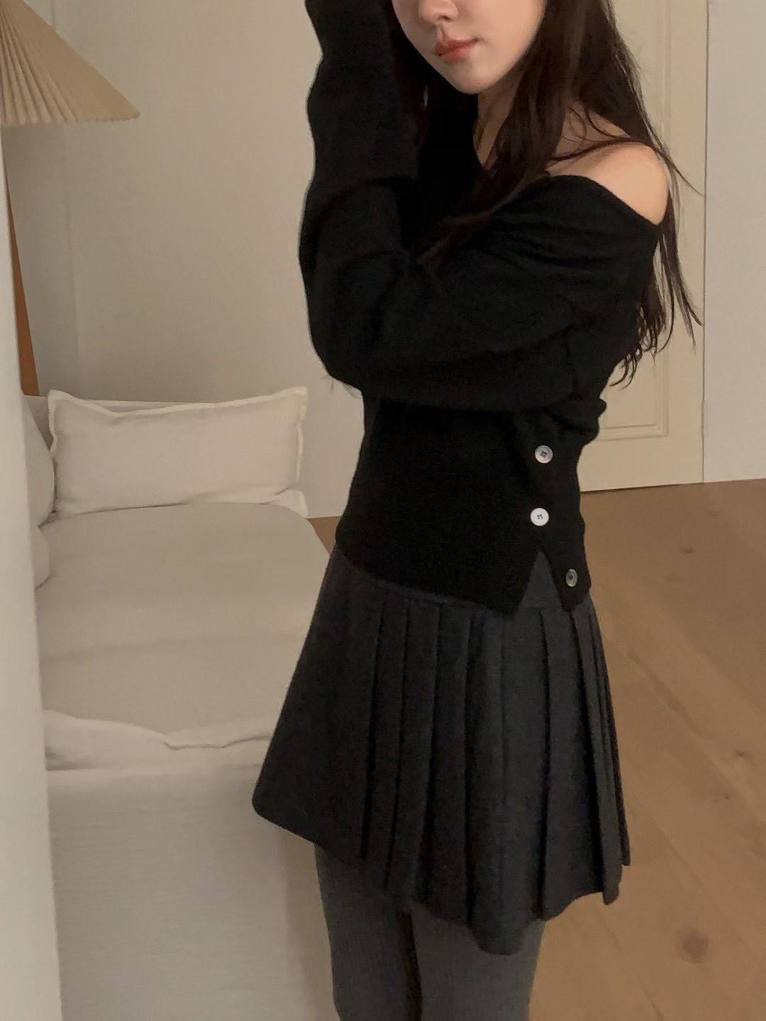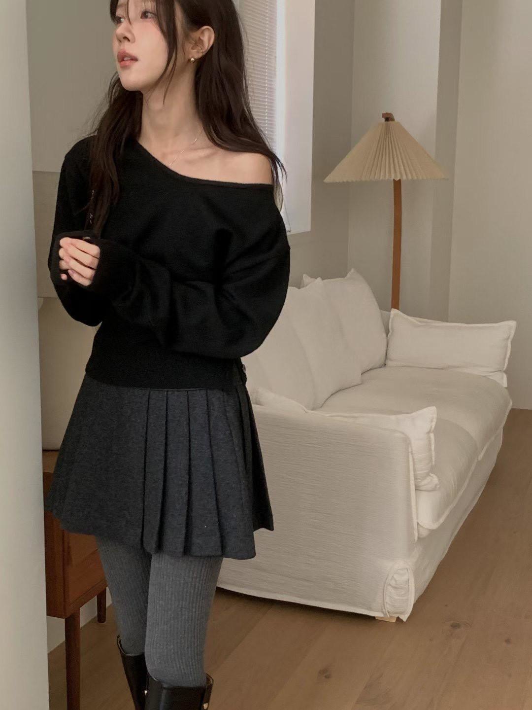 斜肩長版麻花針織衣+鬆緊落地長裙SET