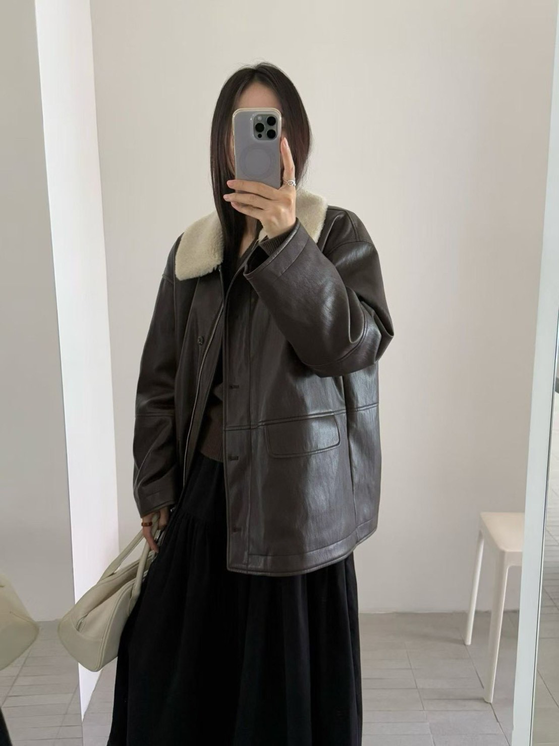 毛毛翻領混鴨絨皮革長版外套