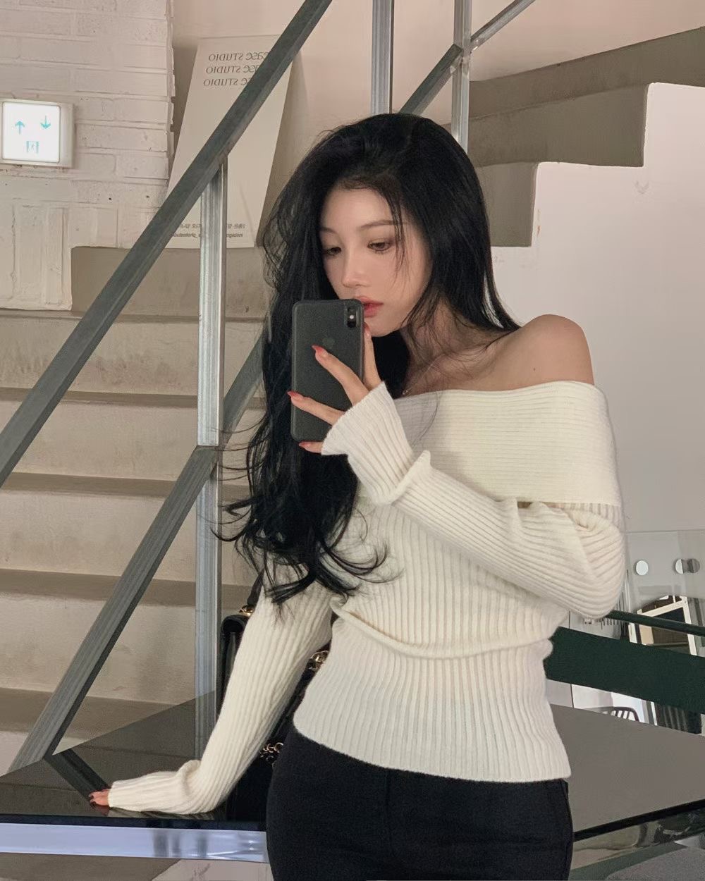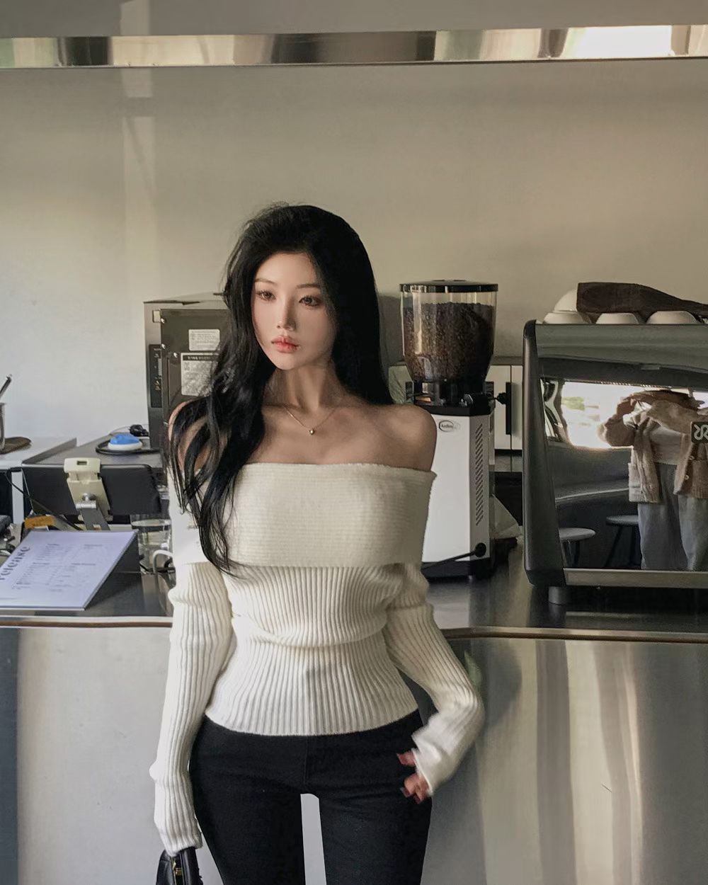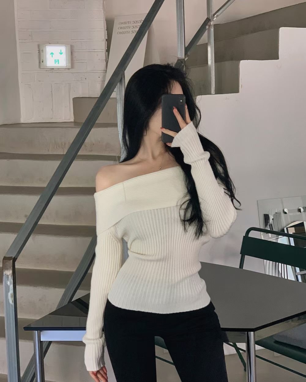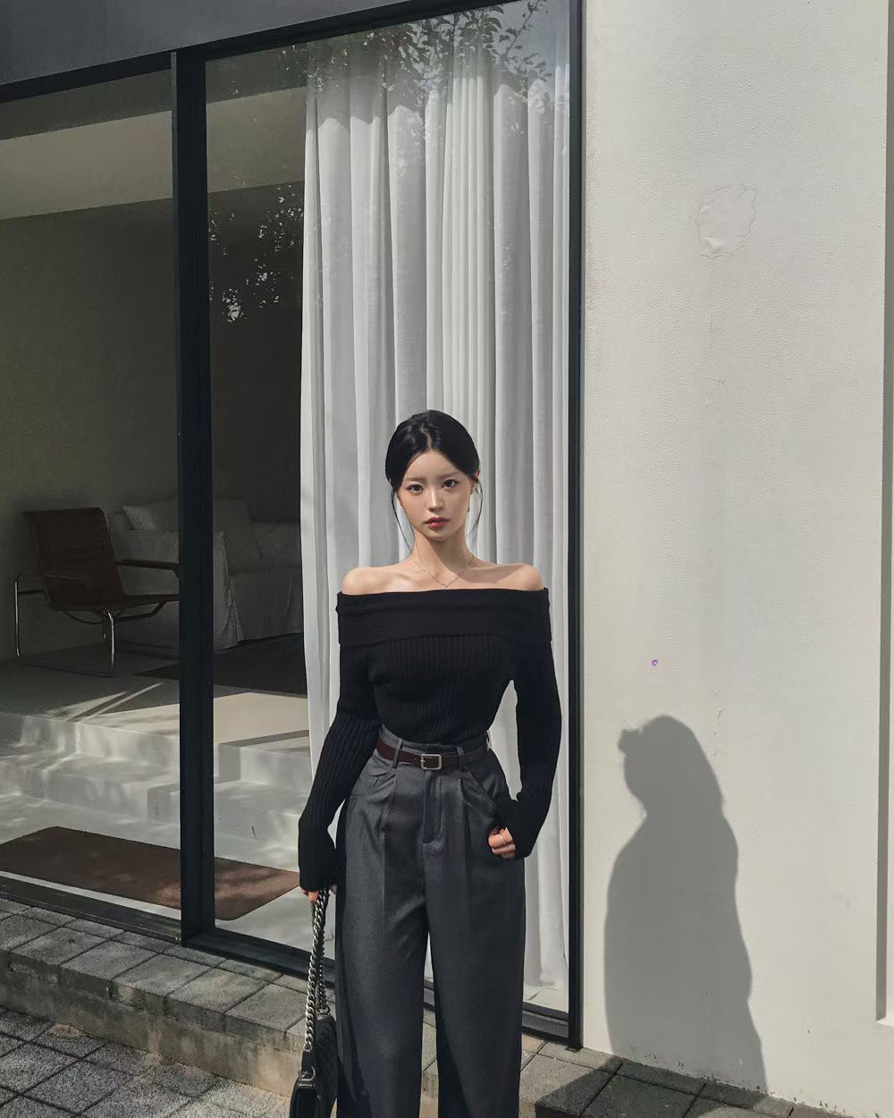 斜肩寬版短腰薄T+低腰抽繩長裙SET