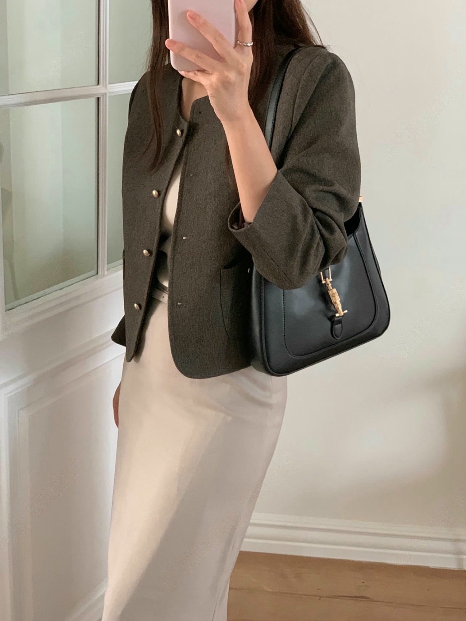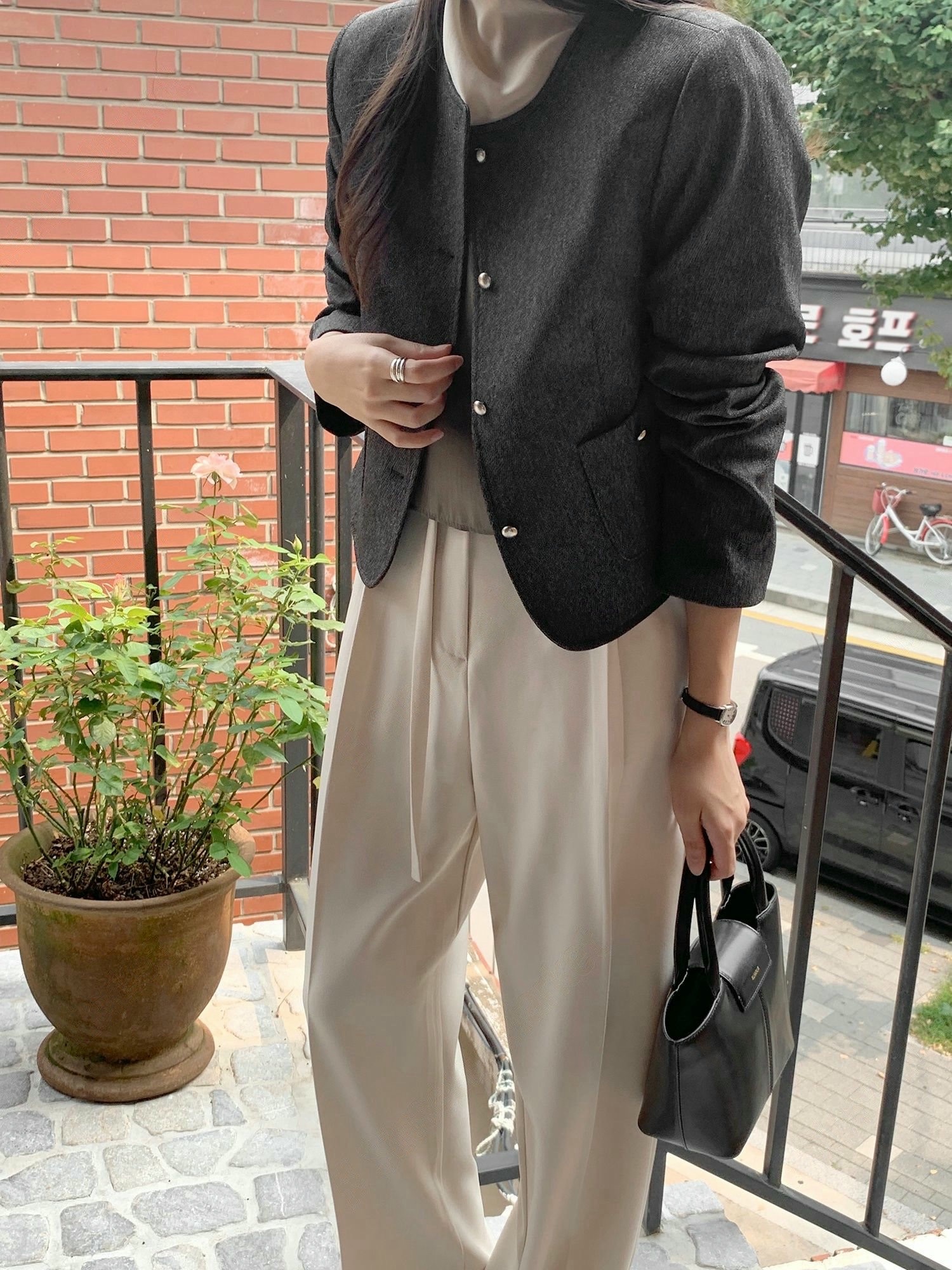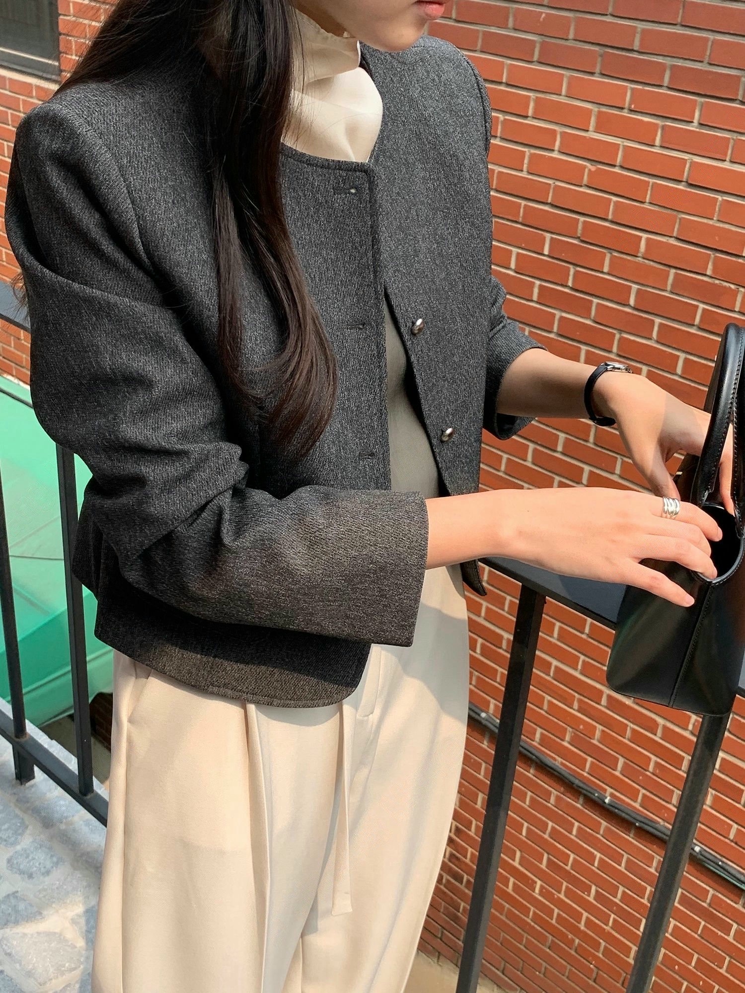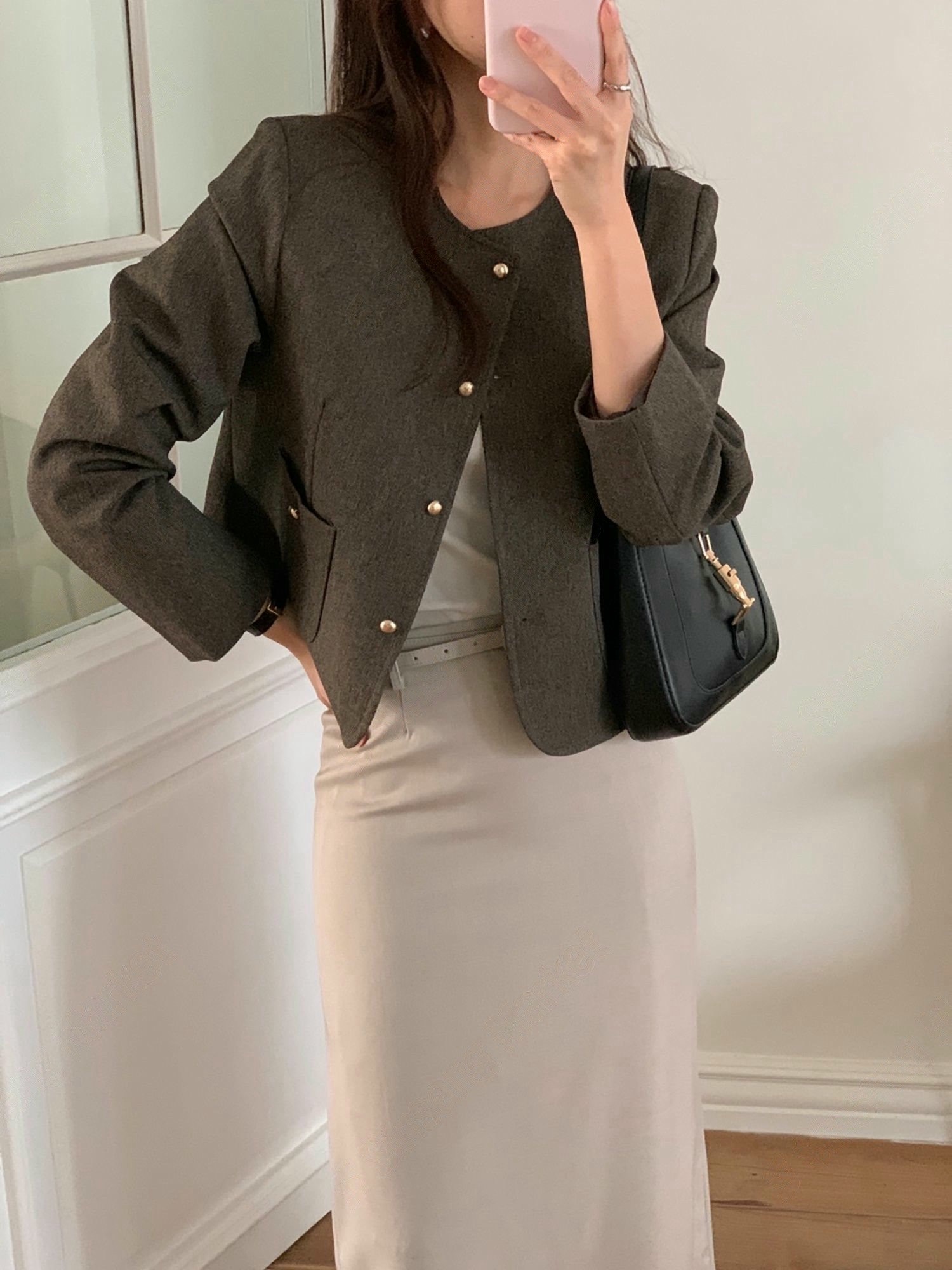 雙口袋圓領銀釦織紋外套