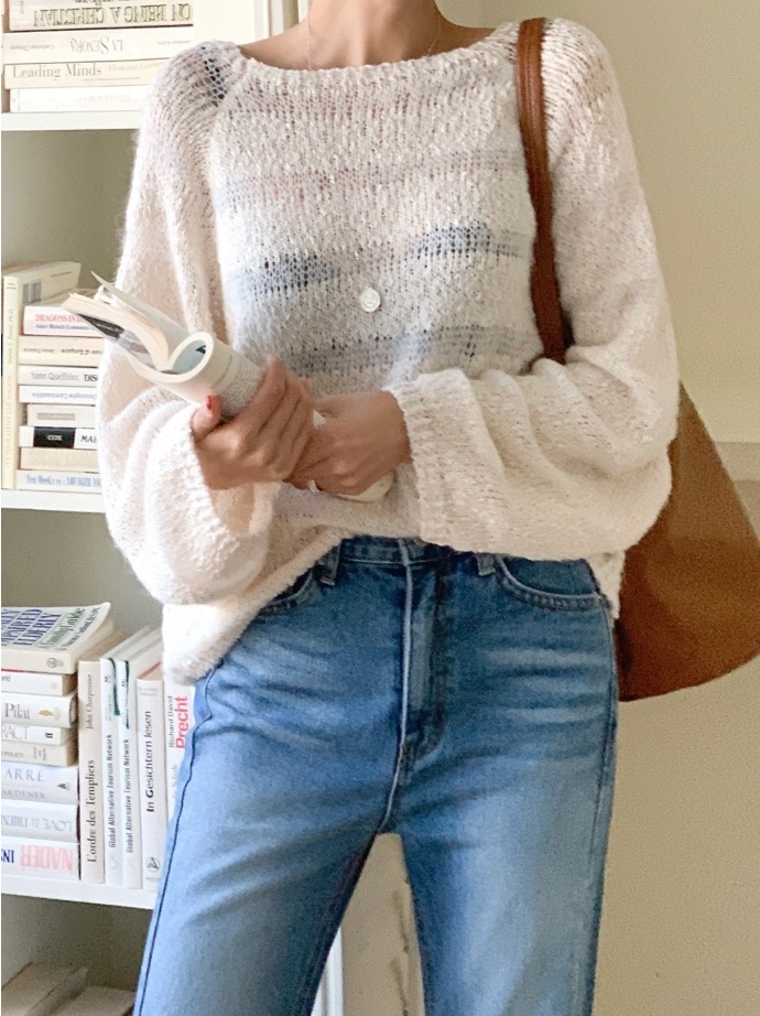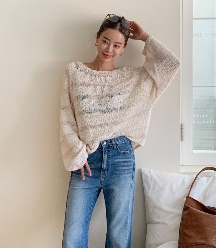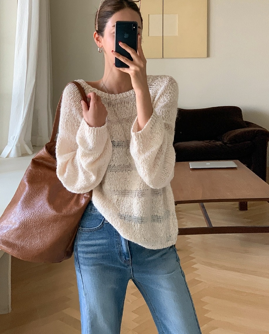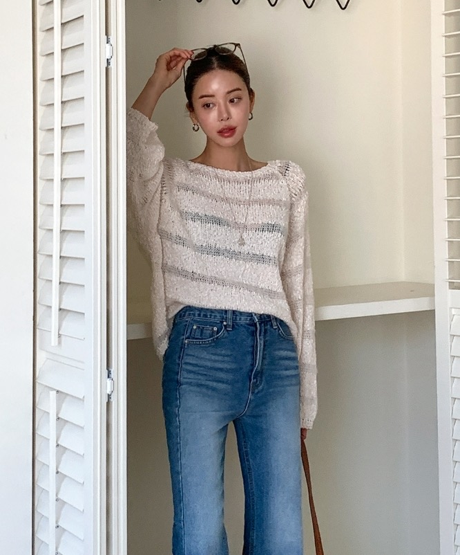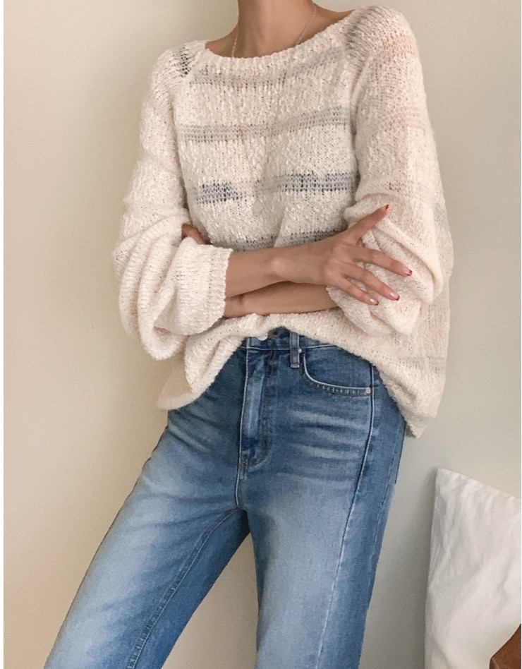 落肩寬鬆橫紋鏤空微透薄針織衫