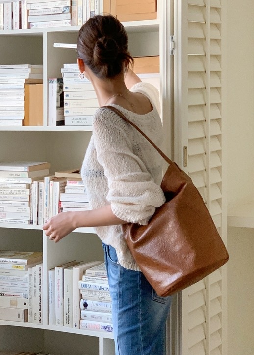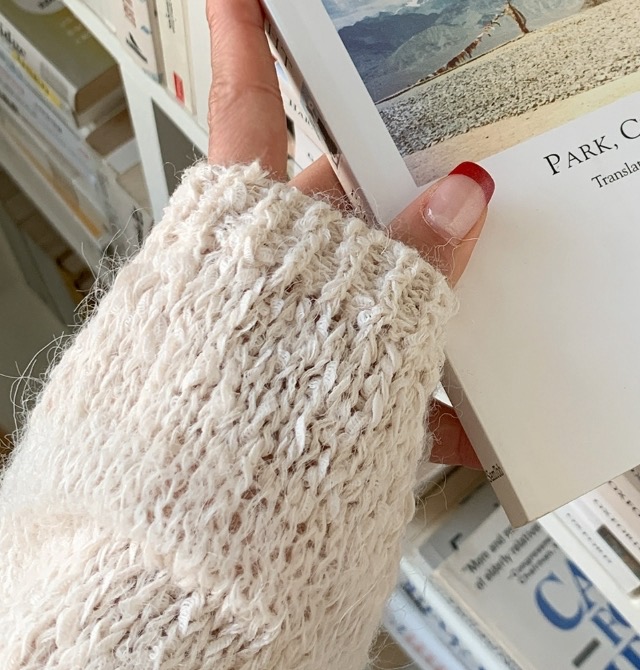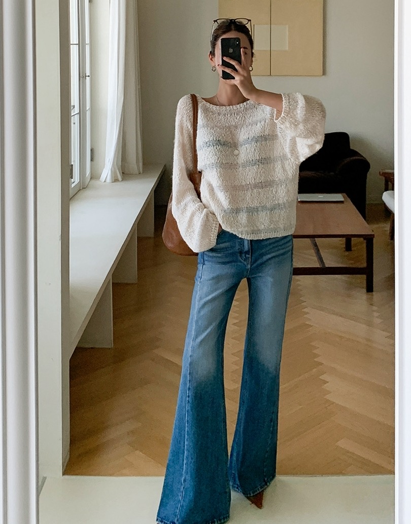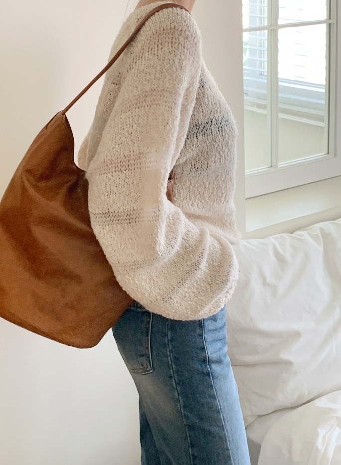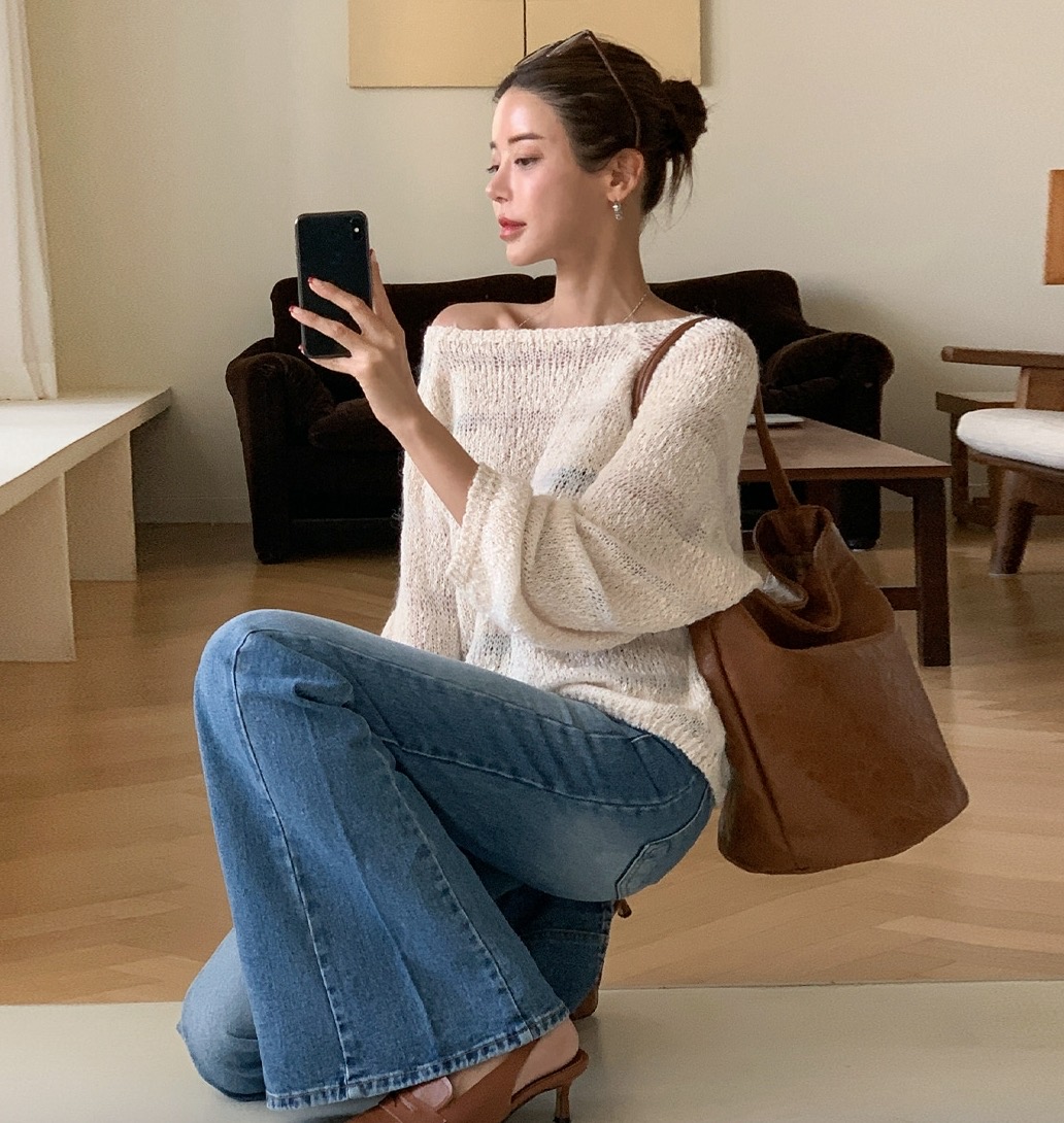 落肩寬鬆橫紋鏤空微透薄針織衫