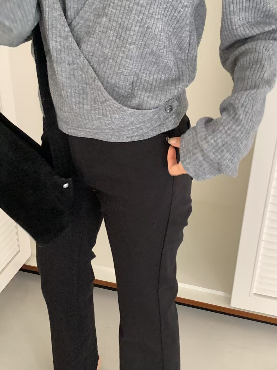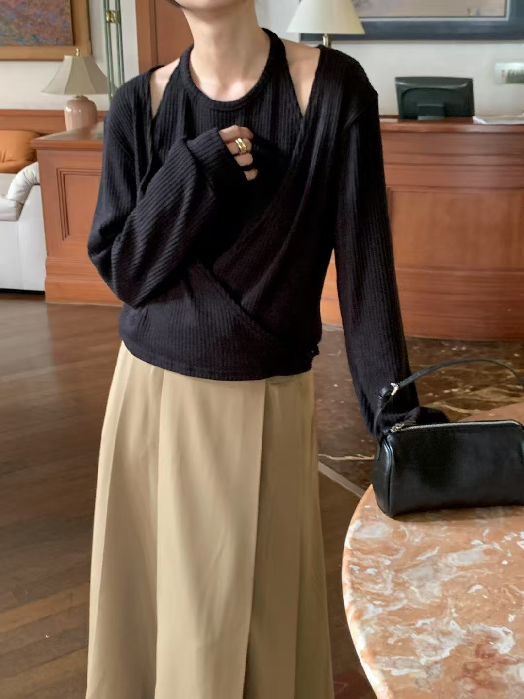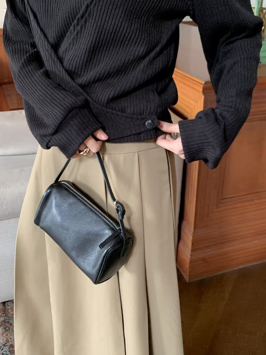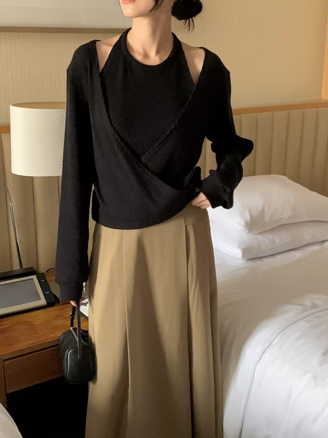 短毛圓領排釦針織衫+鬆緊A字短裙SET