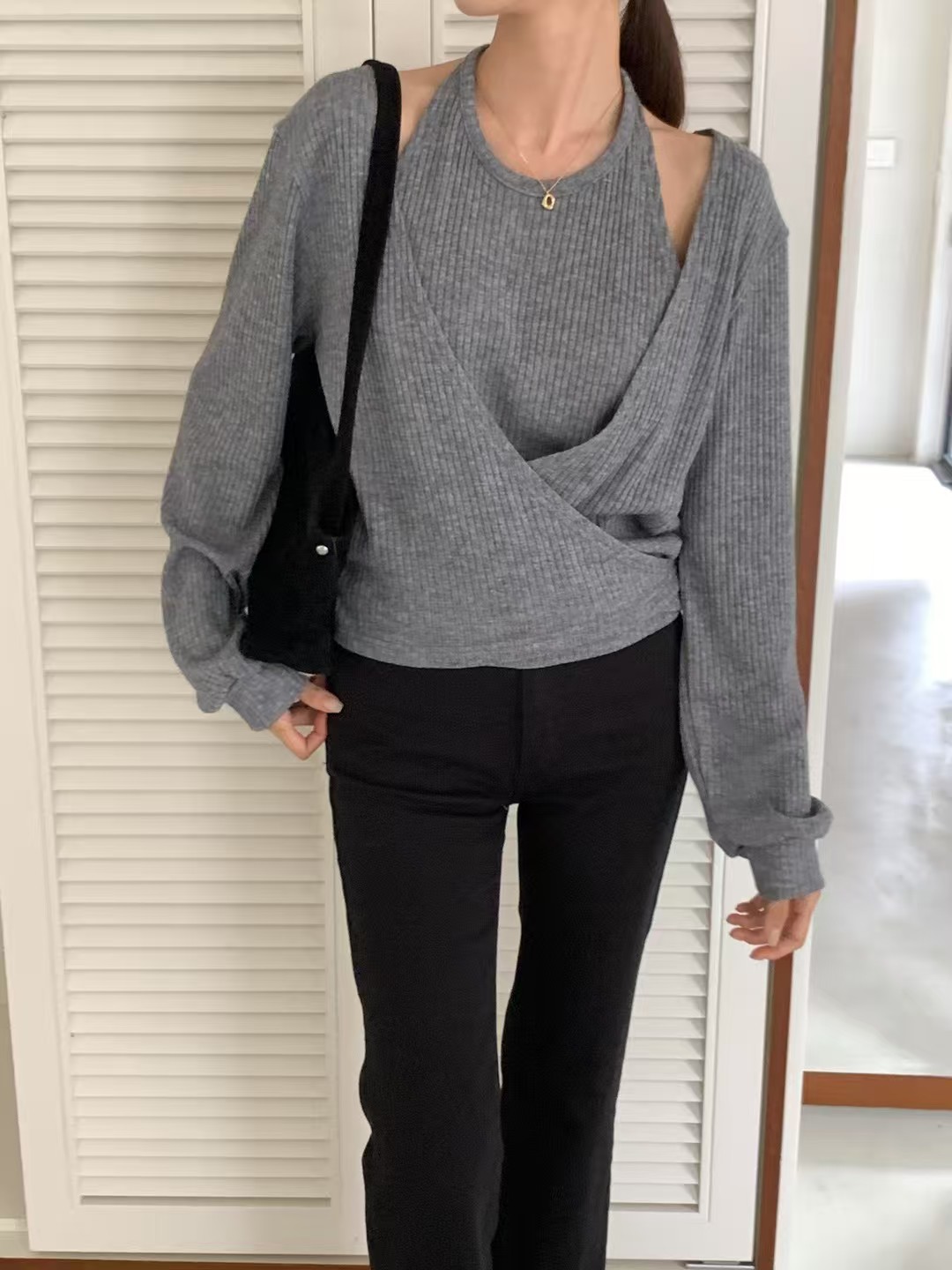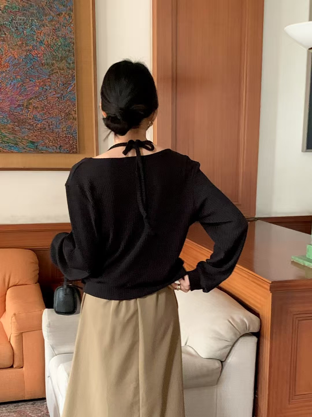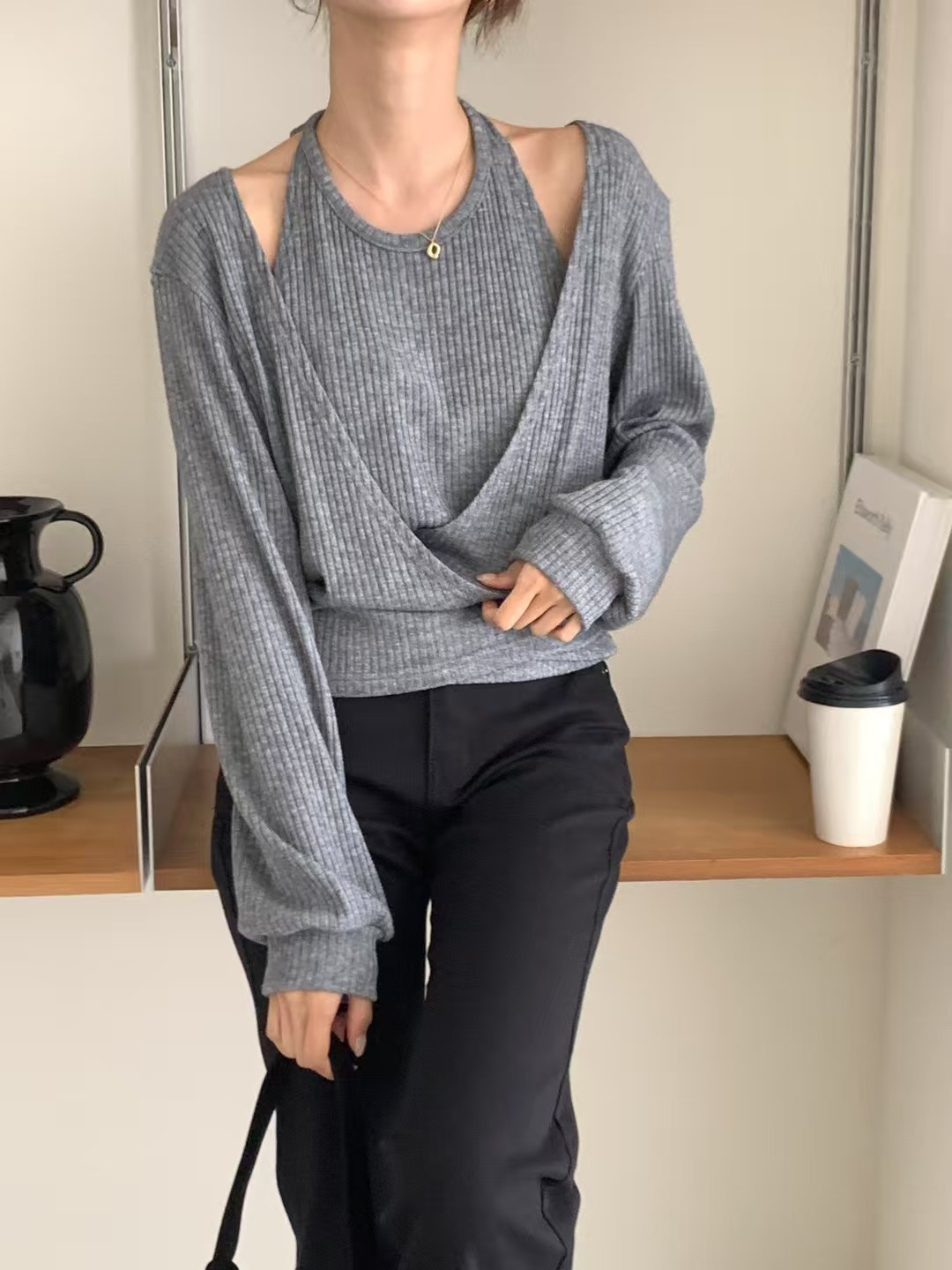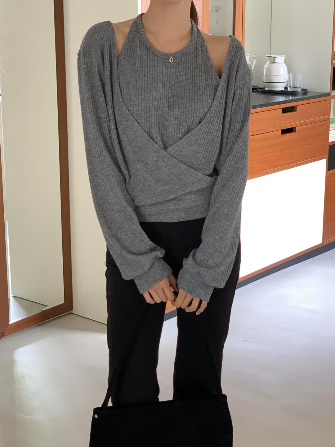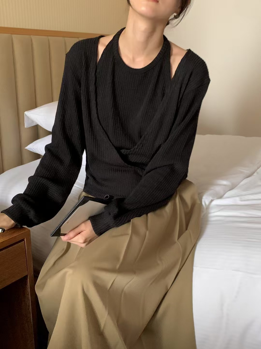 短毛圓領排釦針織衫+鬆緊A字短裙SET