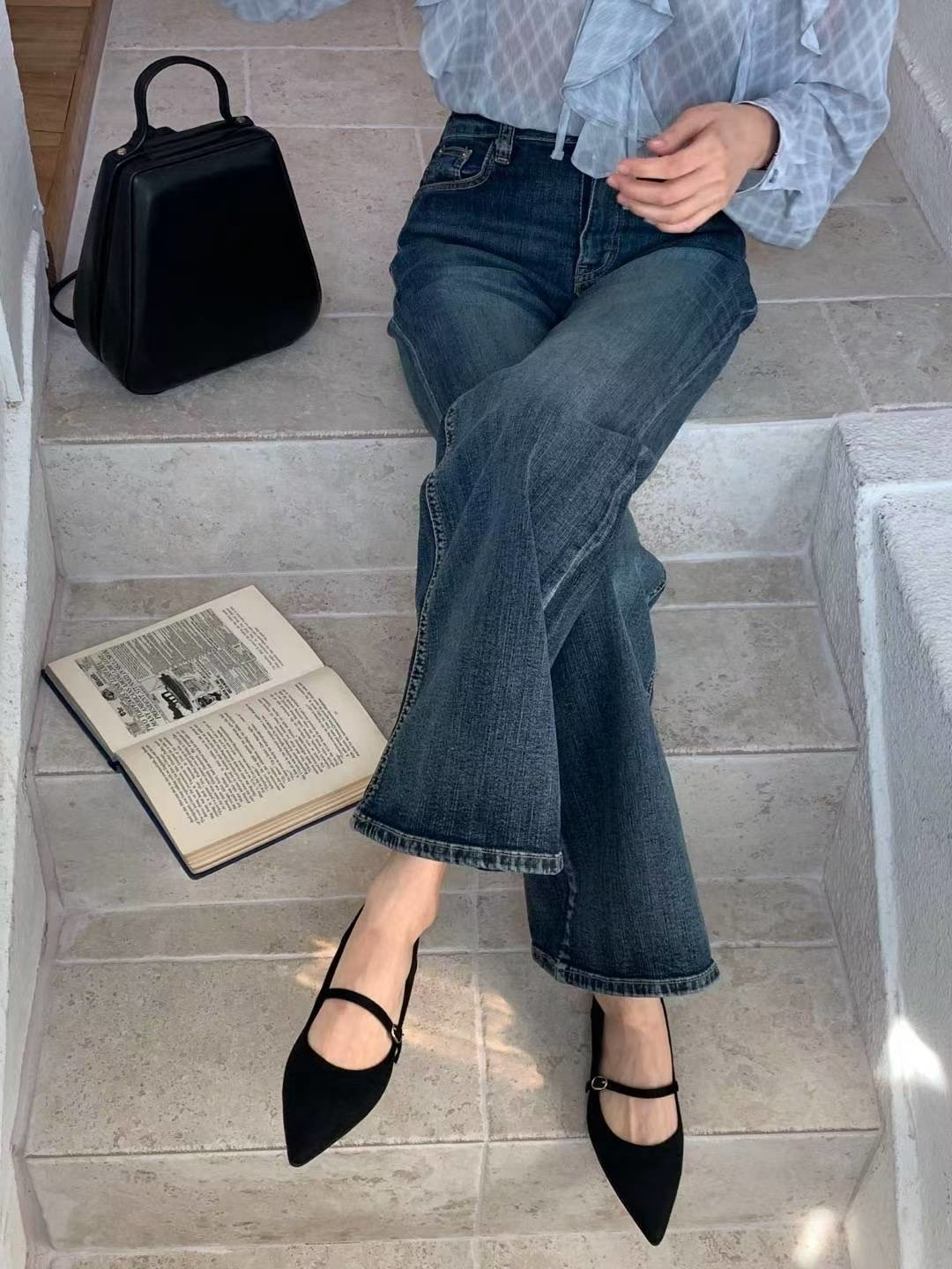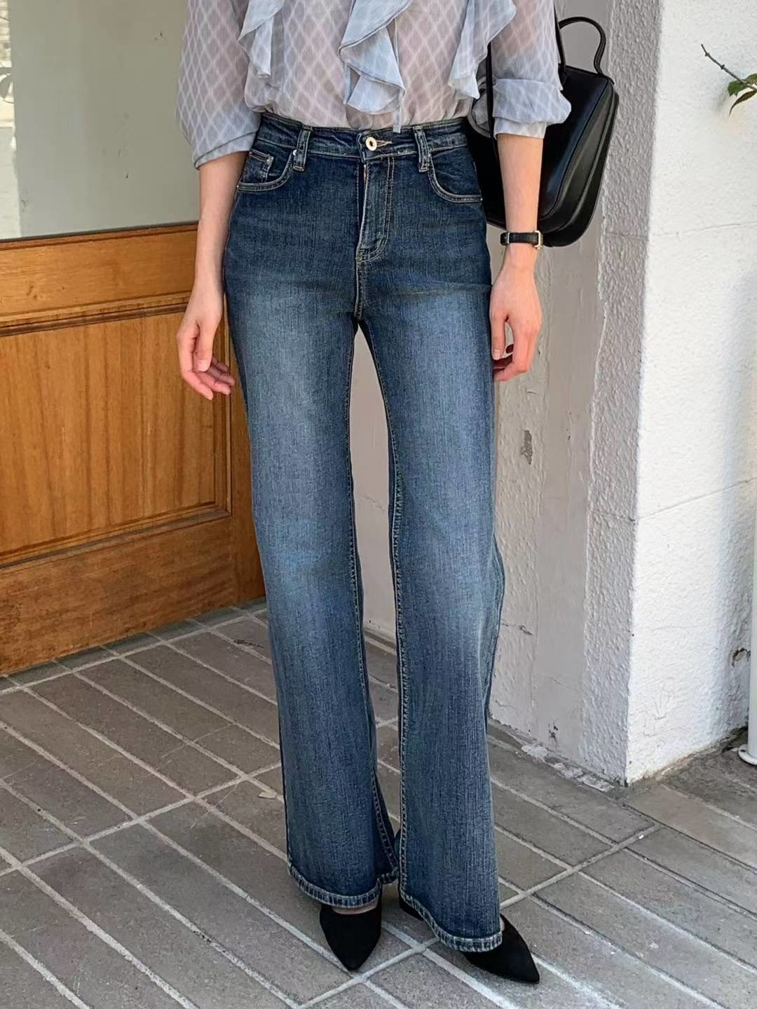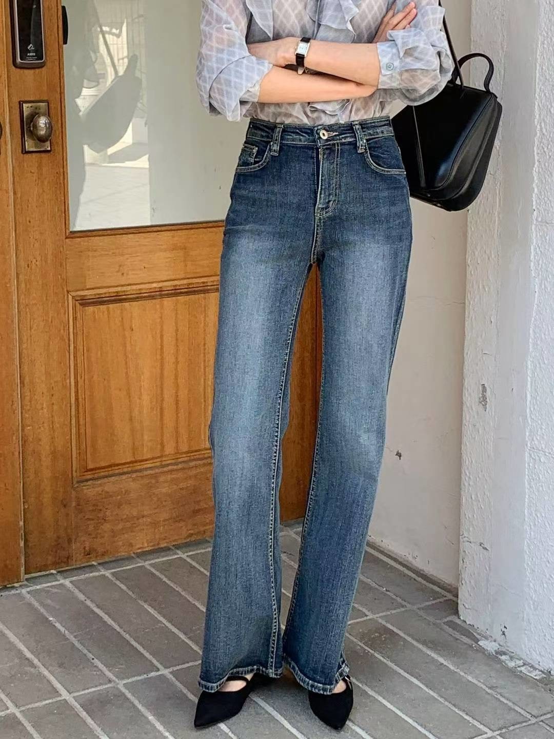 顯瘦復古刷藍小喇叭牛仔褲