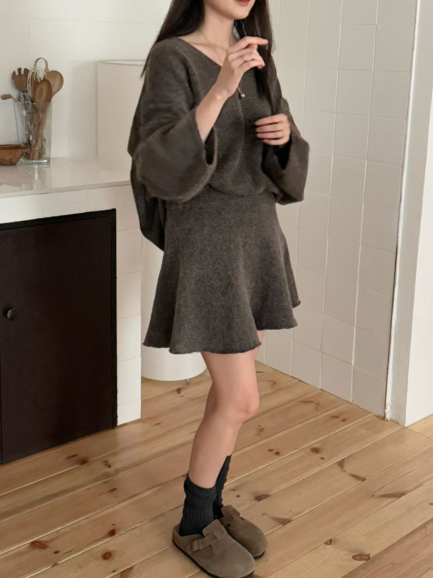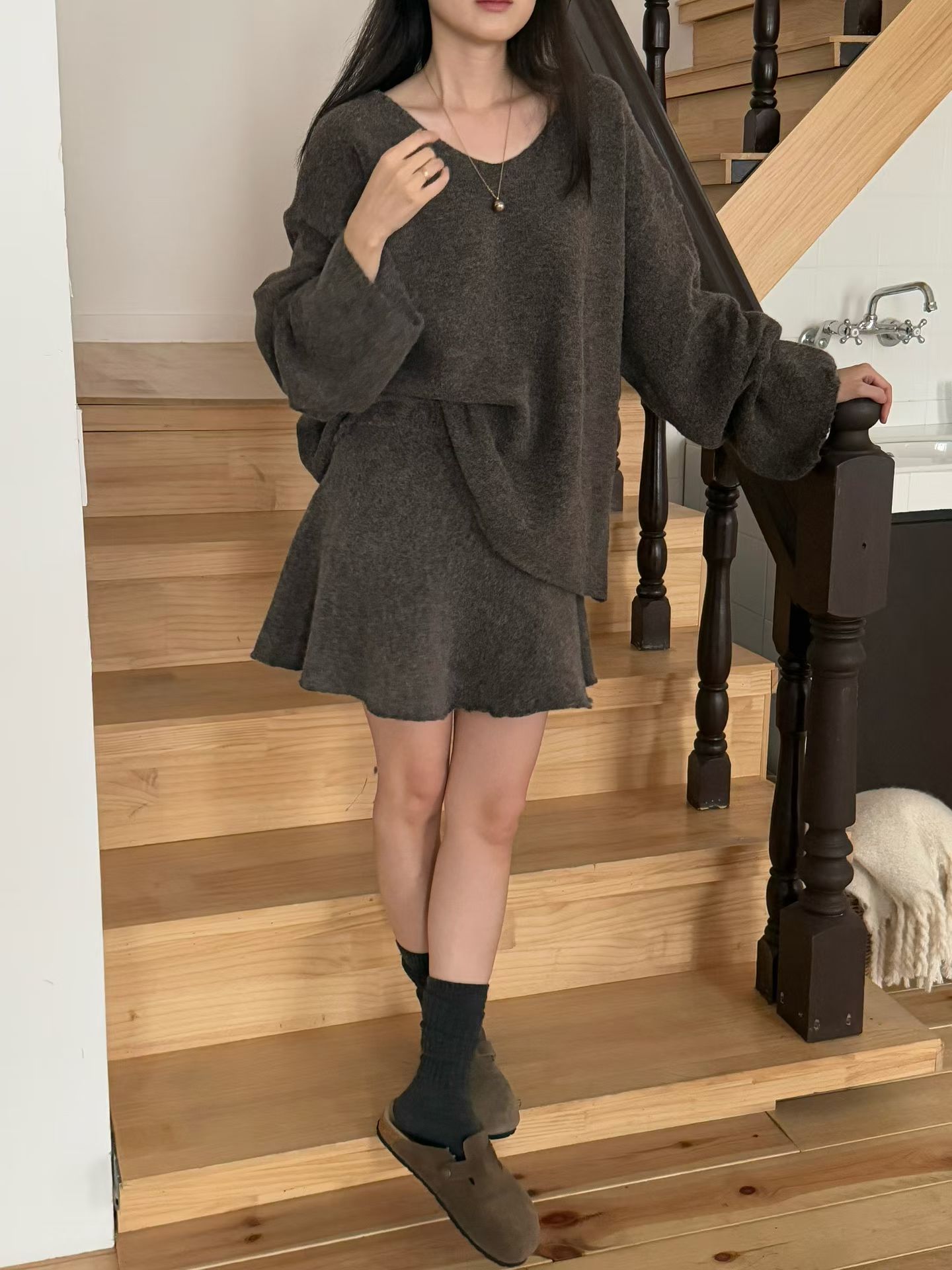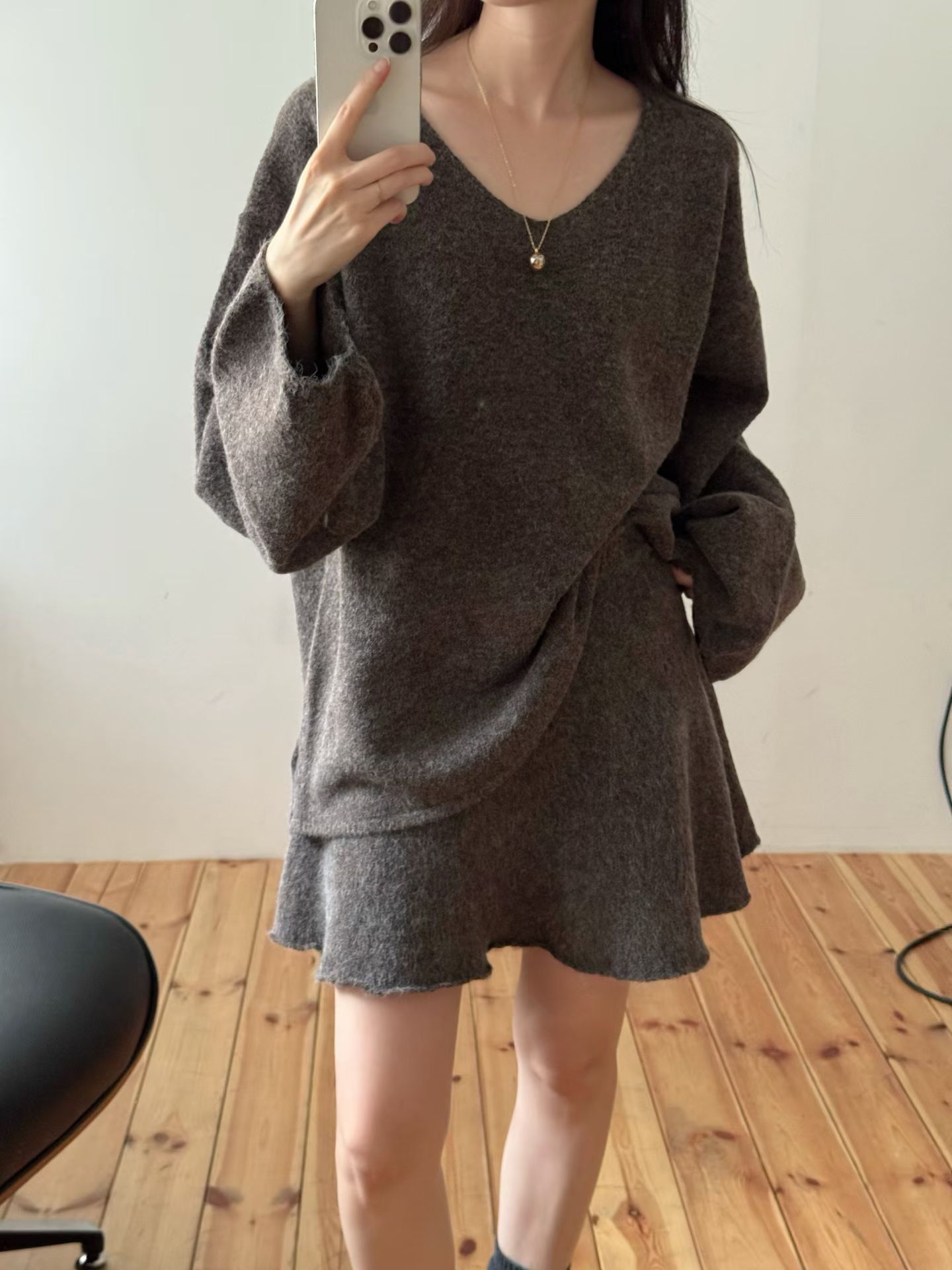 素色V領寬鬆針織衫+針織短裙SET