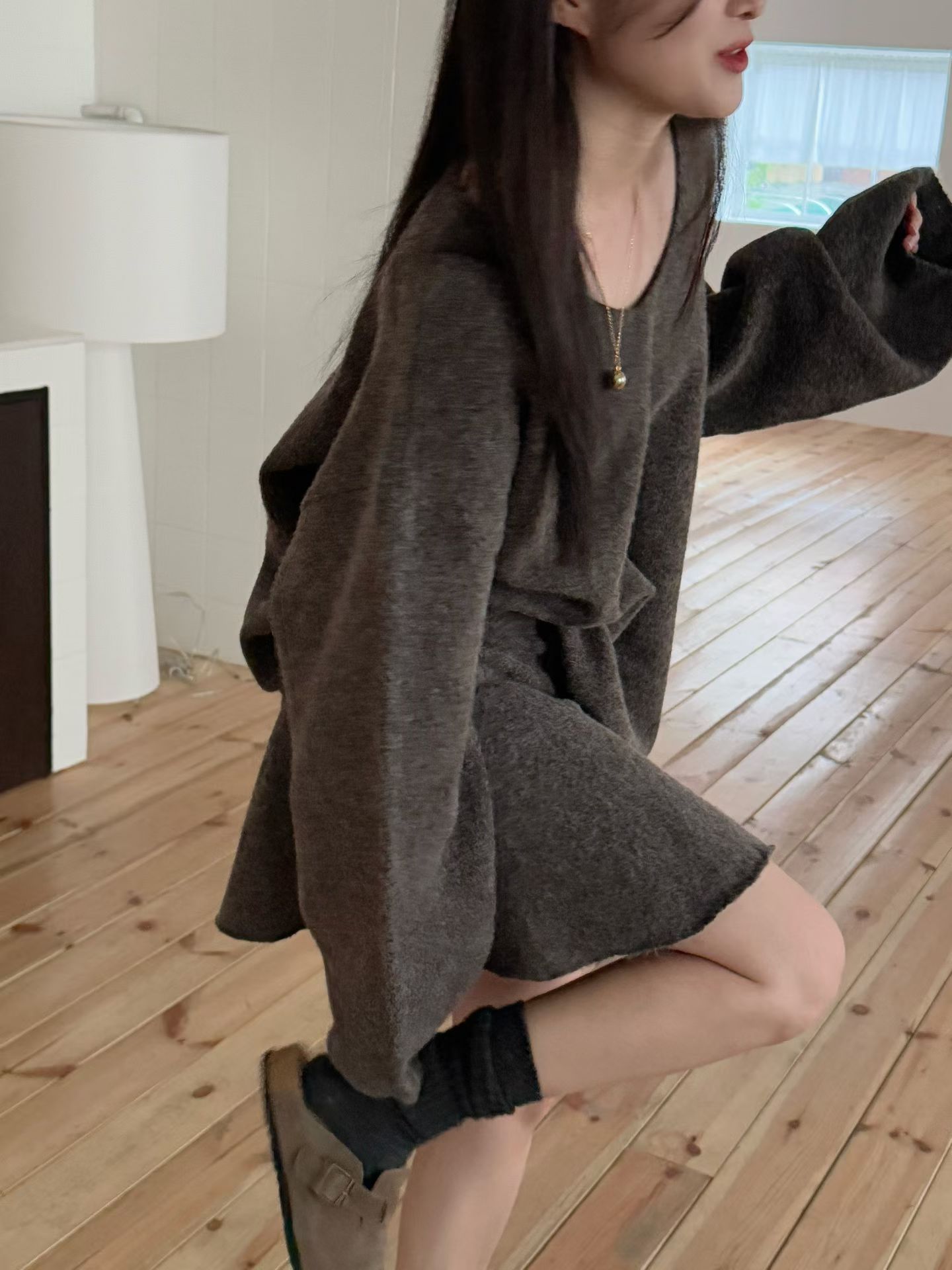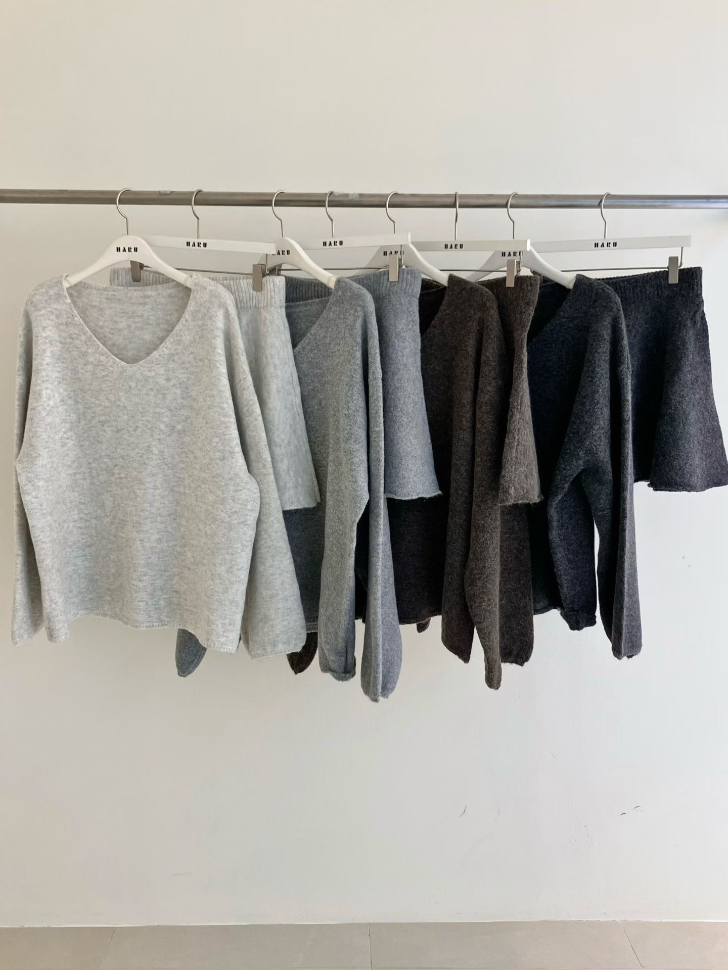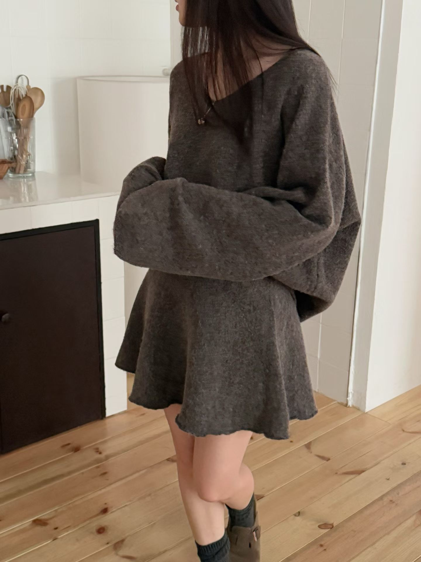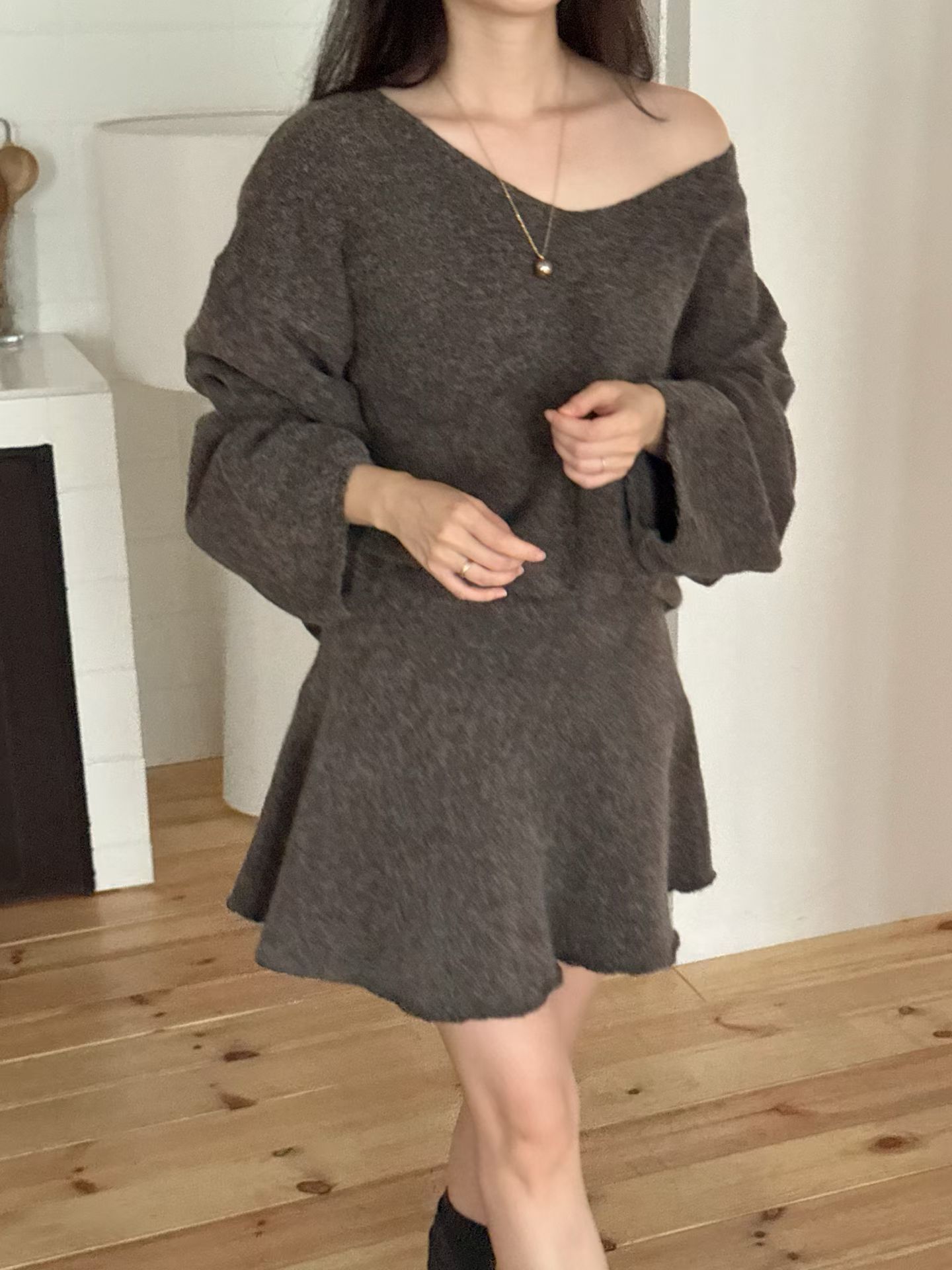 素色V領寬鬆針織衫+針織短裙SET