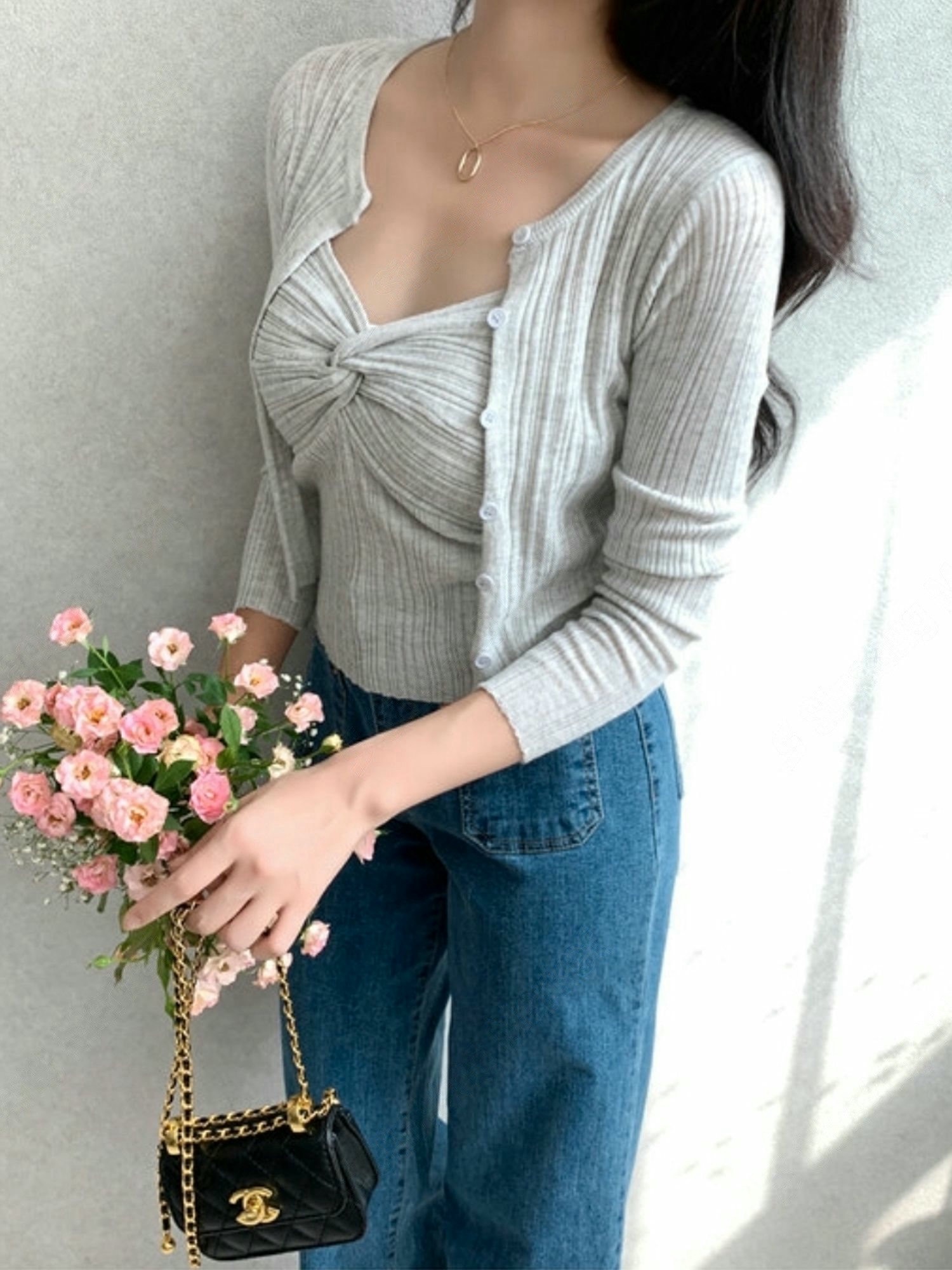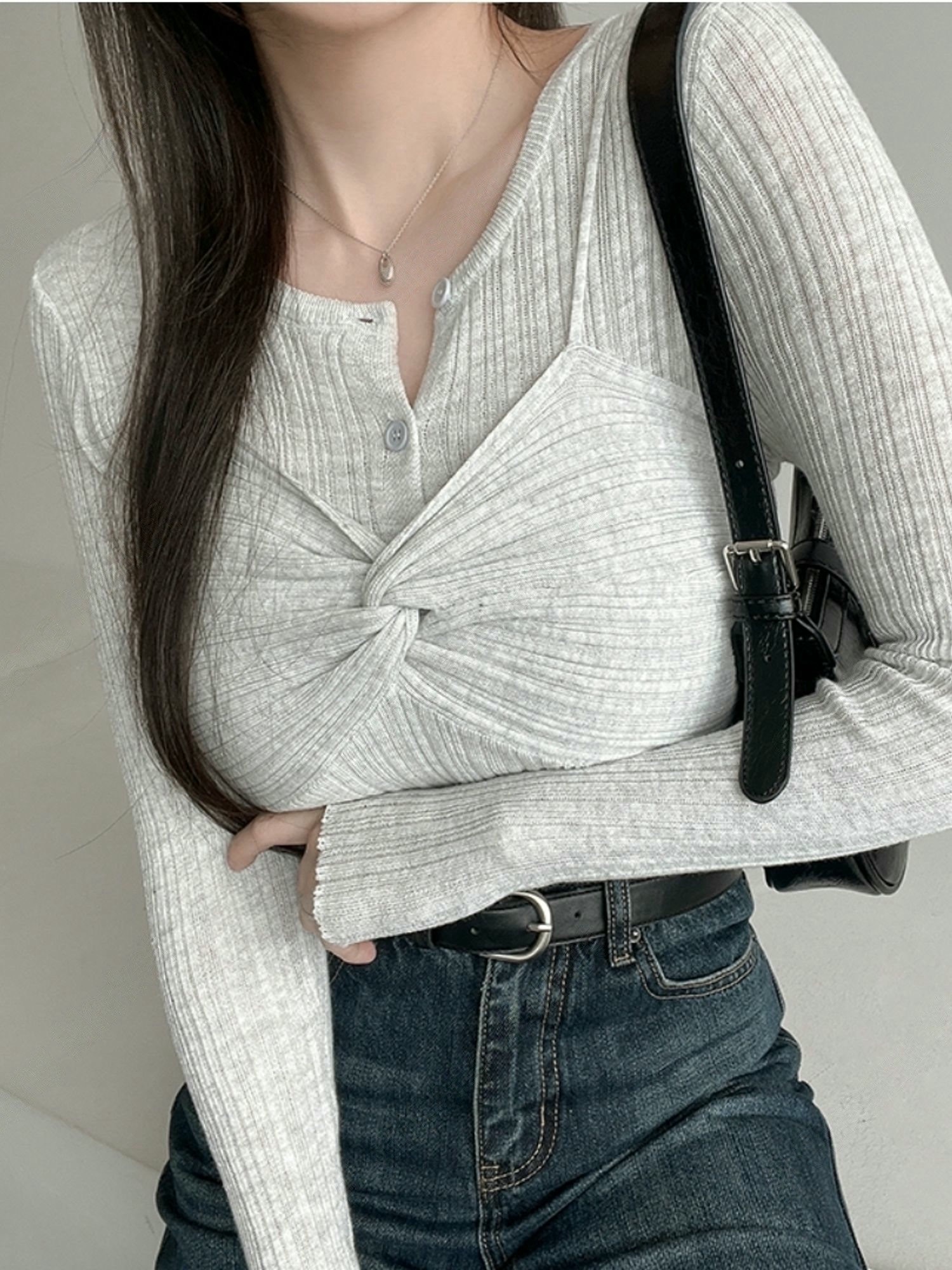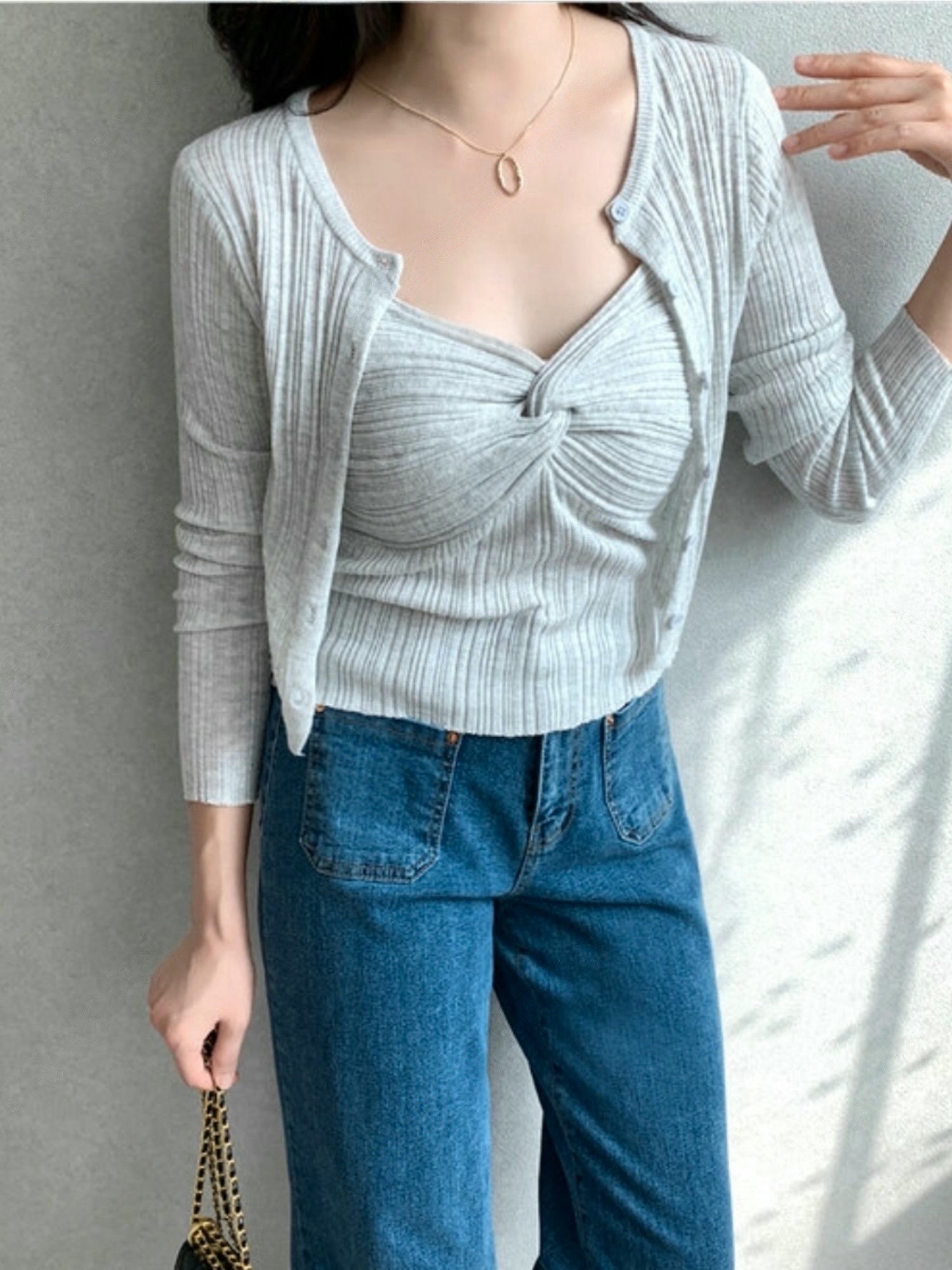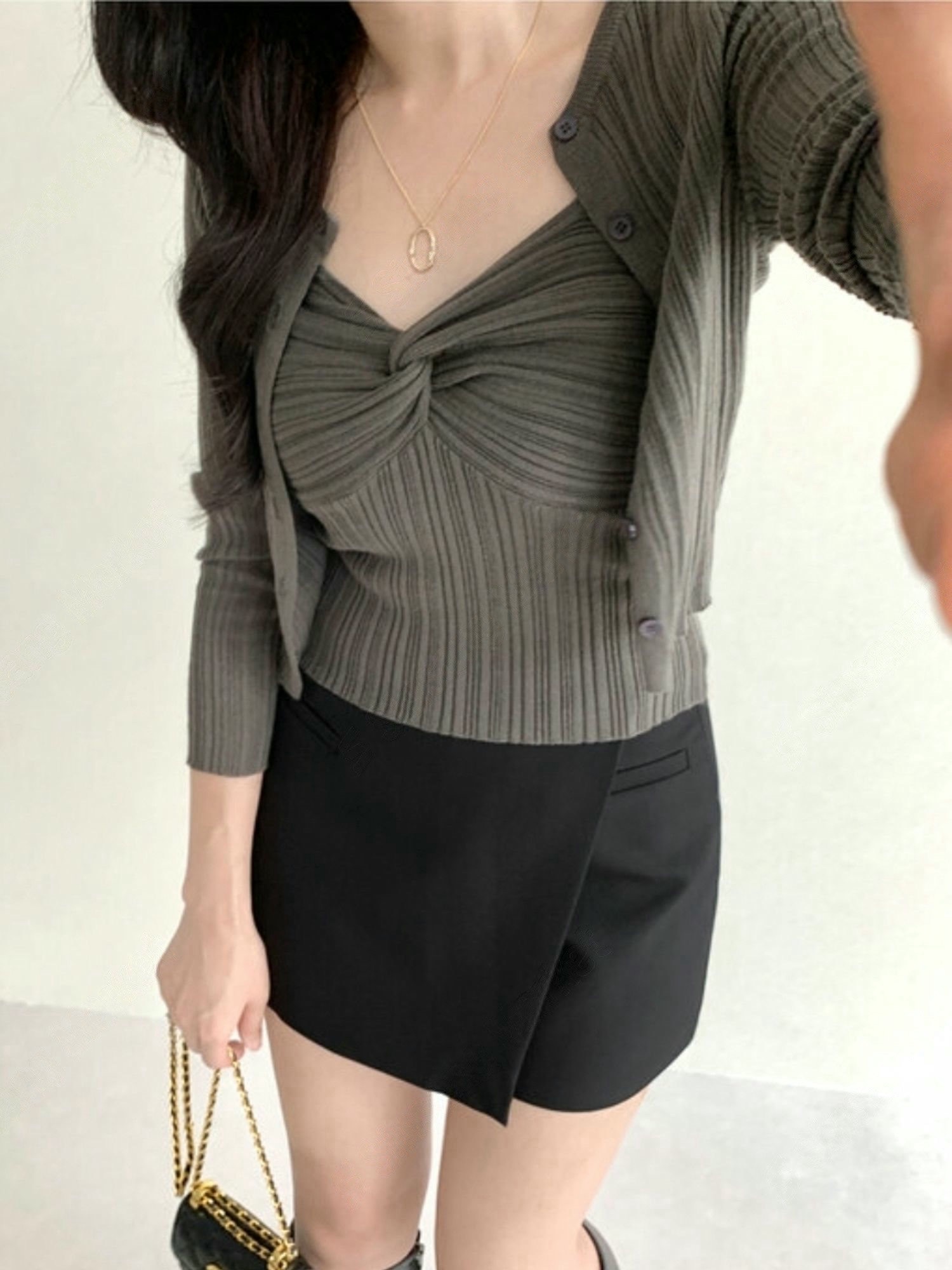 兩穿細坑條排釦罩衫+扭結背心SET