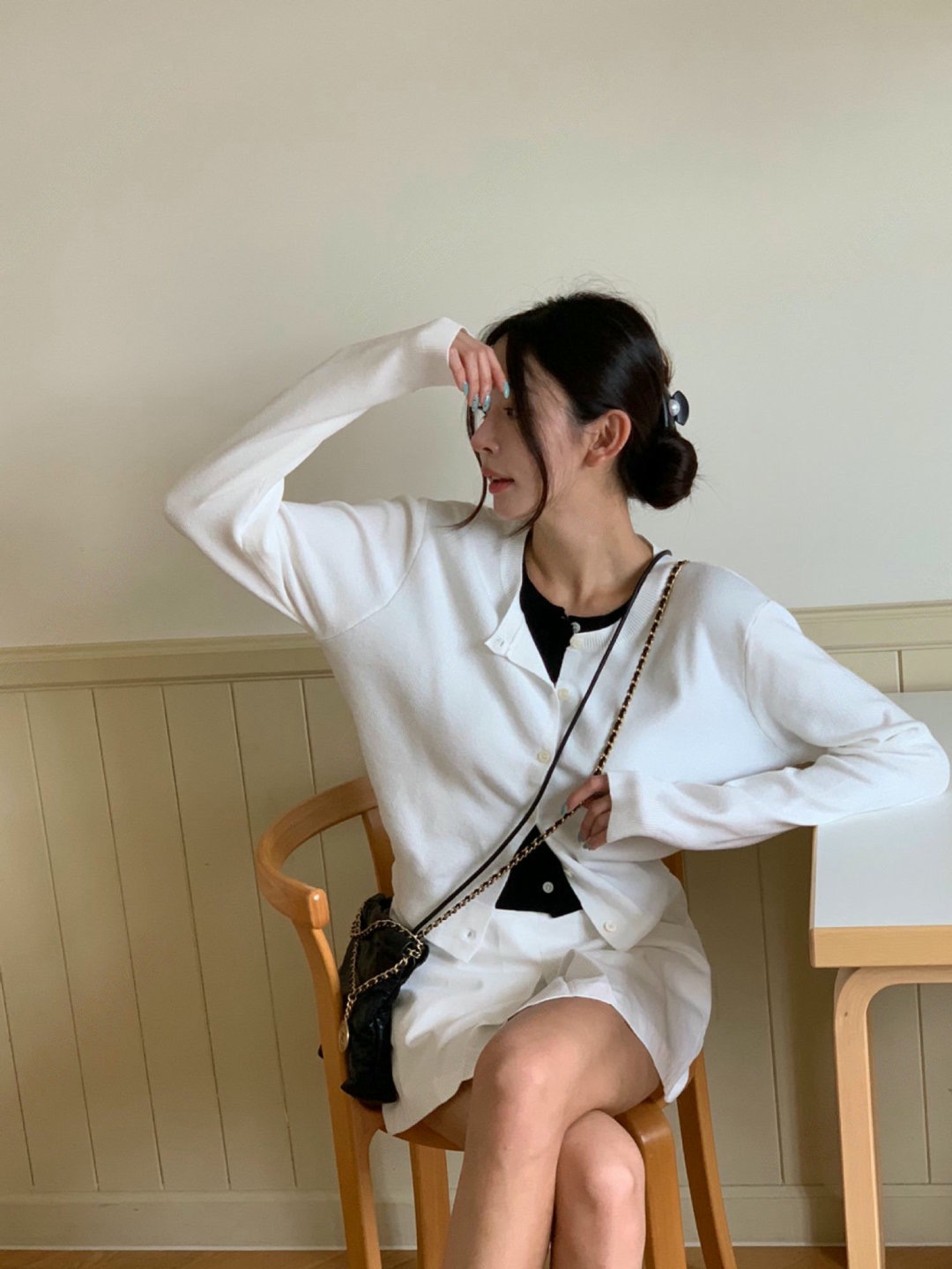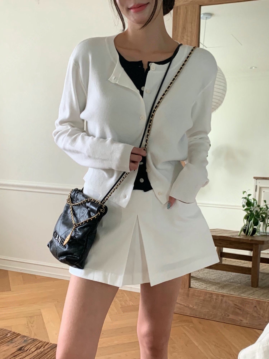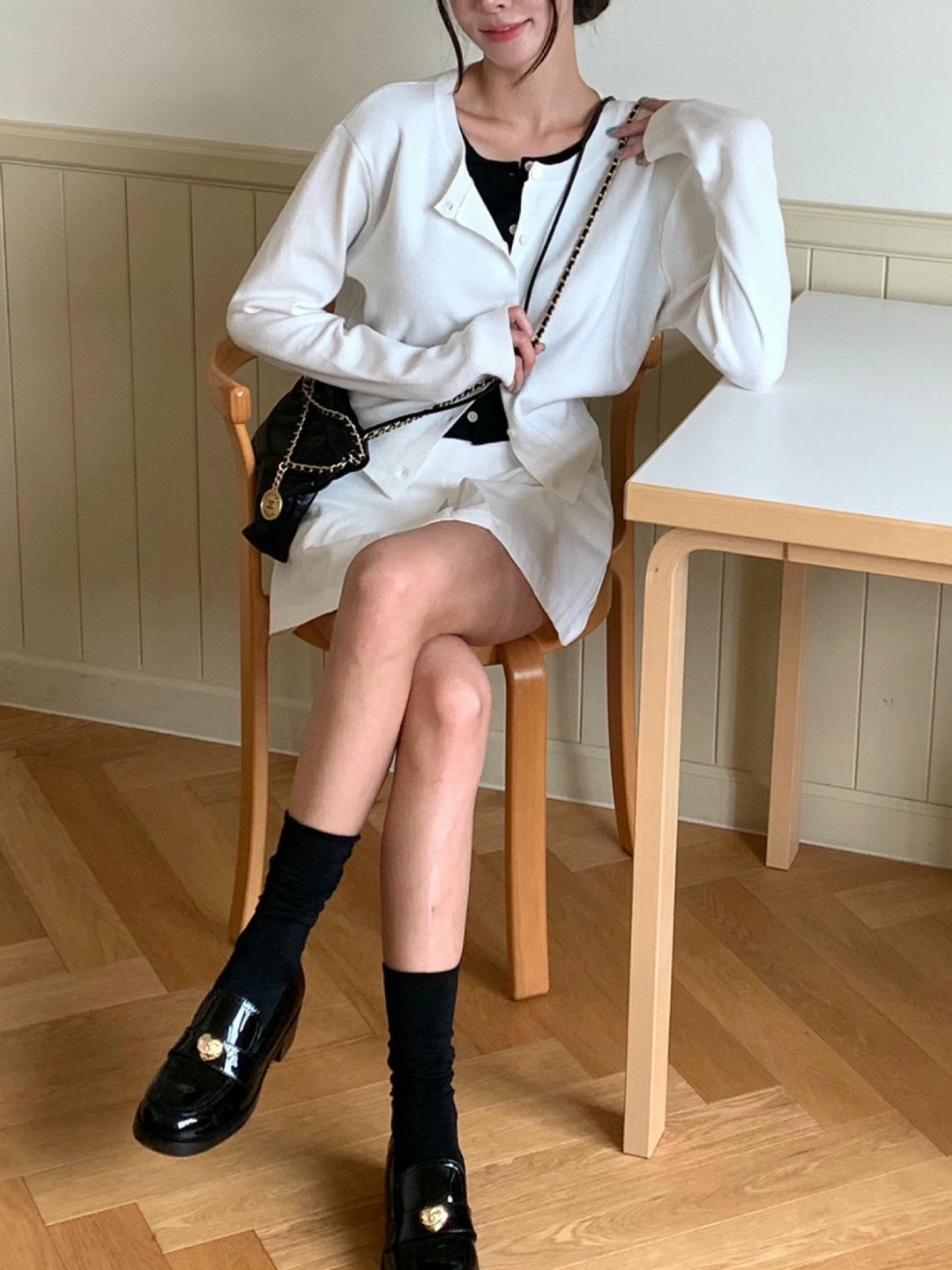 短毛圓領排釦針織衫+鬆緊A字短裙SET