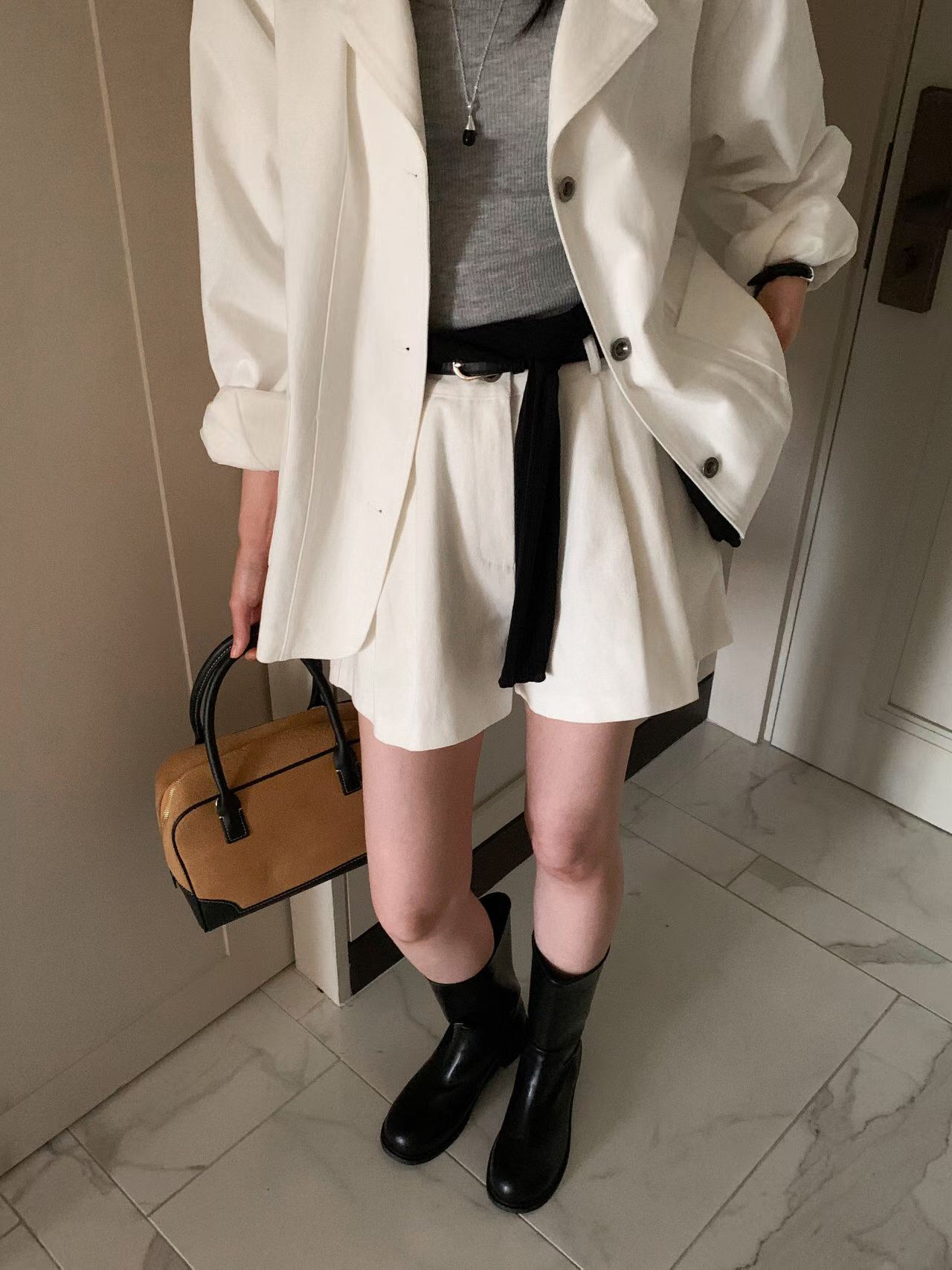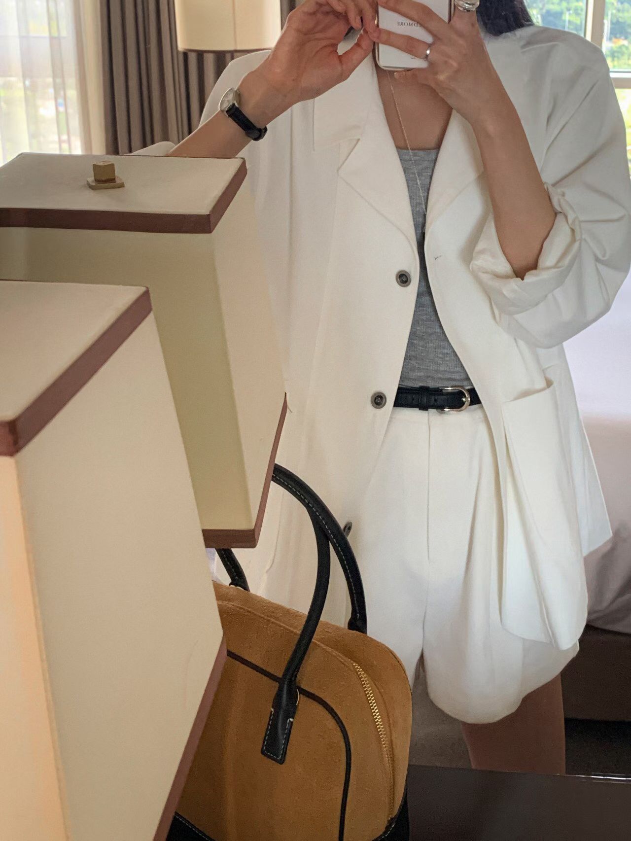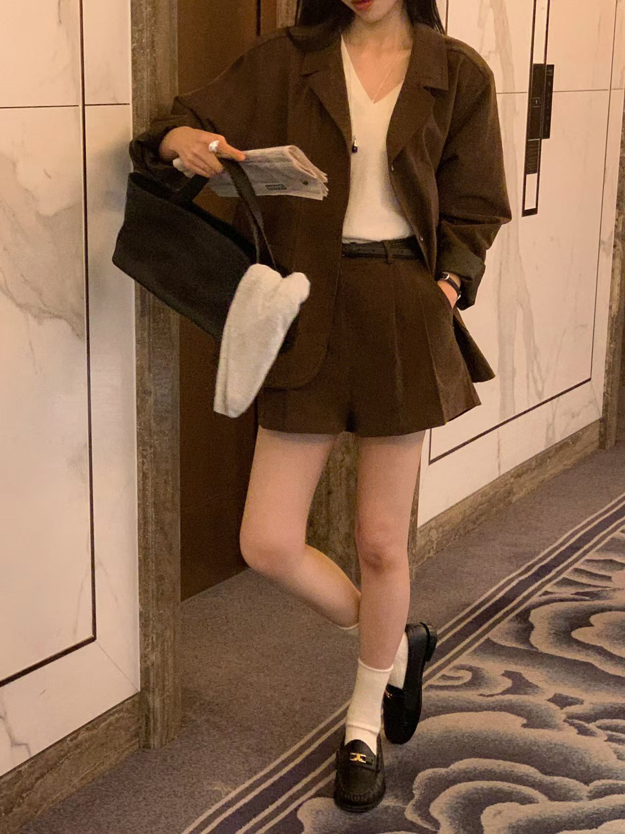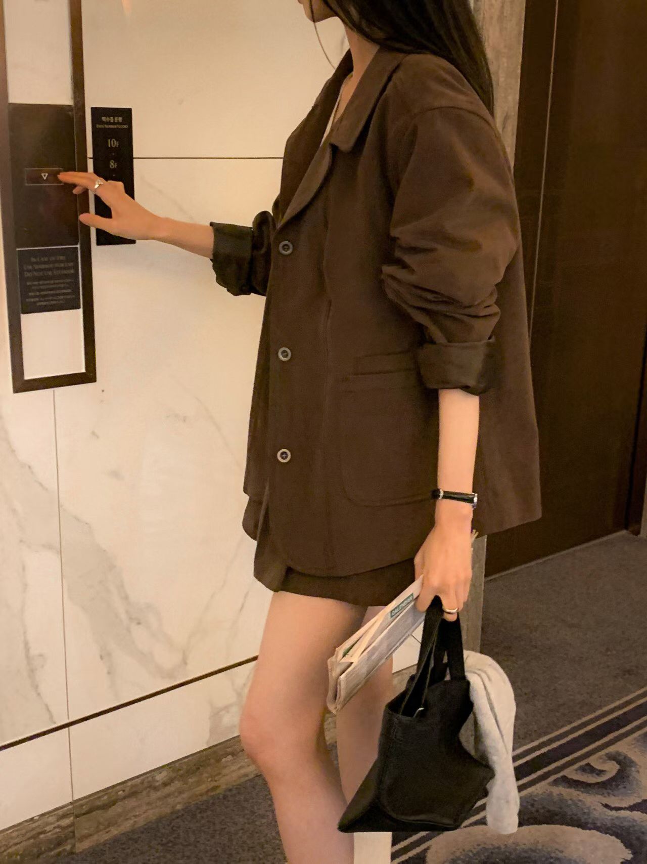 墊肩雙口袋西裝外套+斜切開衩短褲裙SET(可拆賣)