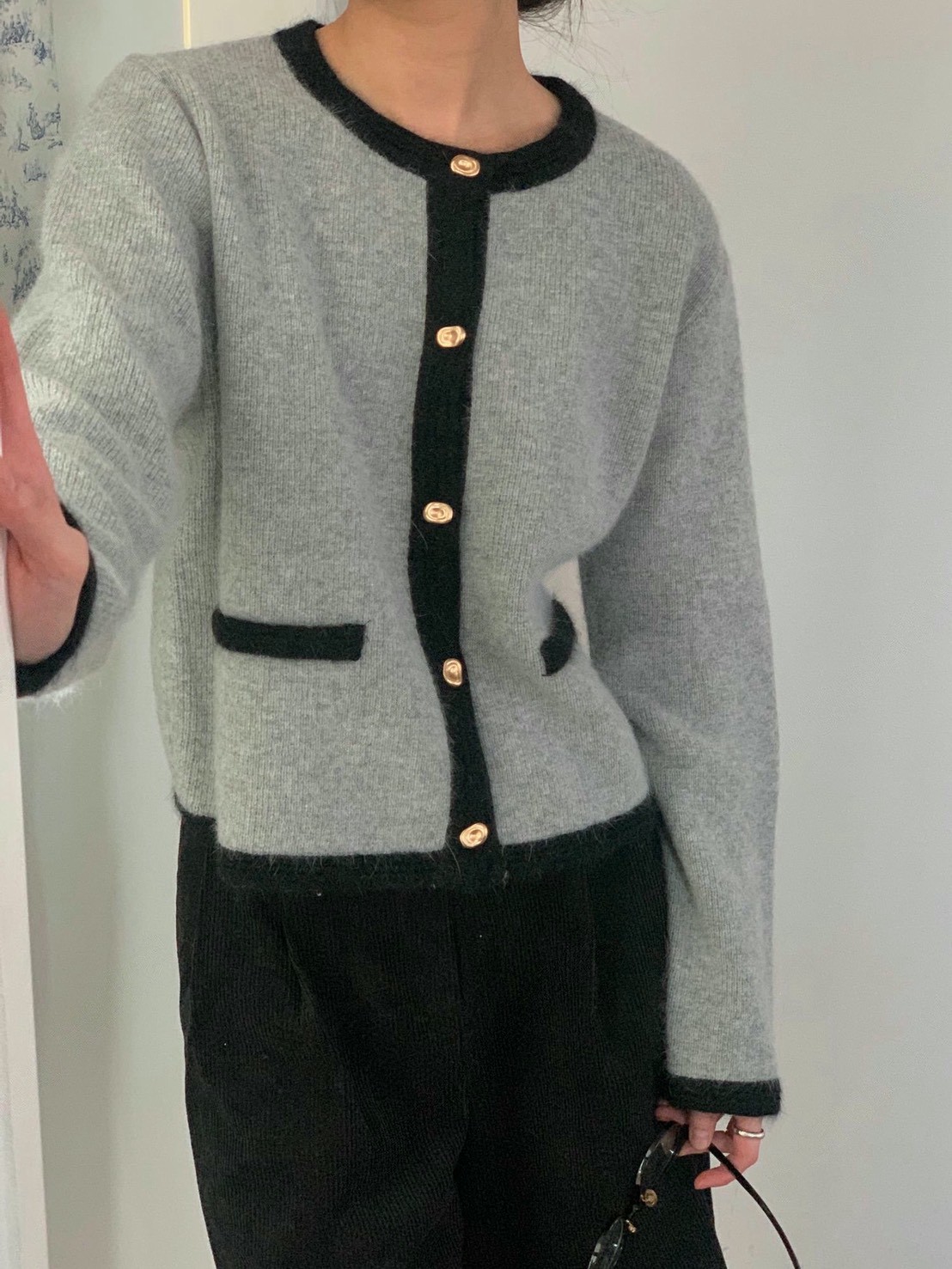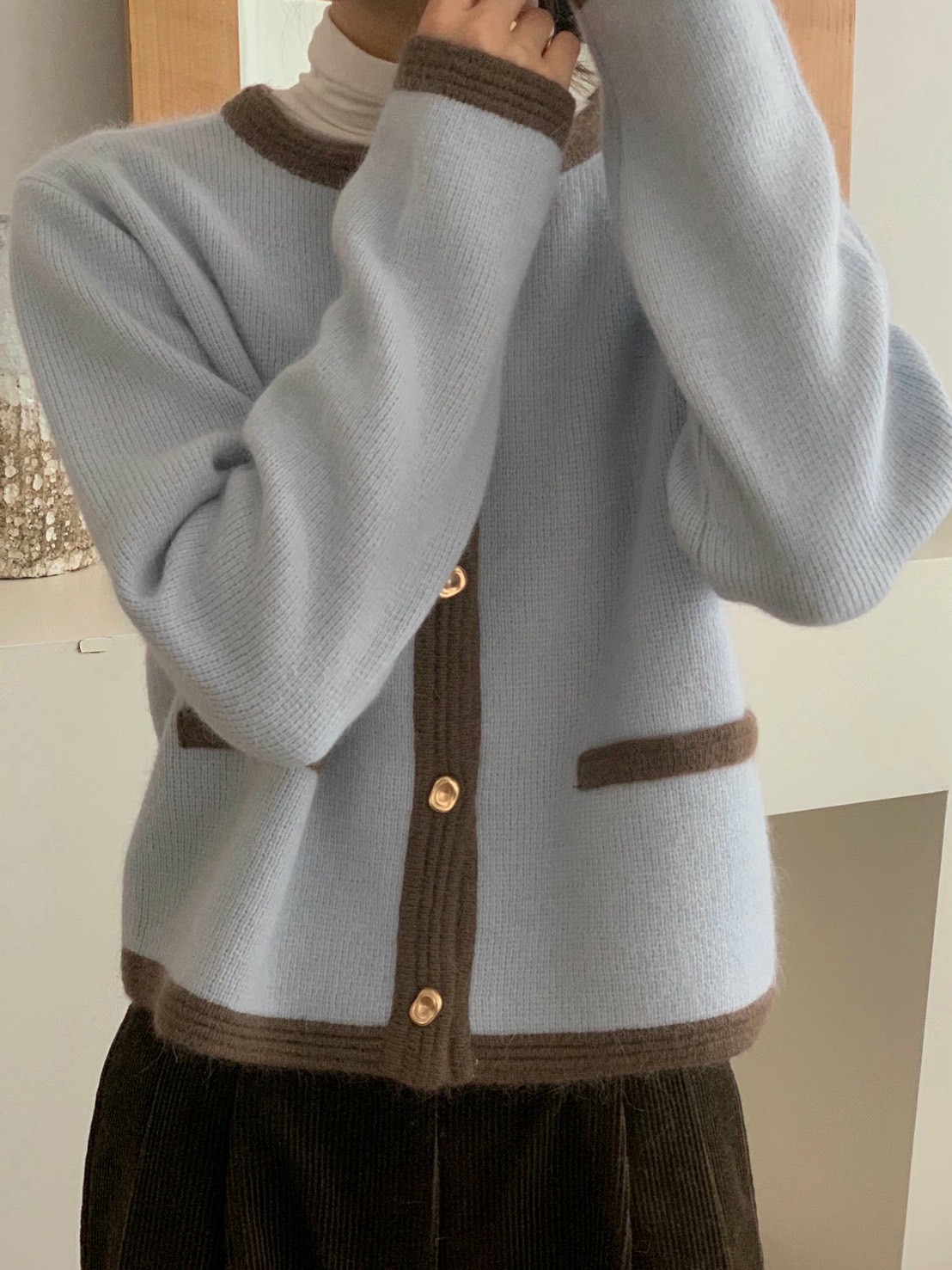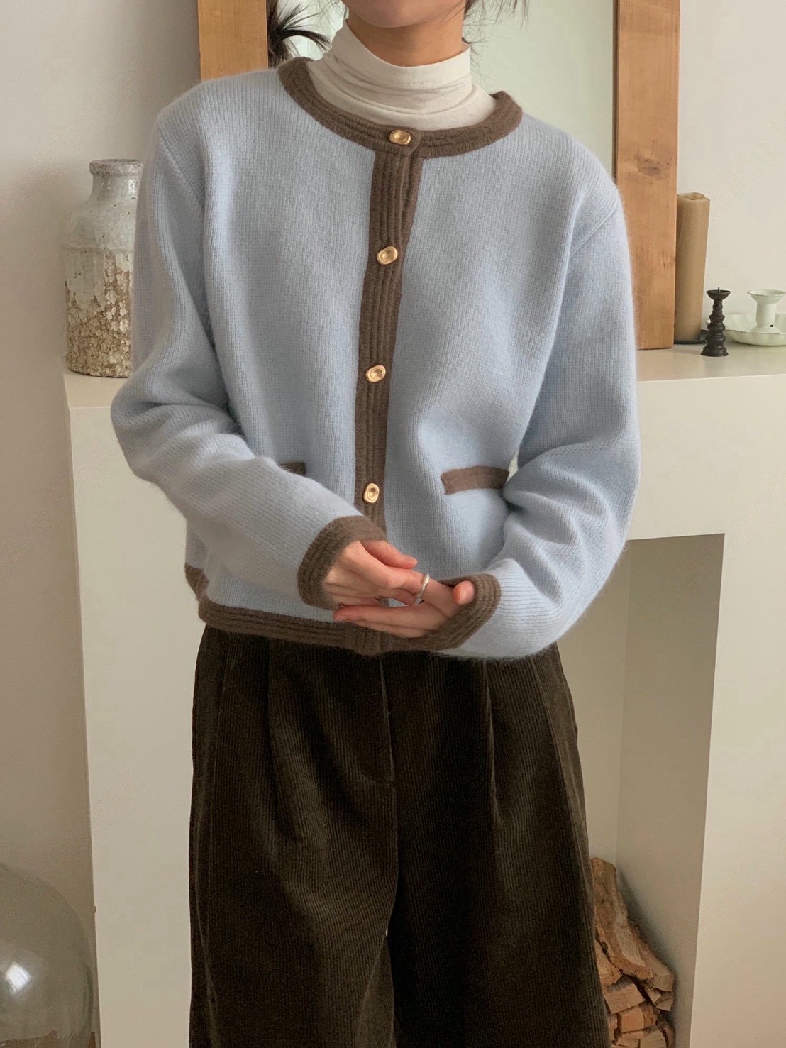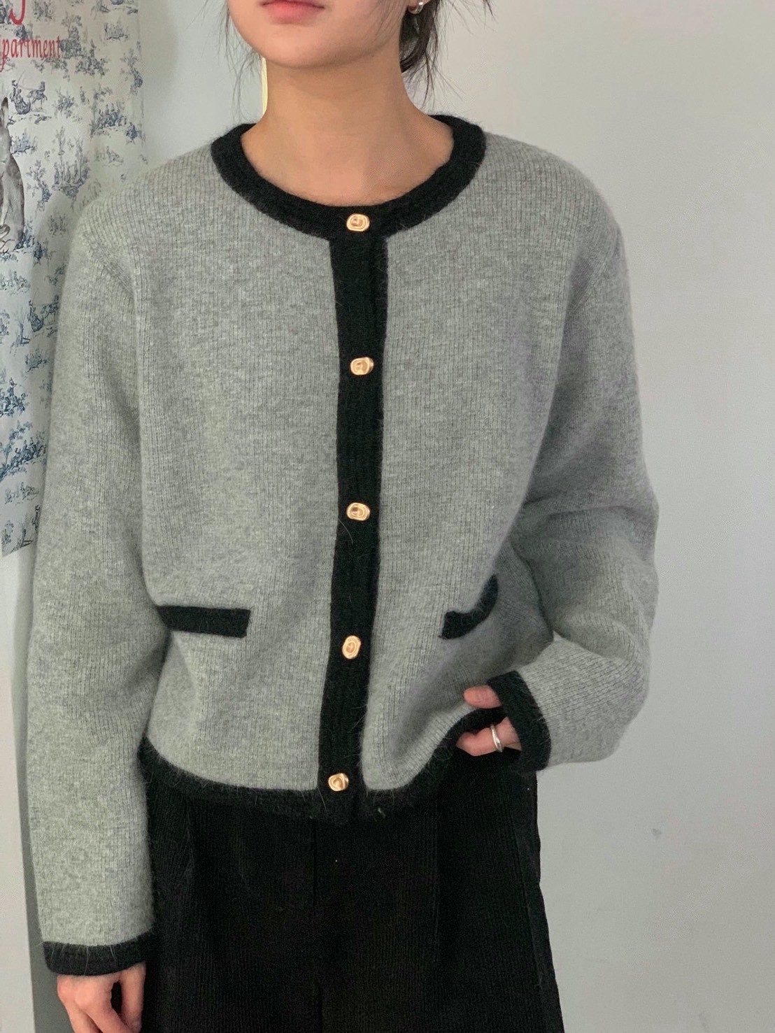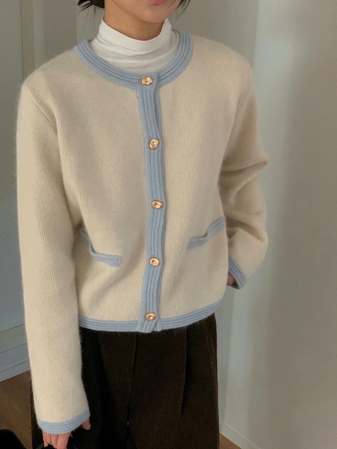 圓領撞色滾邊金釦毛款針織衣