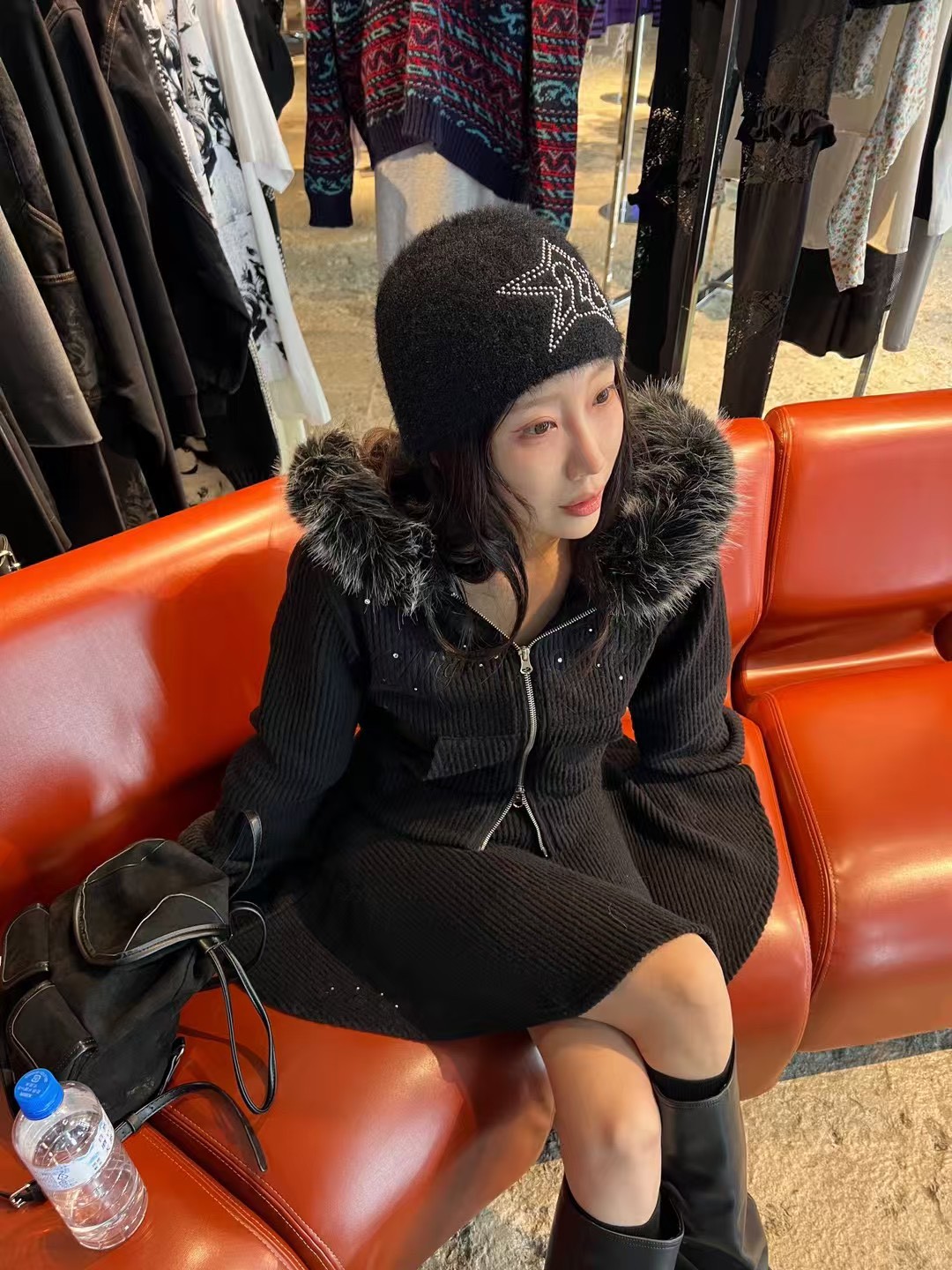 雙向拉鍊壓線連帽針織外套+落地長褲SET