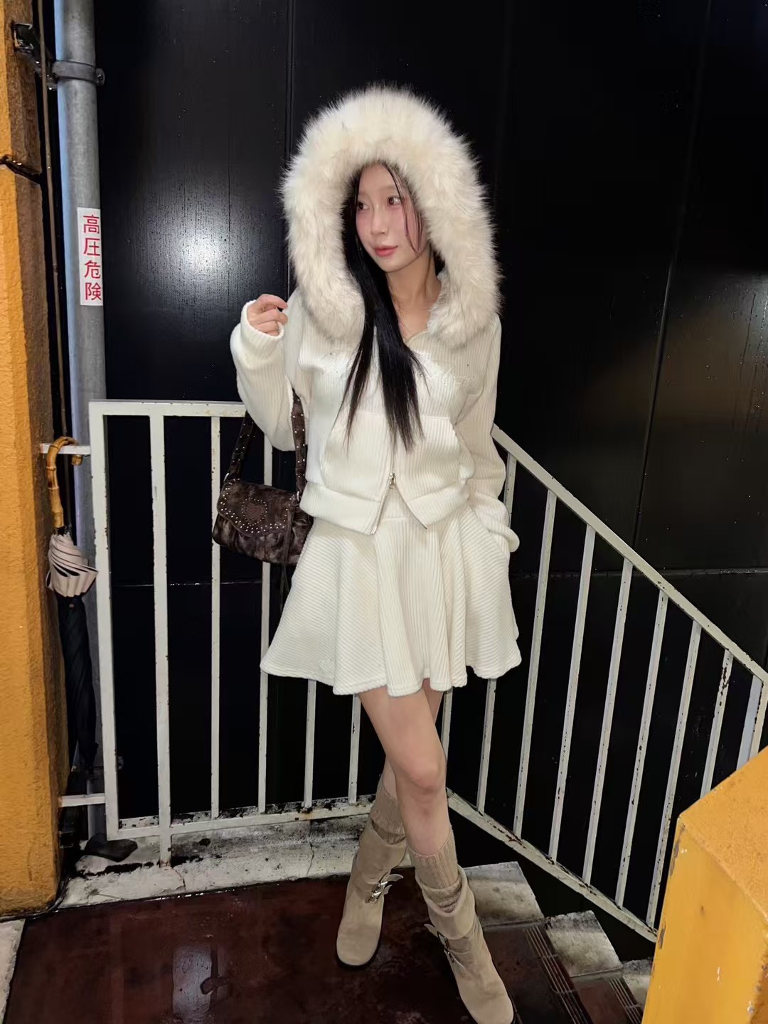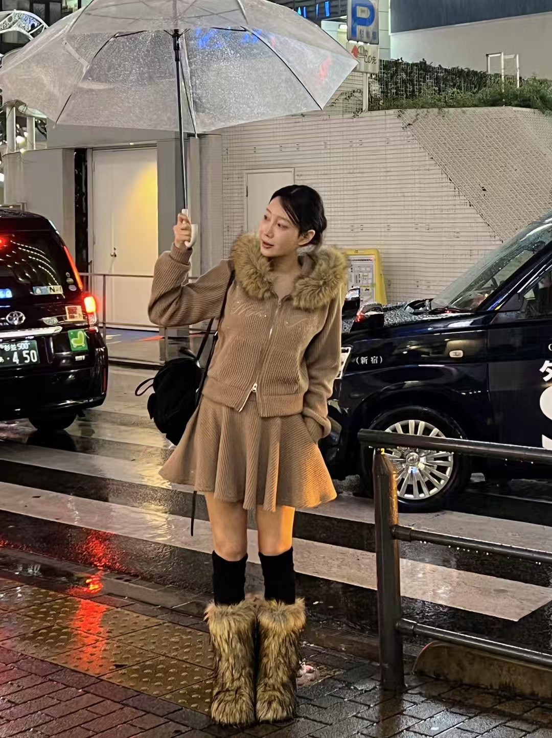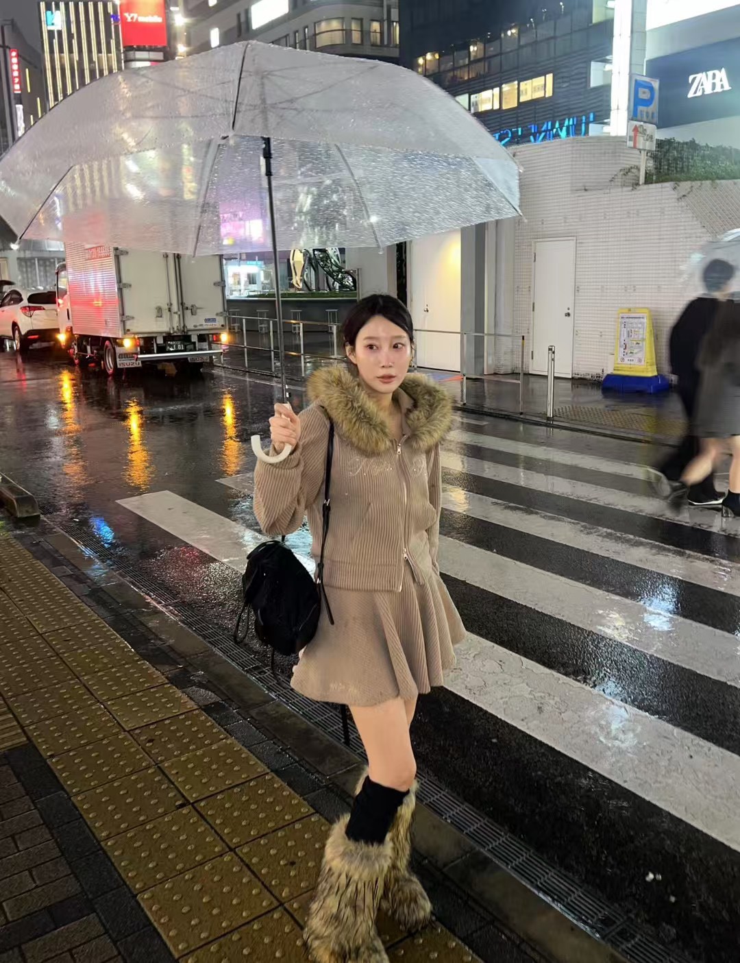 拼接皮革口袋磨毛外套+壓摺短褲裙SET(可拆買)