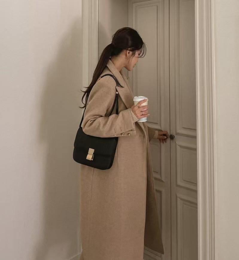 口袋雙排金扣羊毛50%長版大衣(附綁帶)