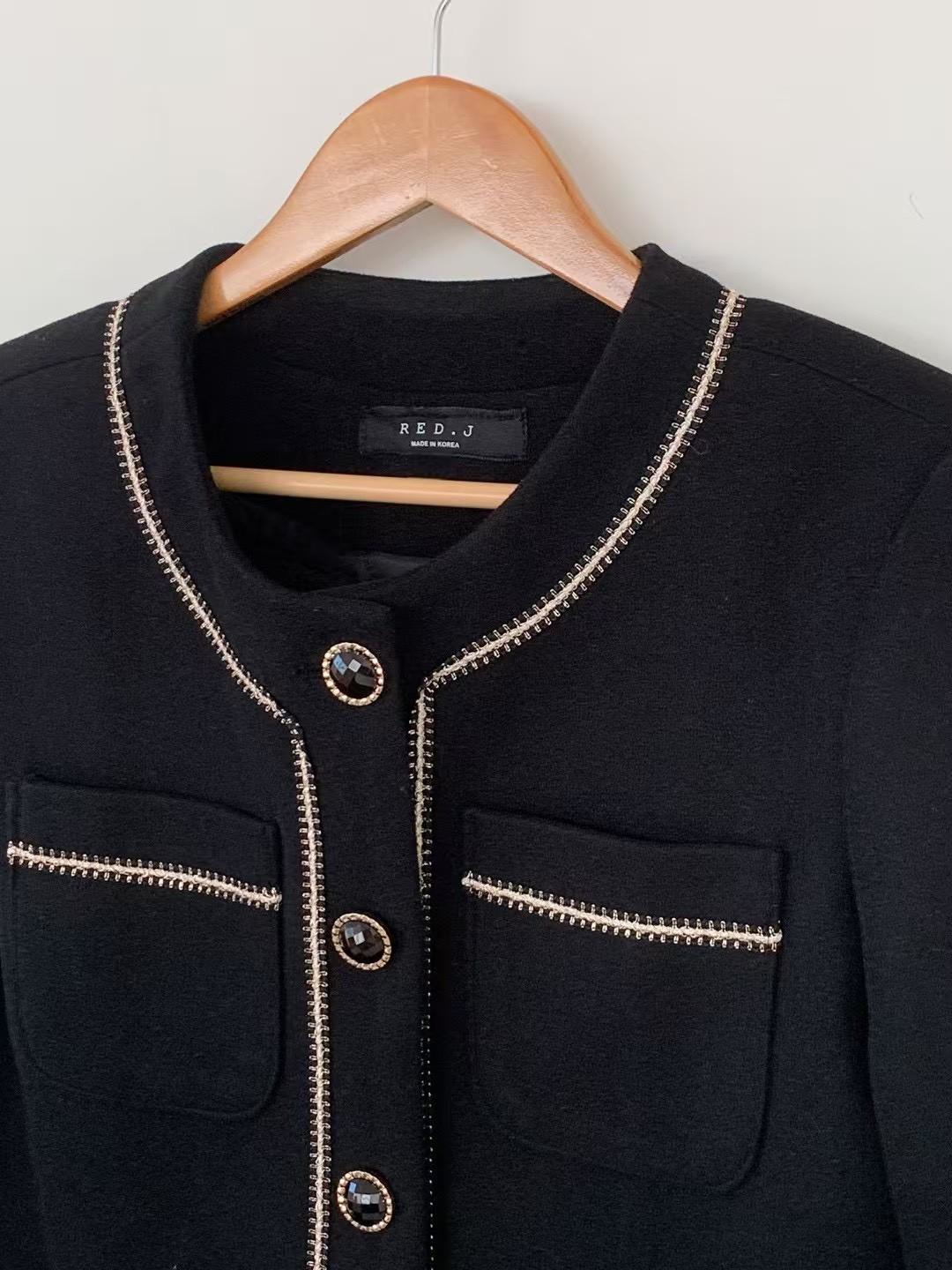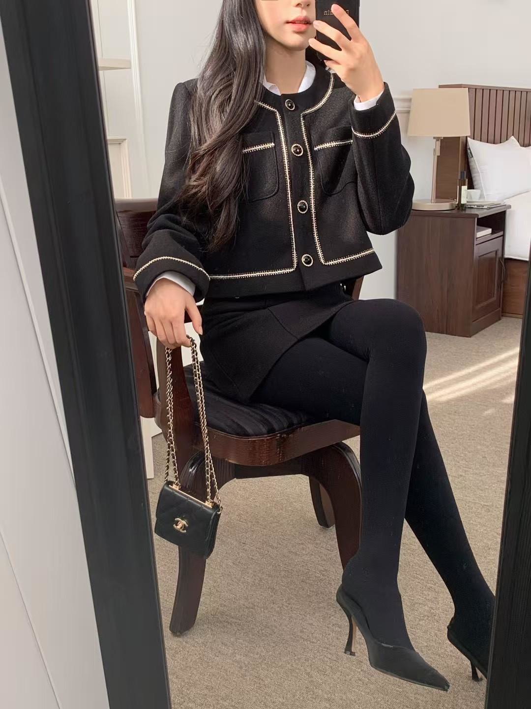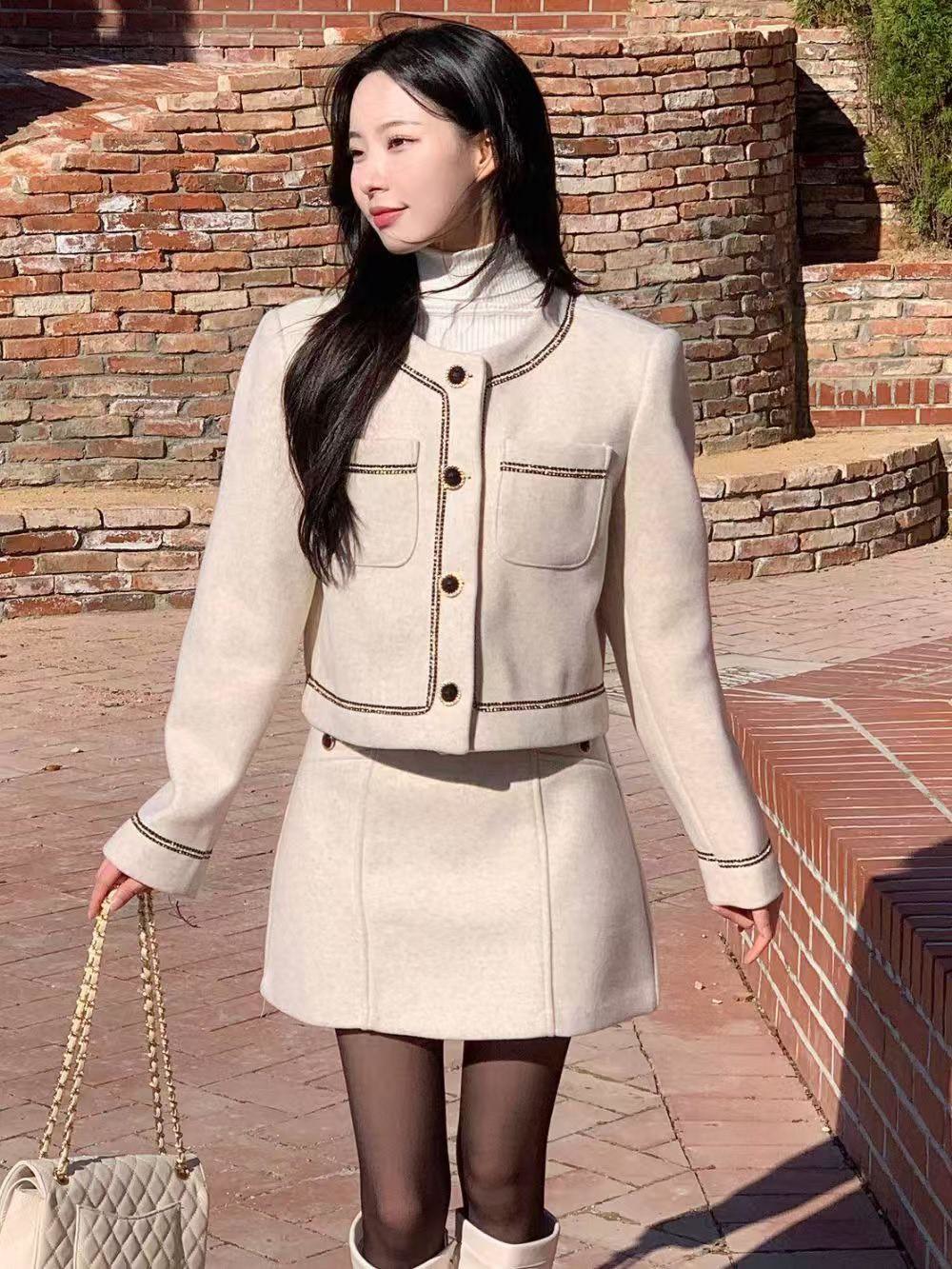 三件套|滾邊短袖針織衫+排釦外套+短裙SET