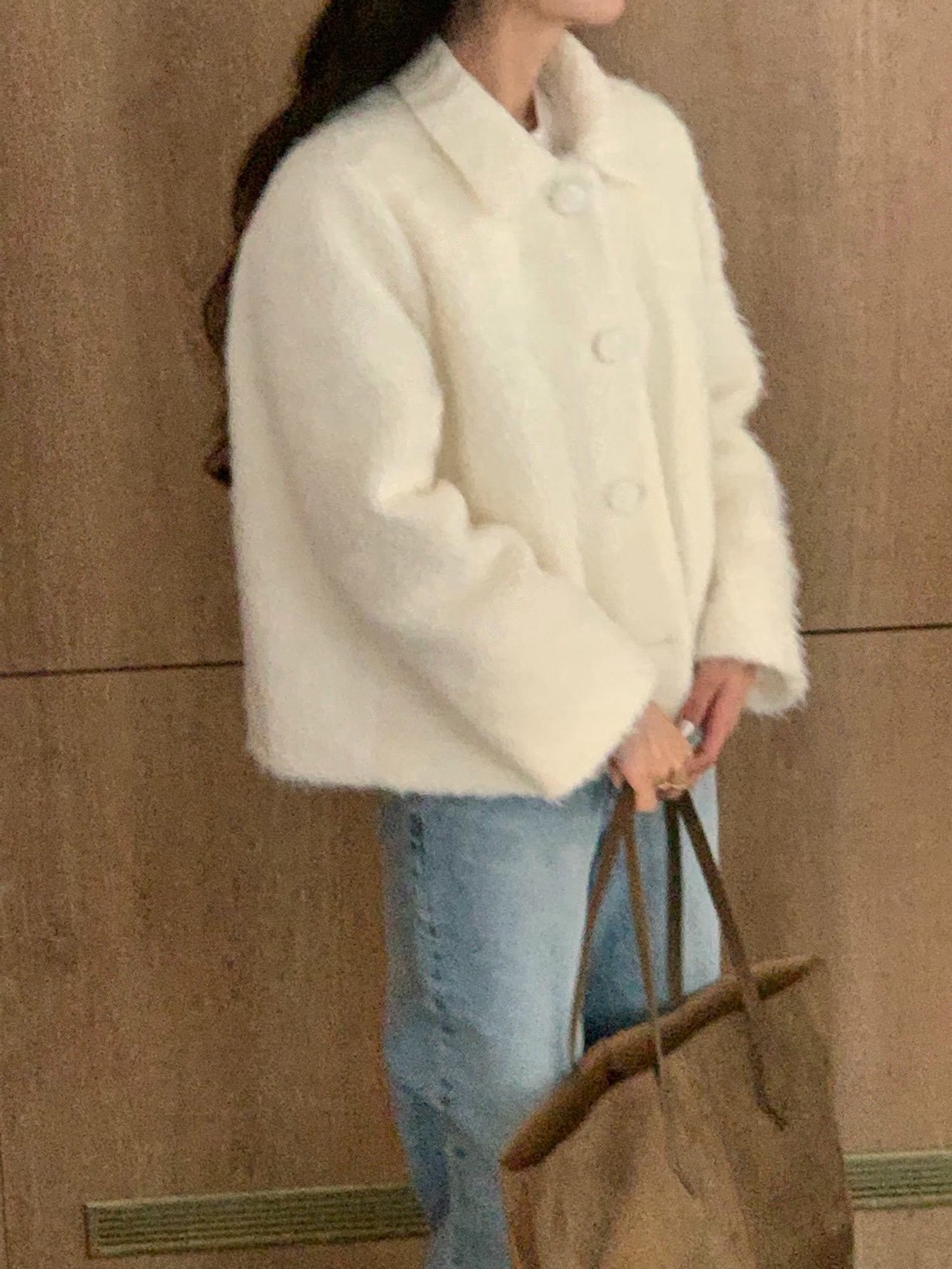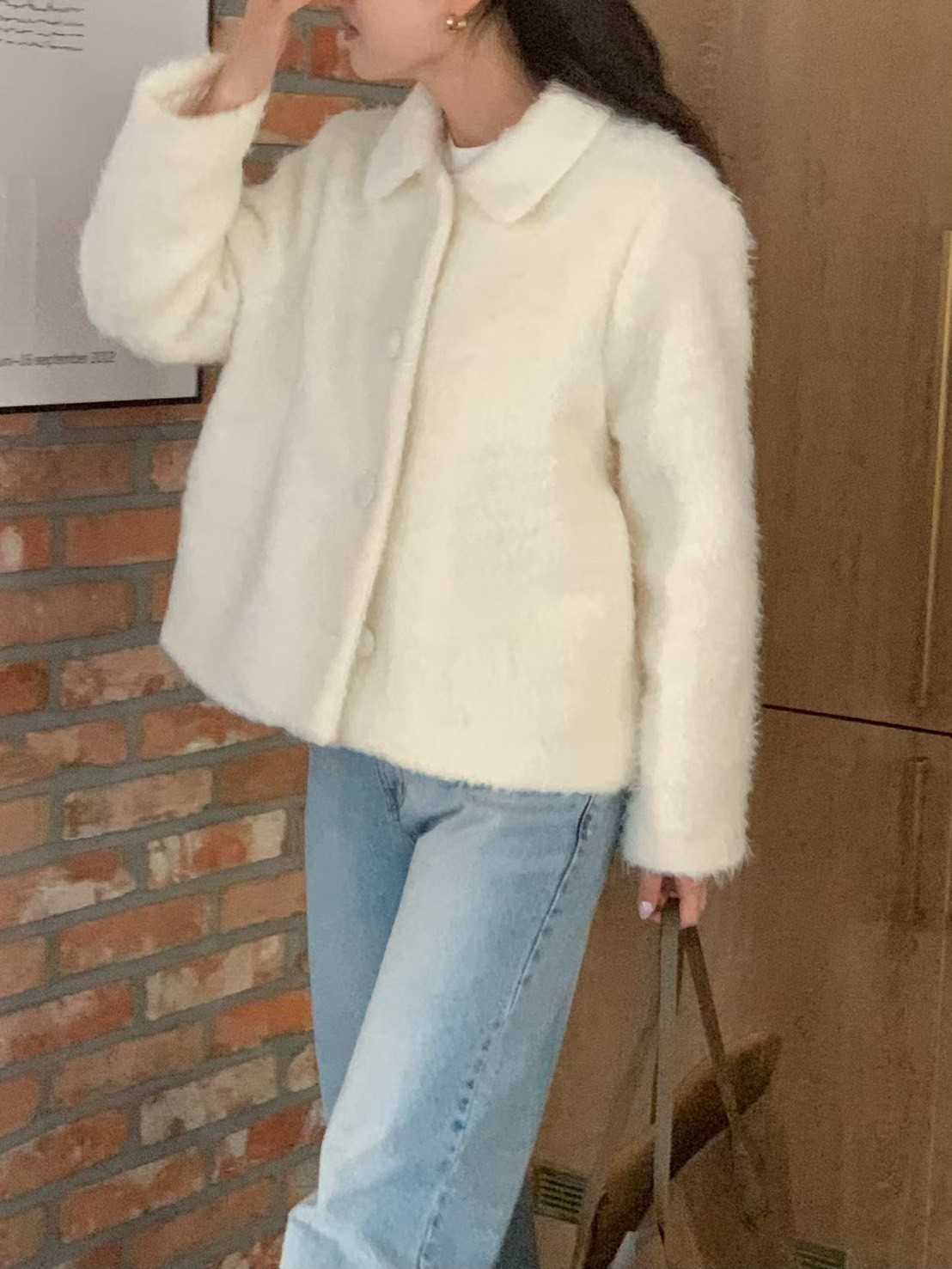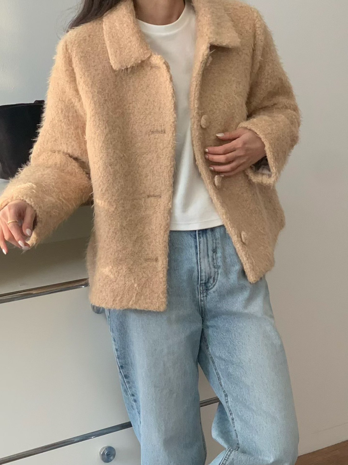 兔毛混馬海毛金屬logo可高領外套