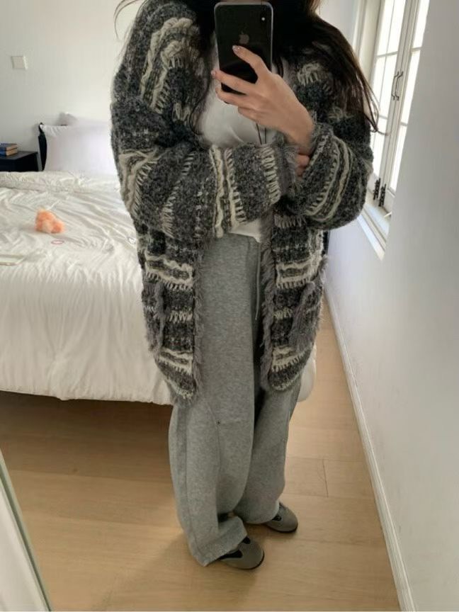 拼接襯衫領配色條紋粗勾針織衣