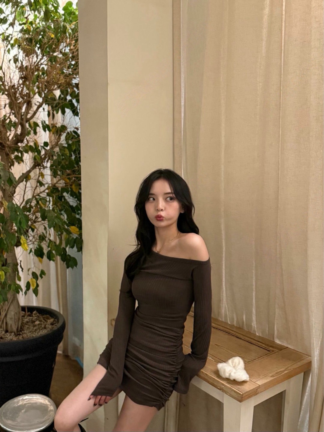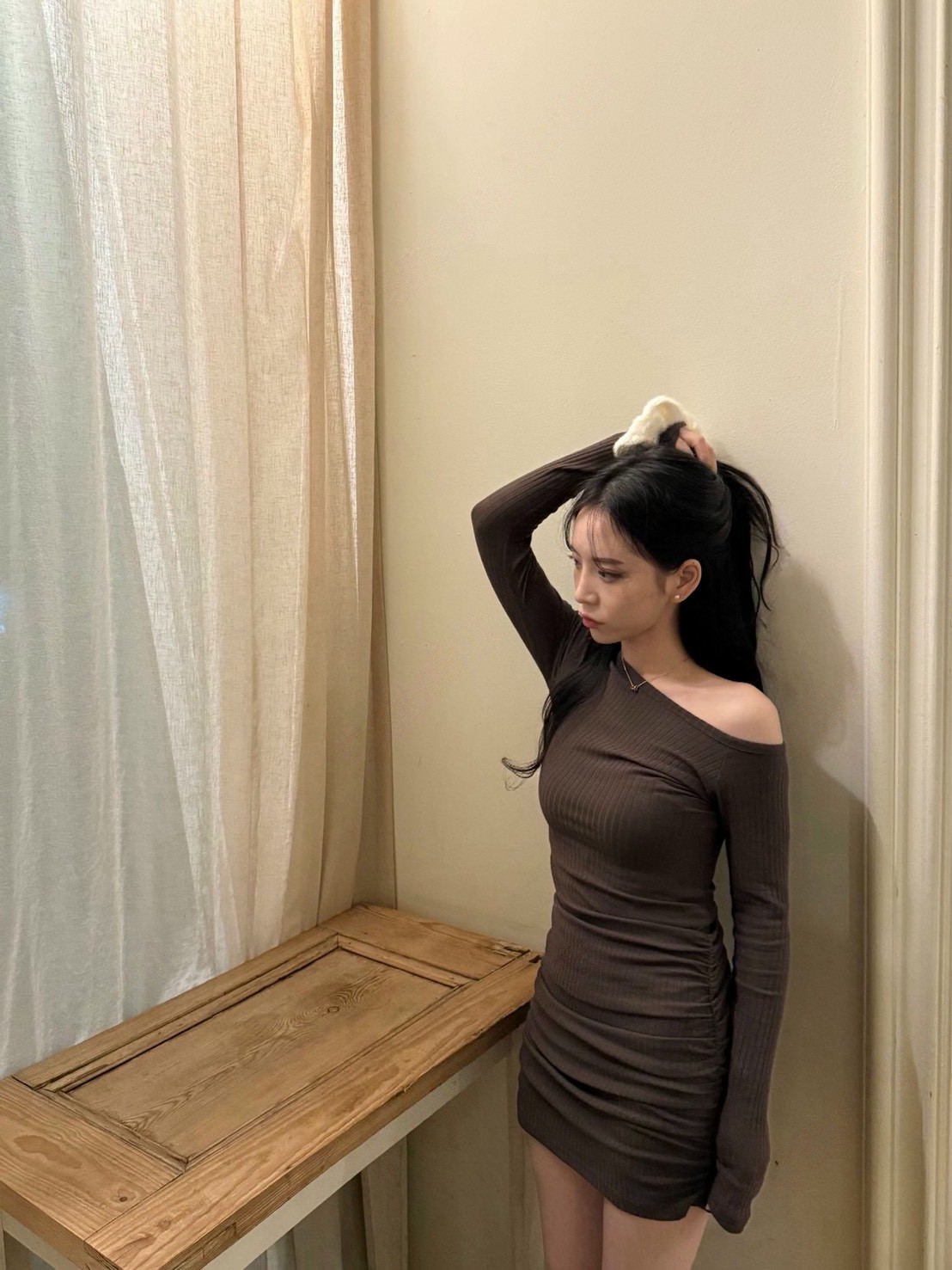 斜肩直坑紋彈力兩側抓皺短洋