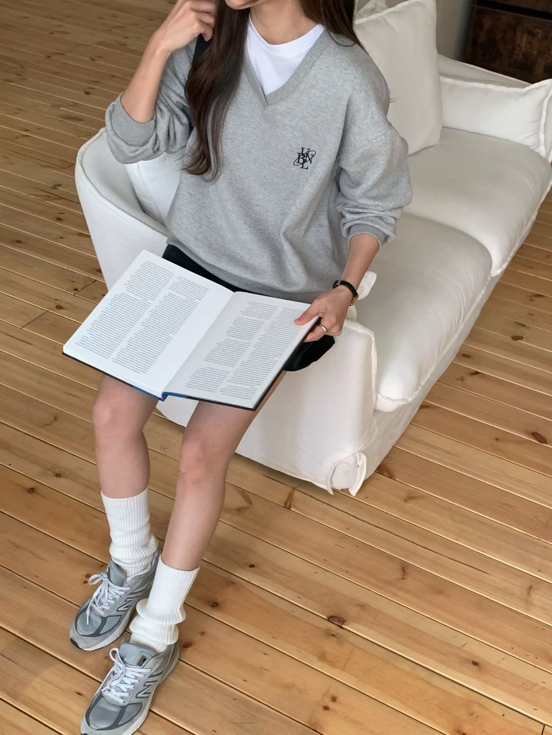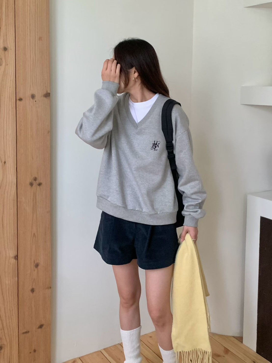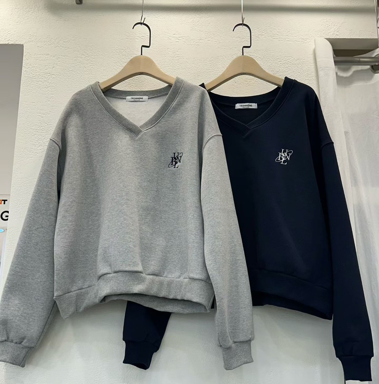 V領刺繡logo內刷毛大學T