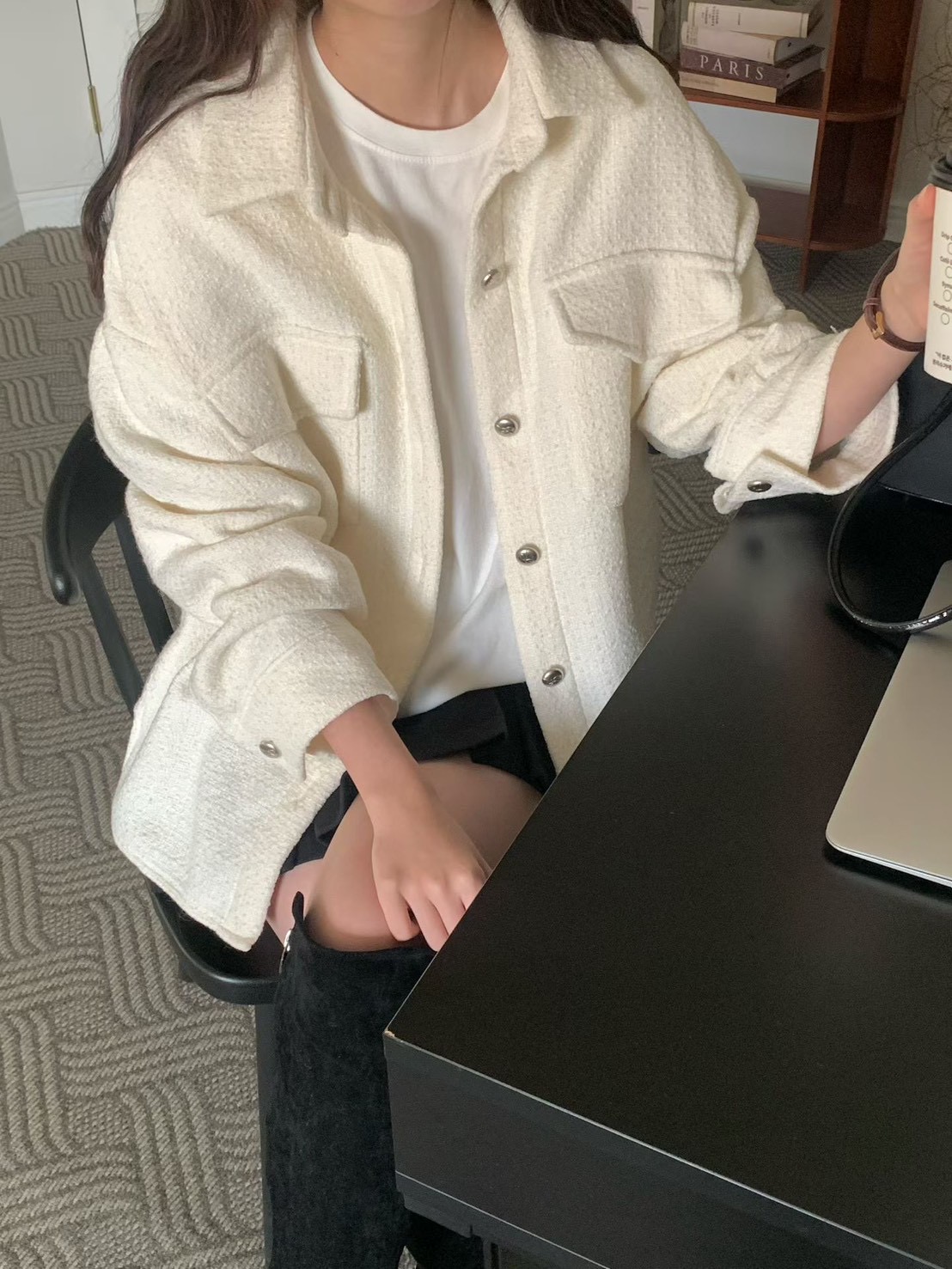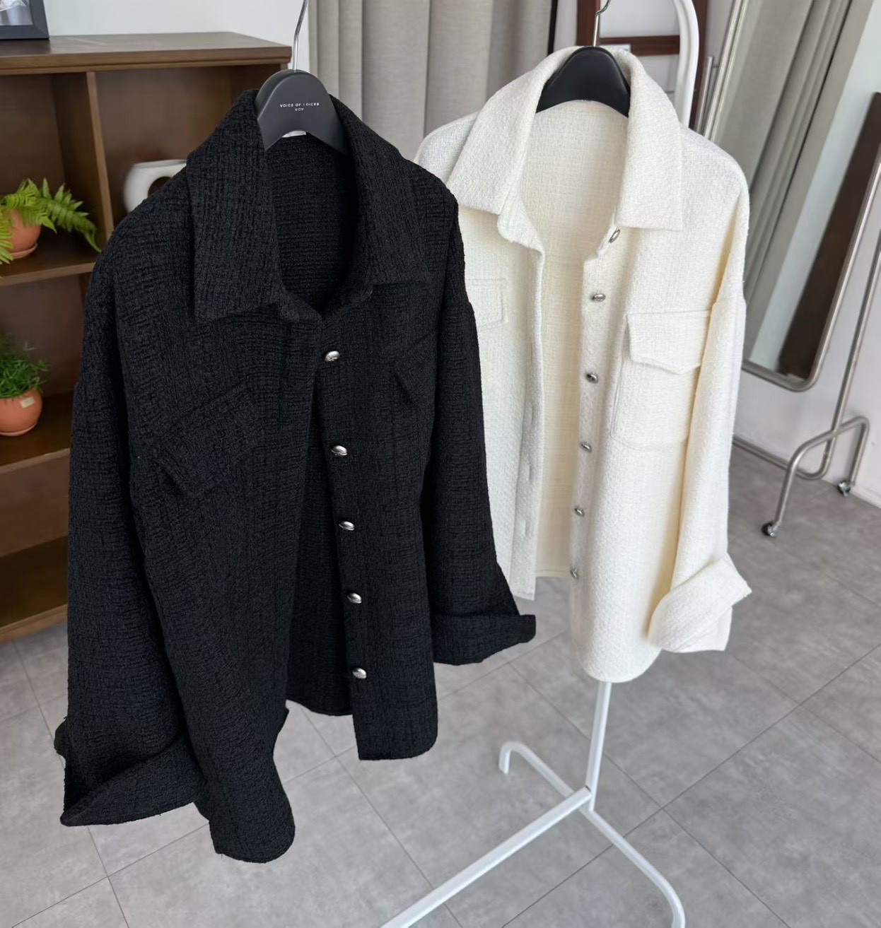 織紋銀釦雙口袋毛呢襯衫