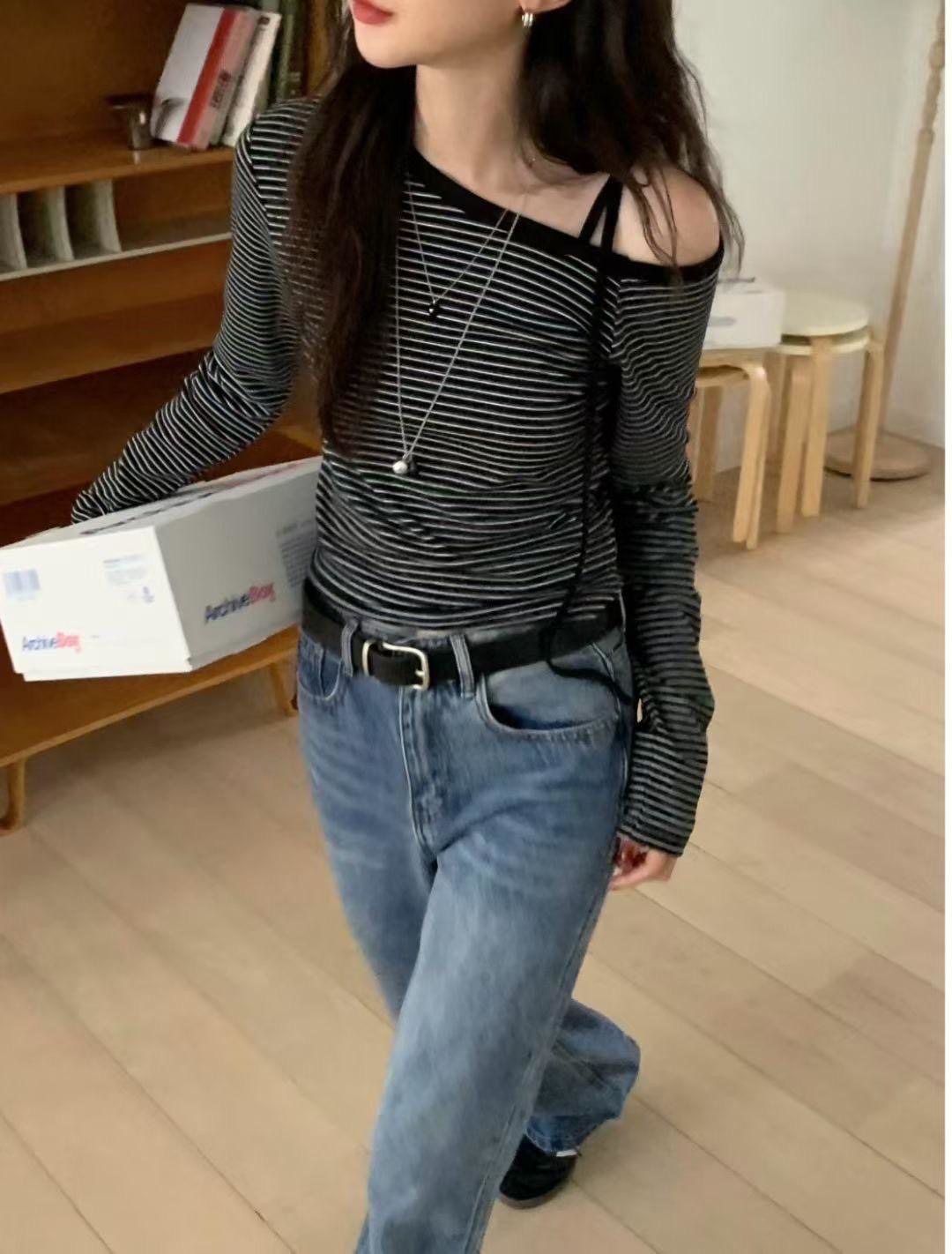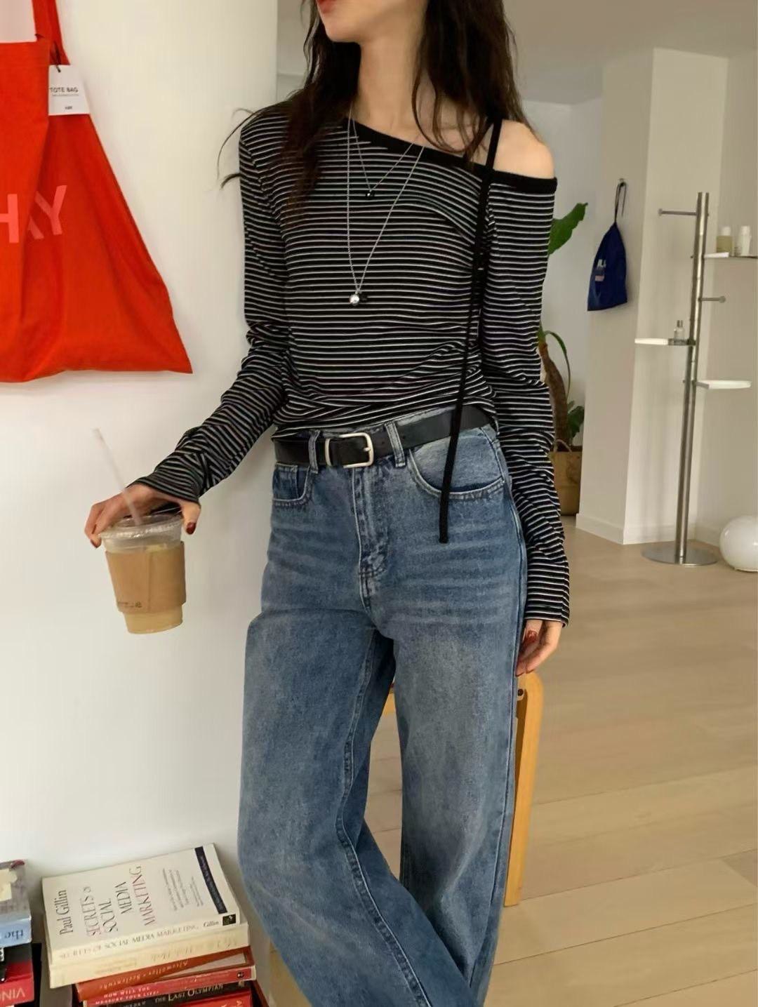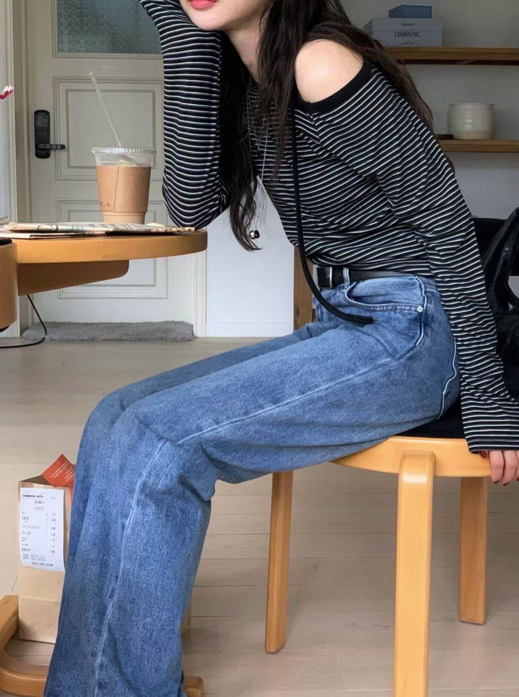 後口袋磨毛滾邊內刷薄毛直筒牛仔褲