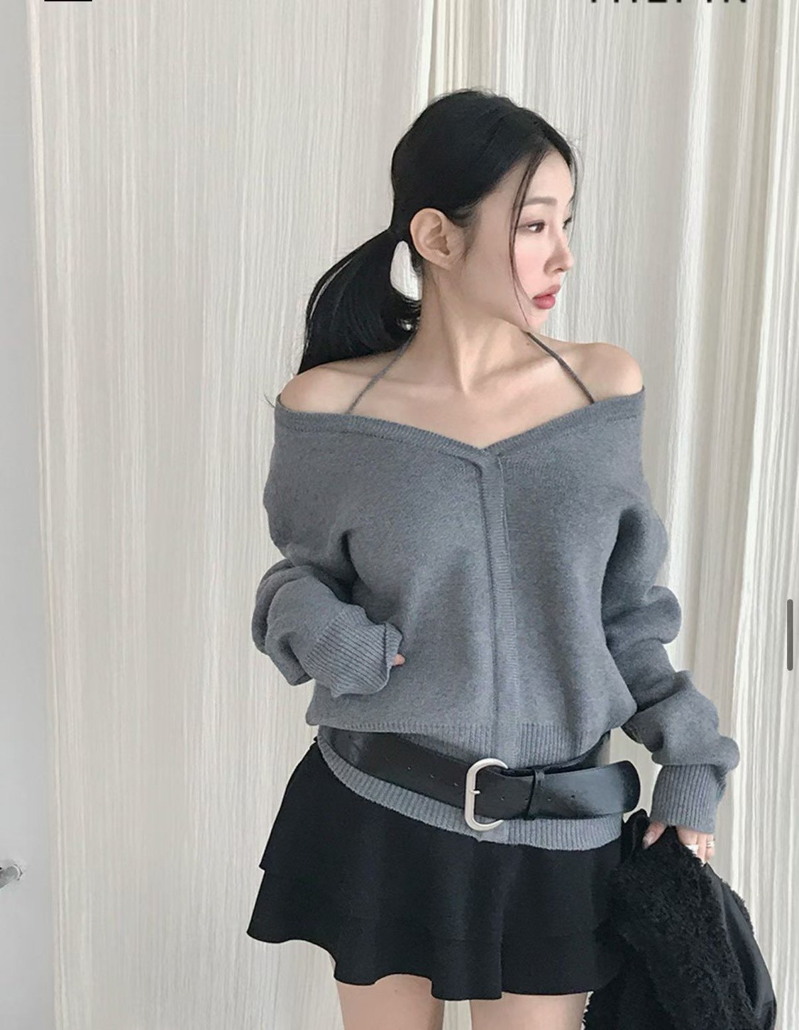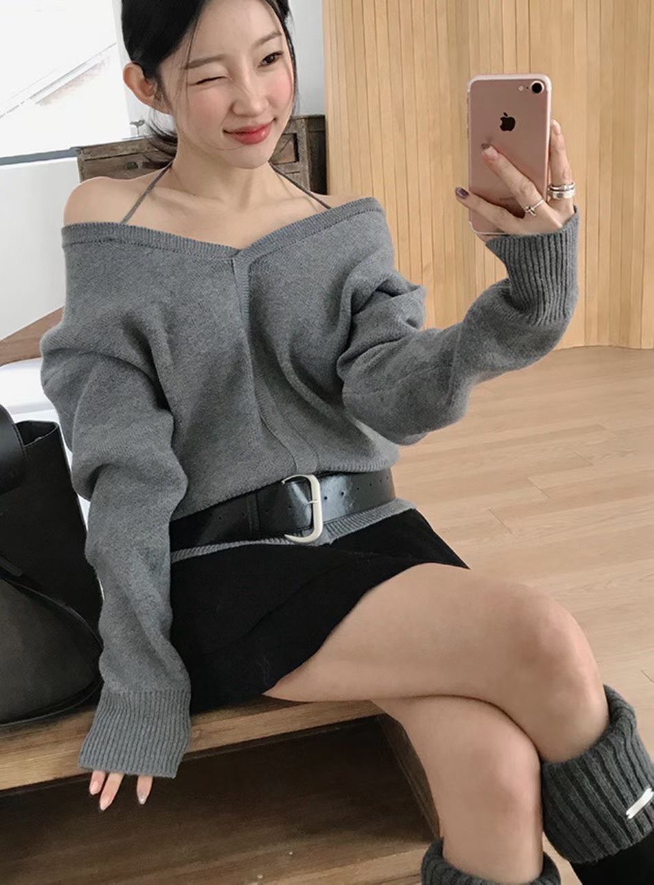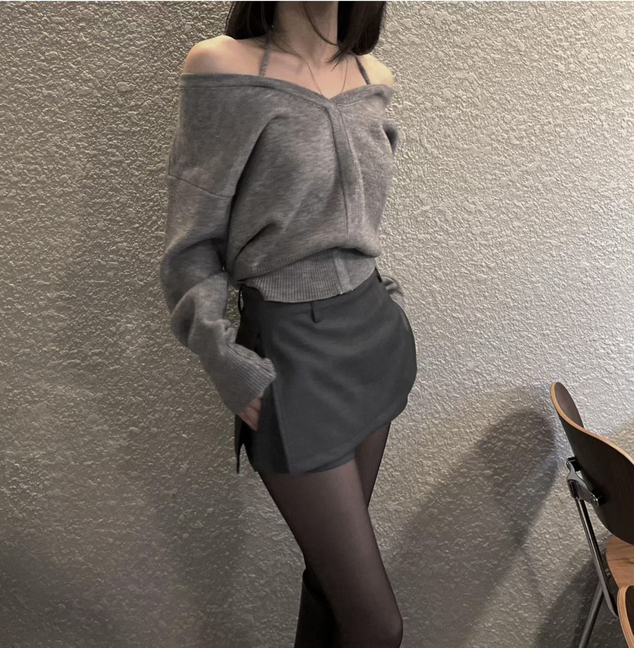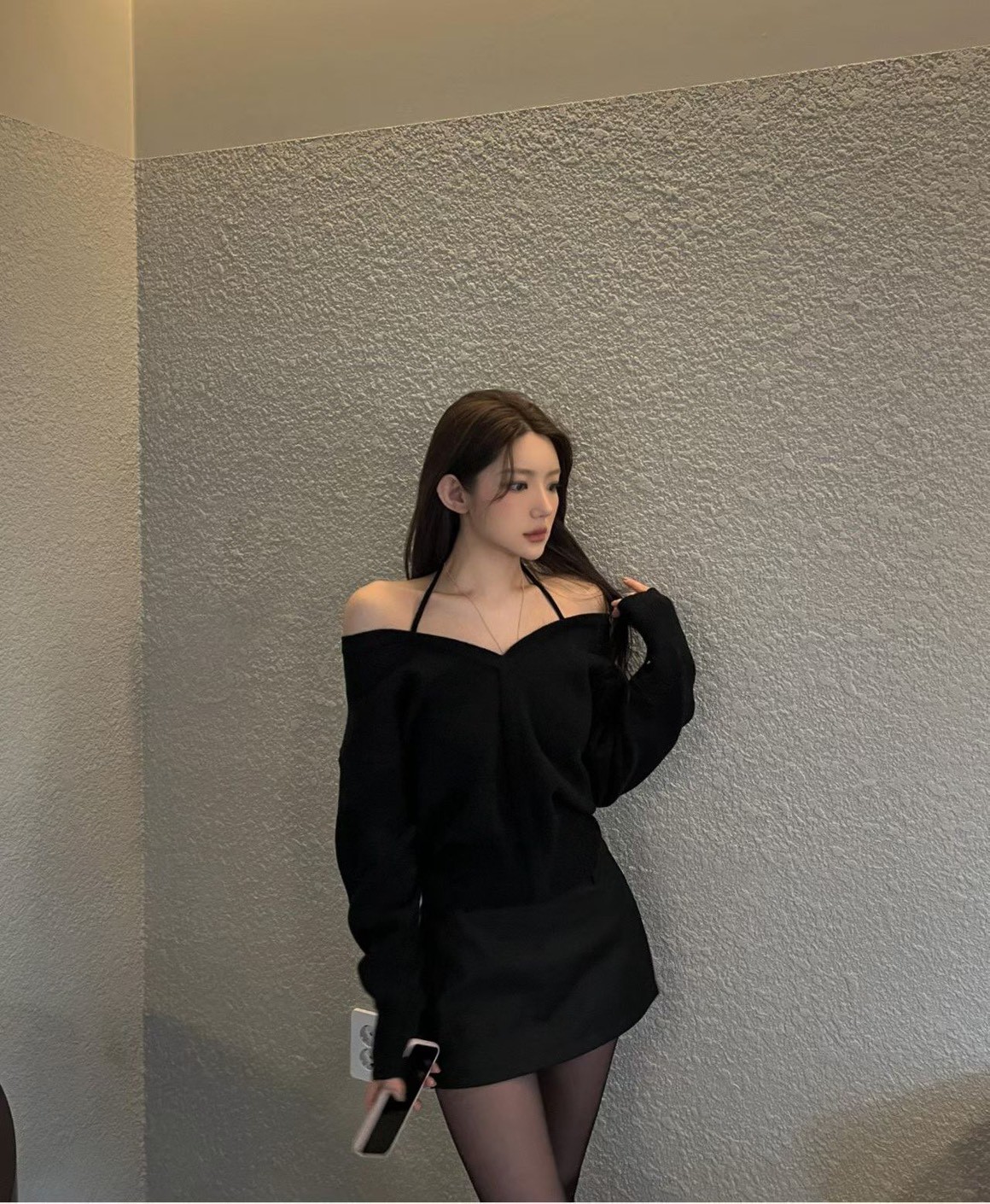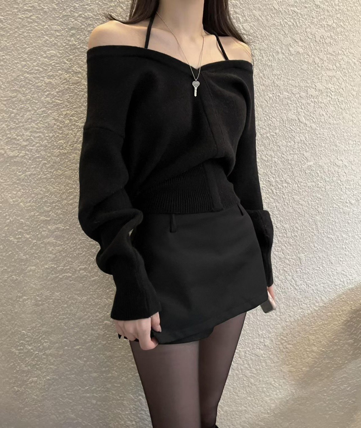 假兩件繞頸背心+垂墜可斜肩上衣SET