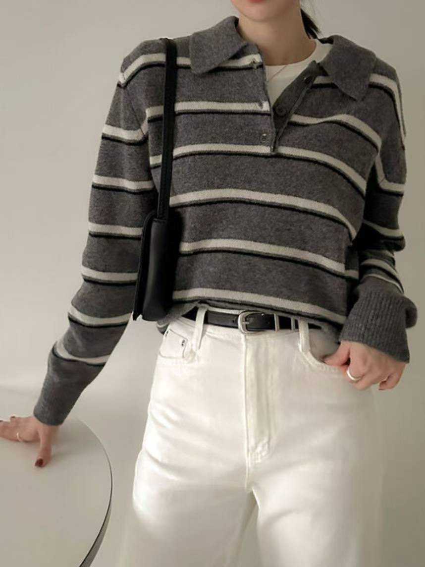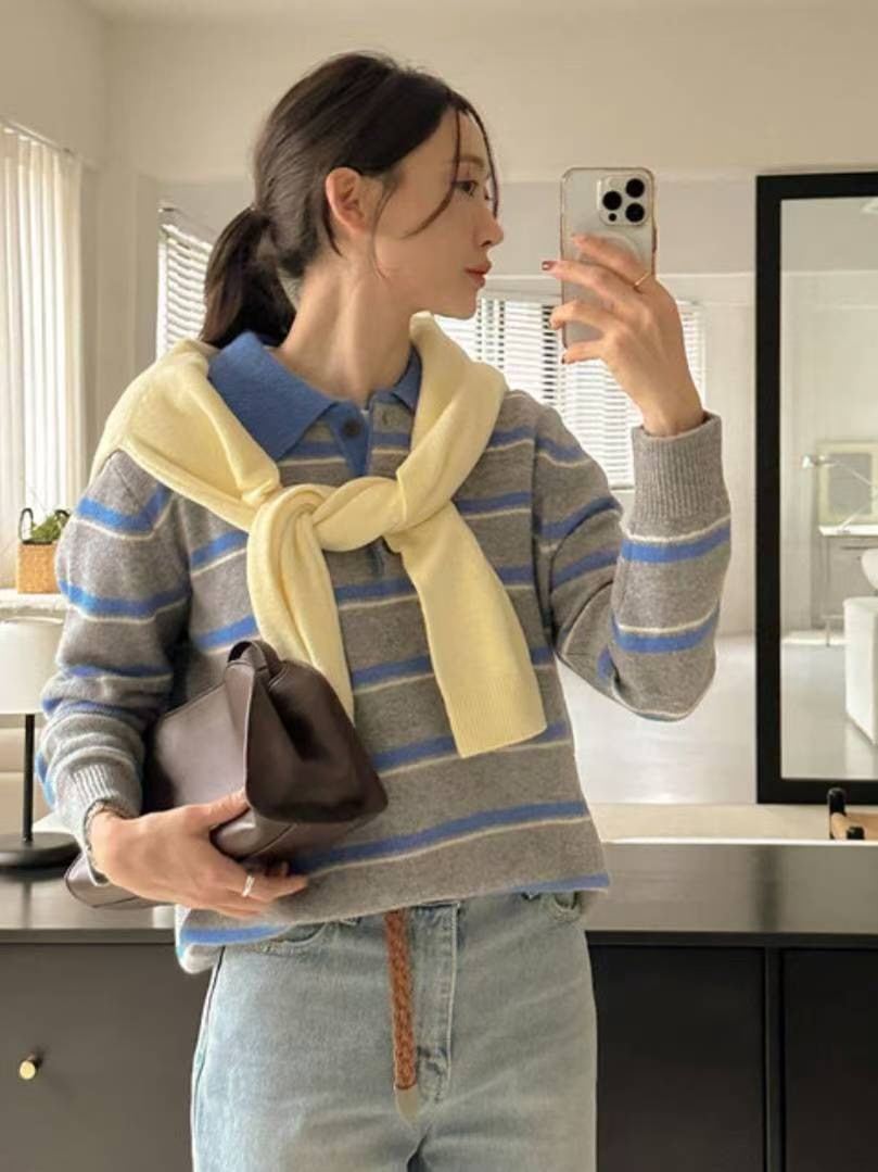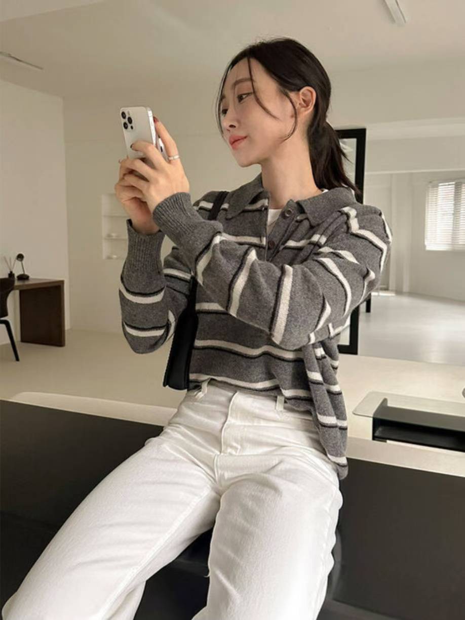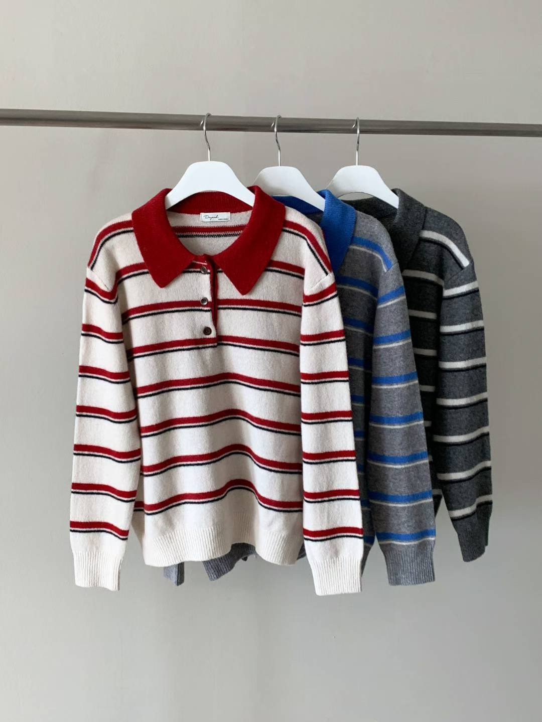 polo排釦領跳色橫條紋羊毛針織衣(100%)