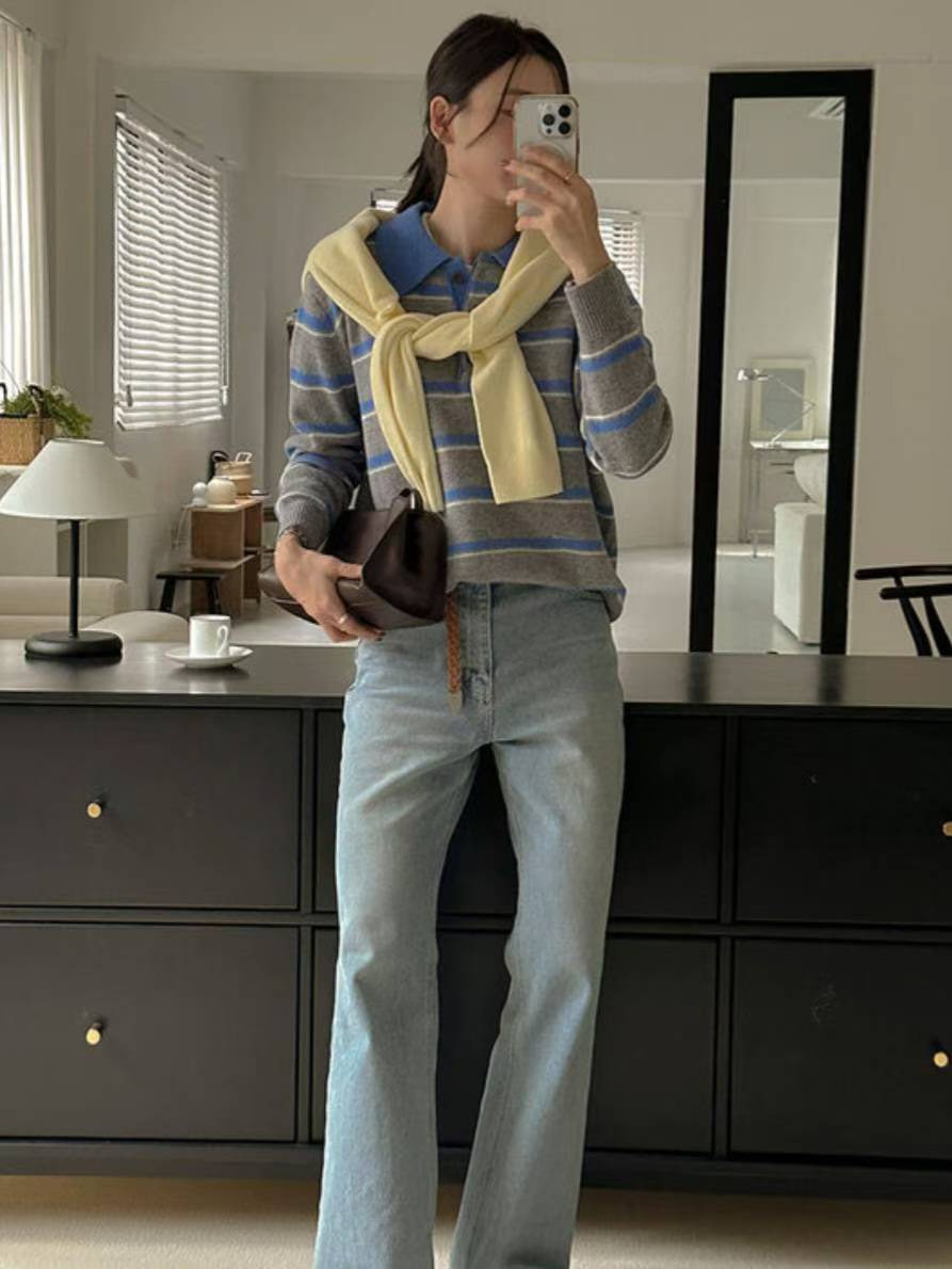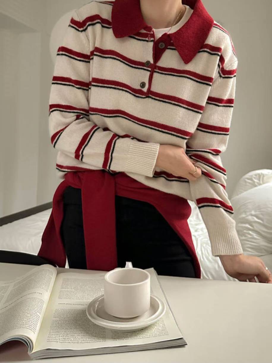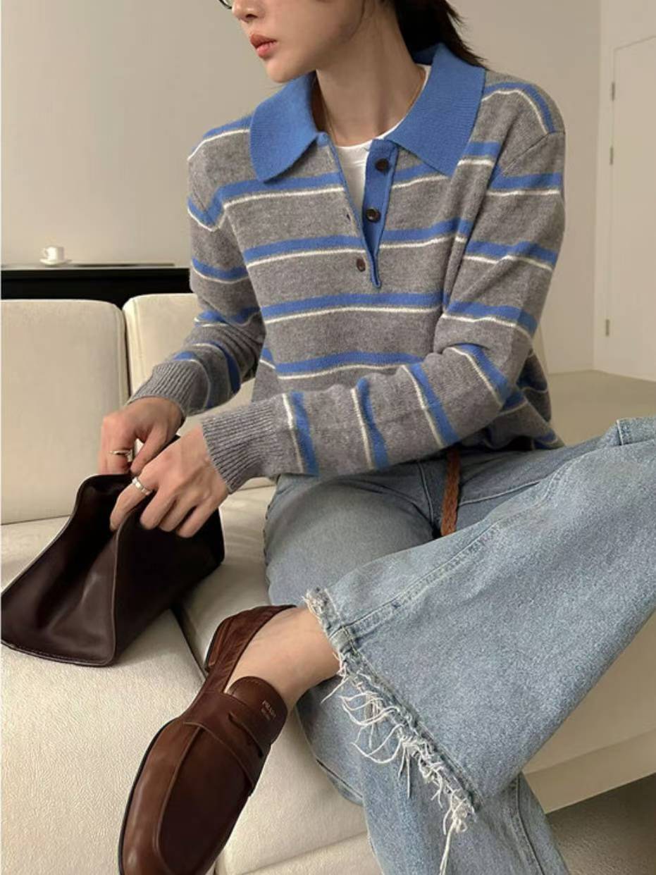 polo排釦領跳色橫條紋羊毛針織衣(100%)