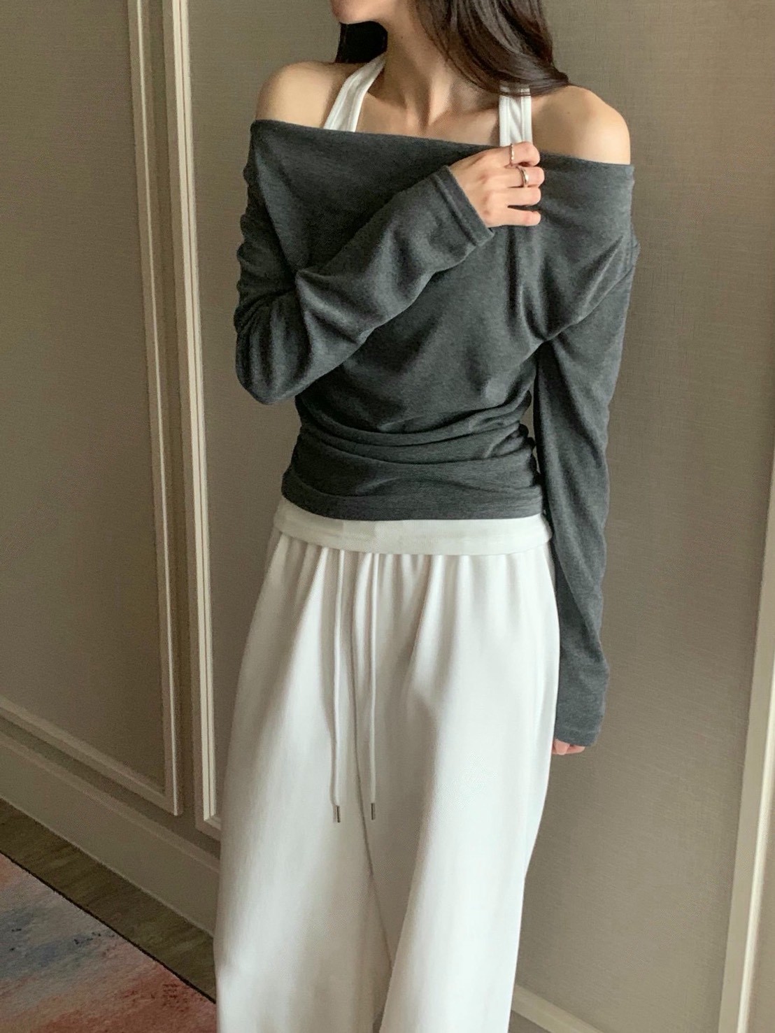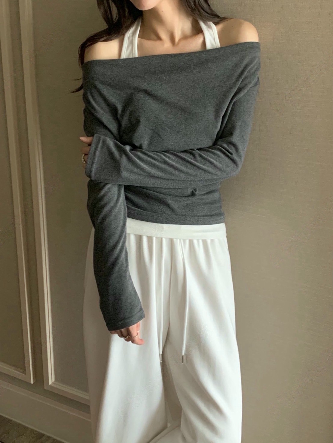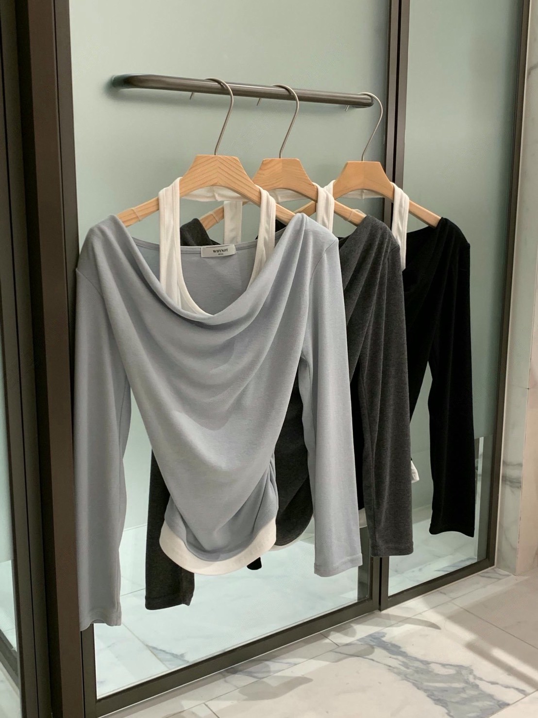假兩件繞頸背心+垂墜可斜肩上衣SET