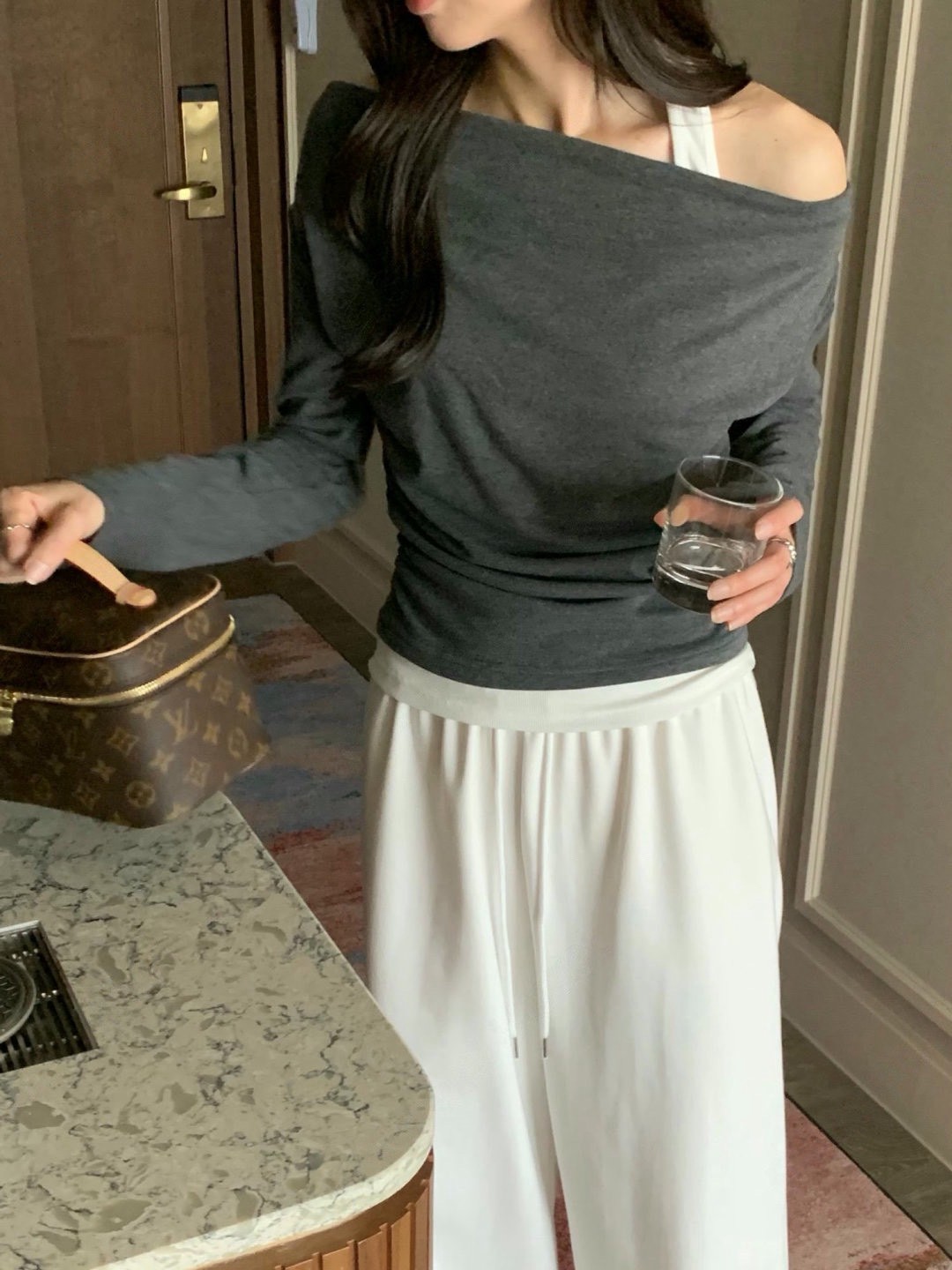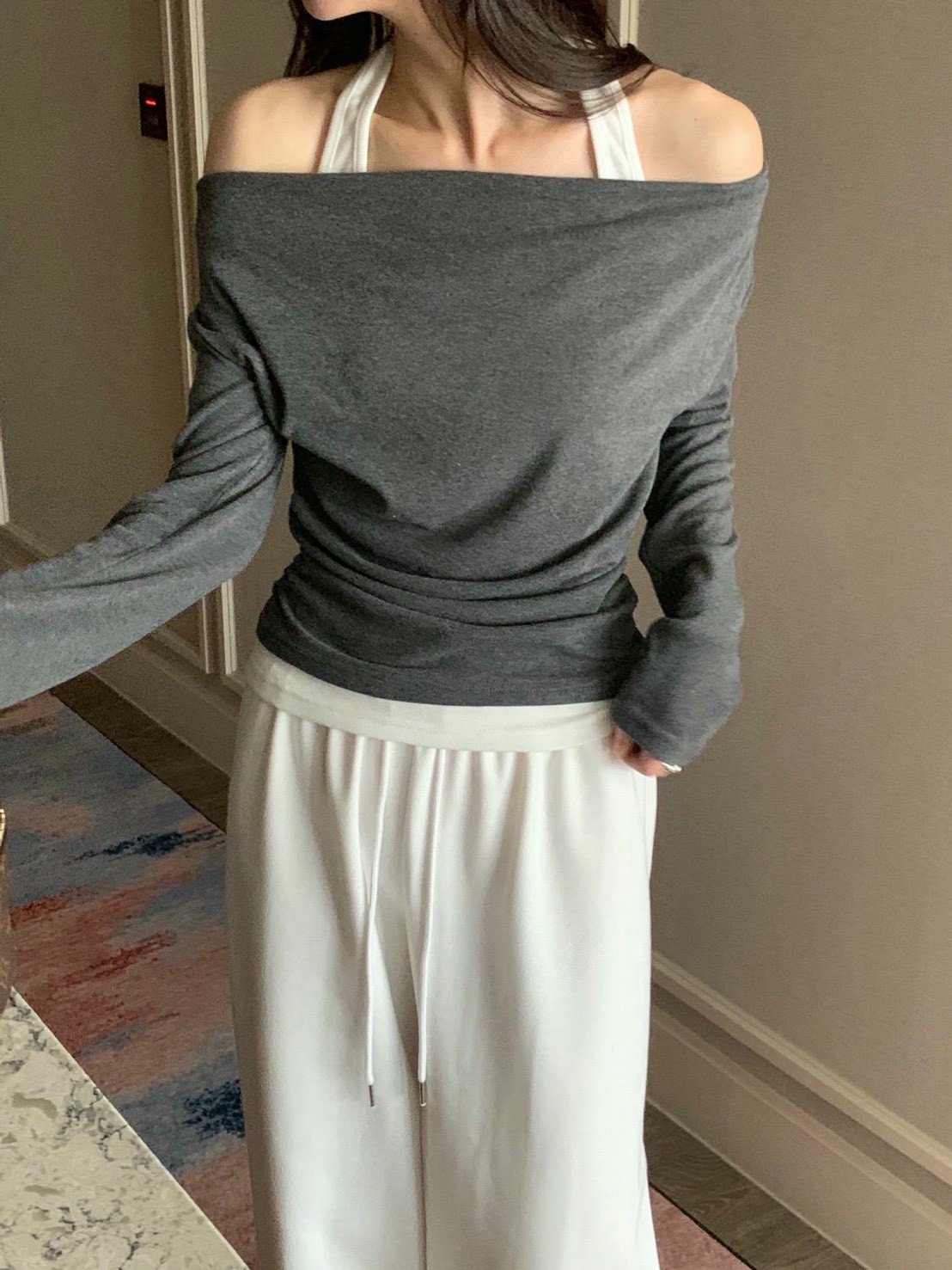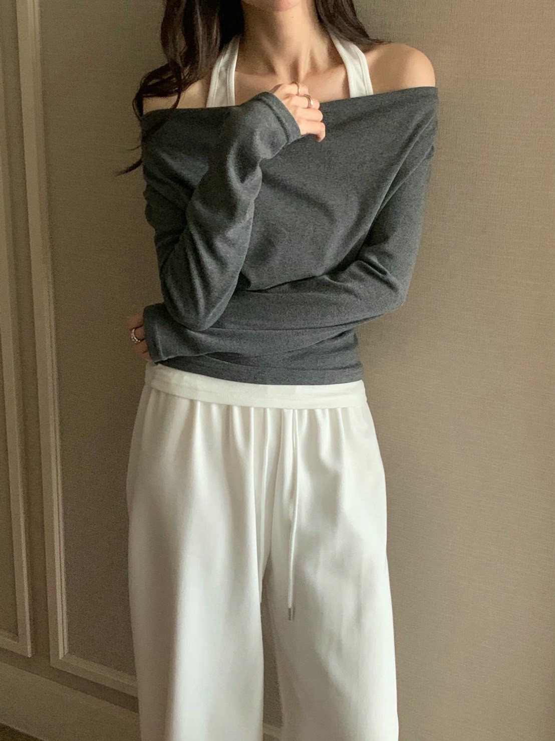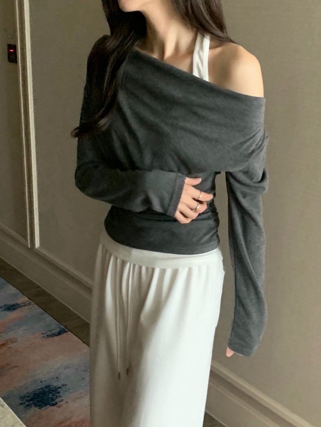 假兩件繞頸背心+垂墜可斜肩上衣SET