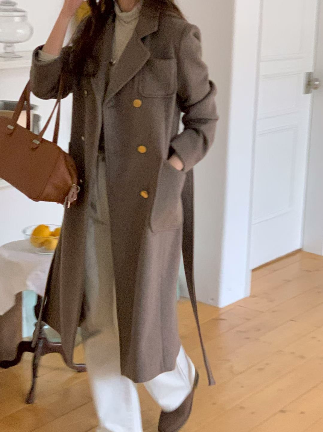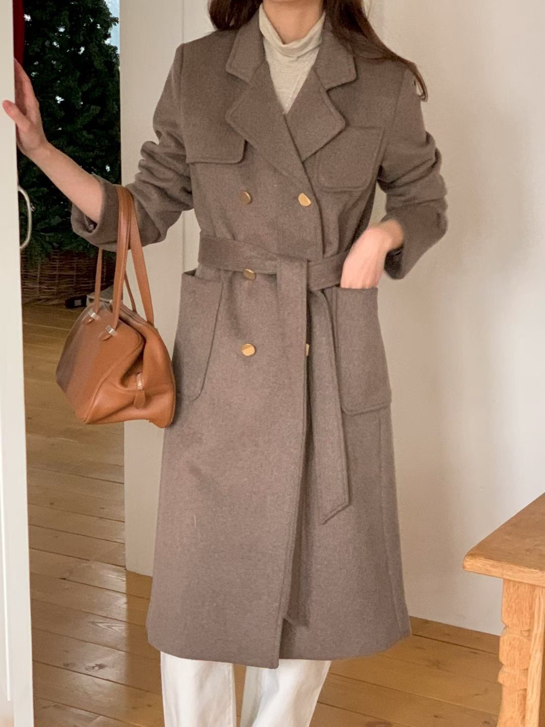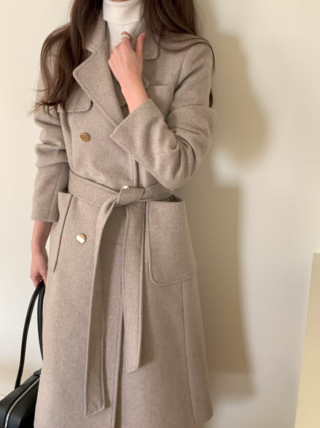 口袋雙排金扣羊毛50%長版大衣(附綁帶)