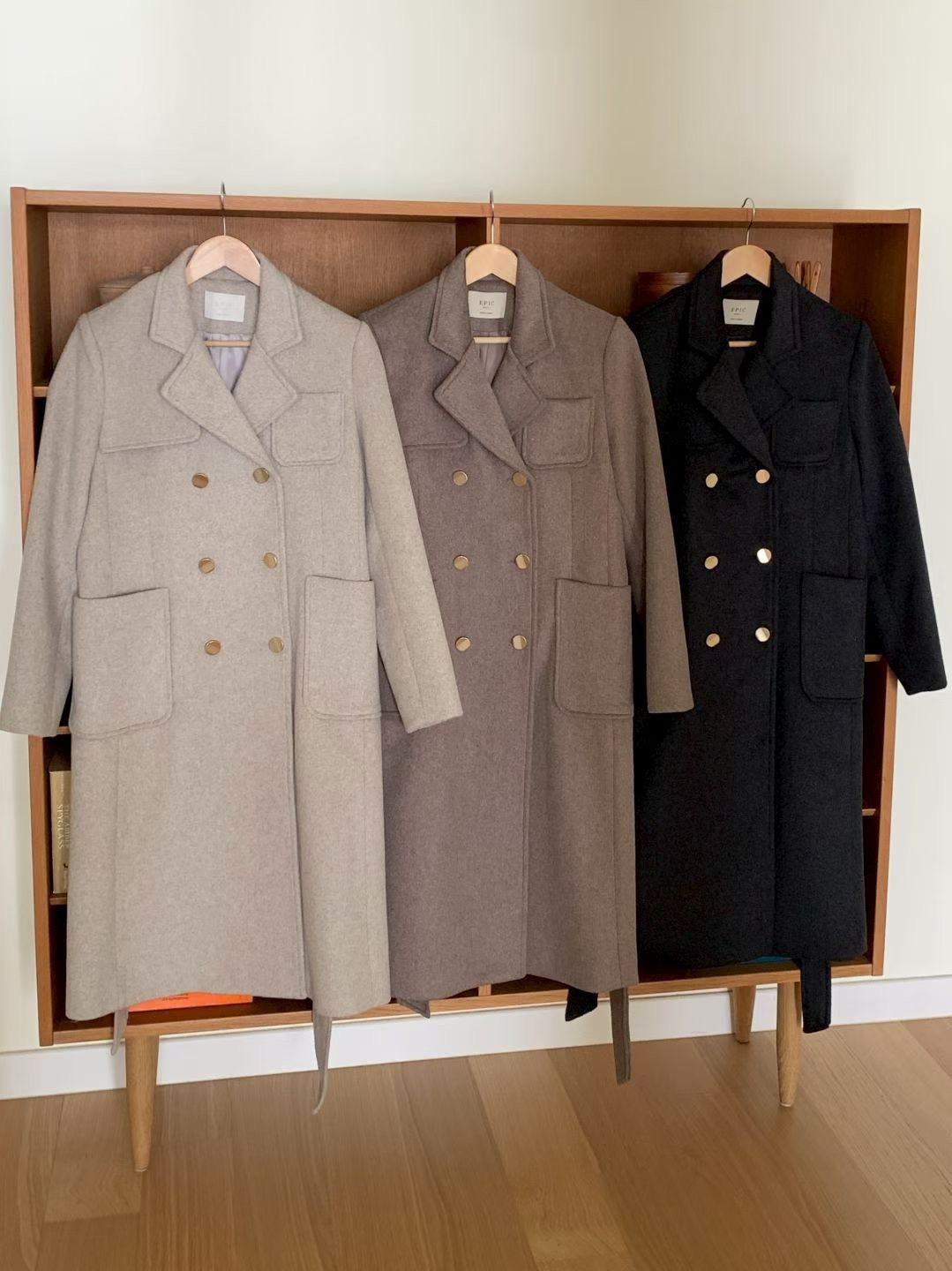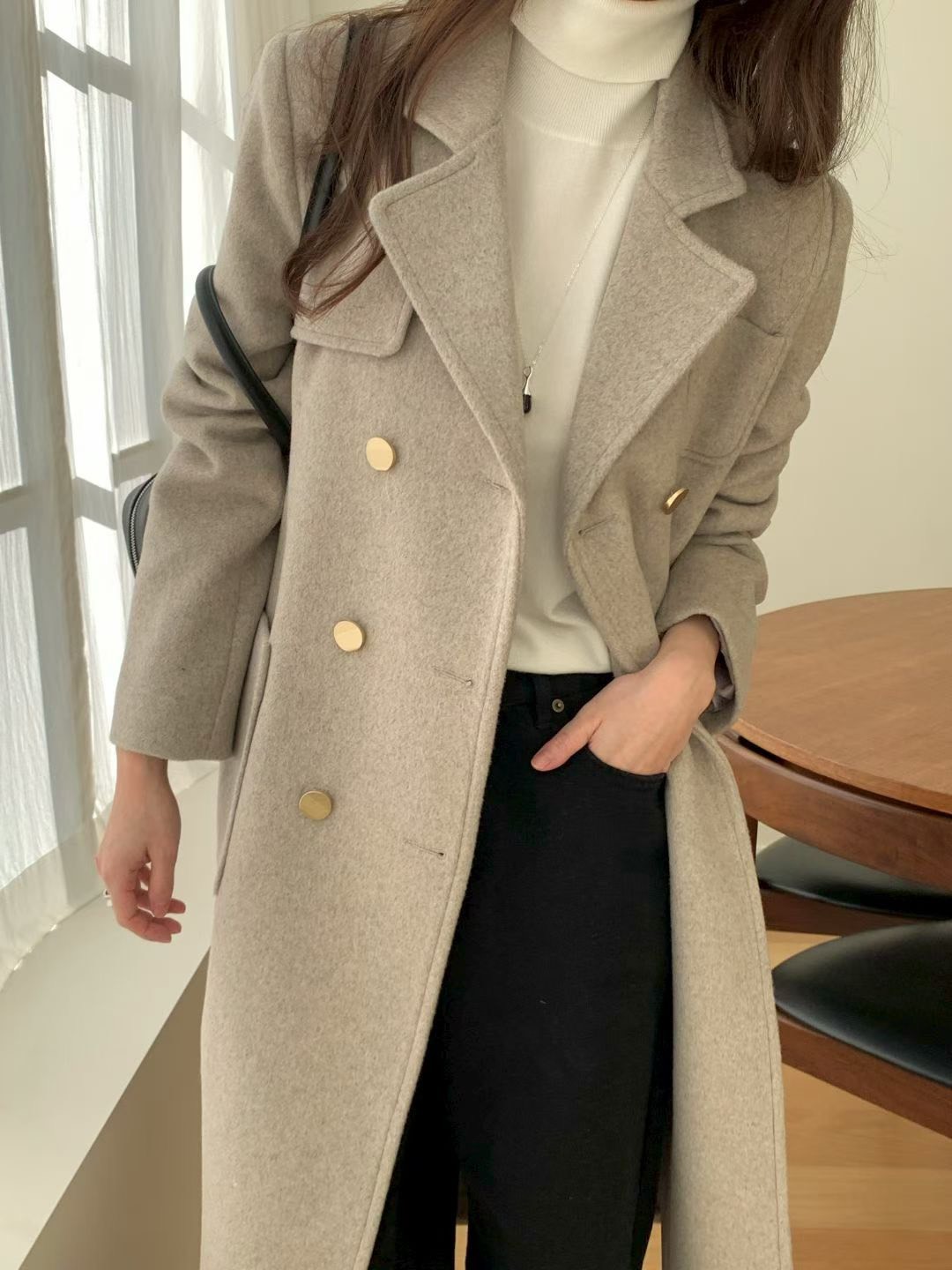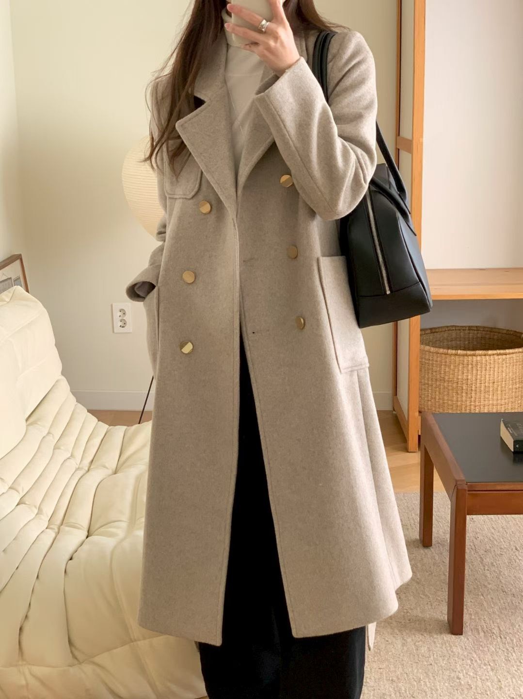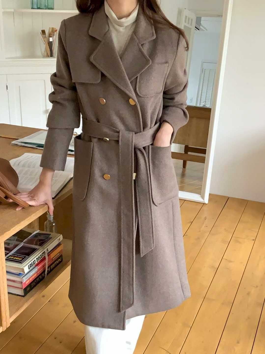 口袋雙排金扣羊毛50%長版大衣(附綁帶)