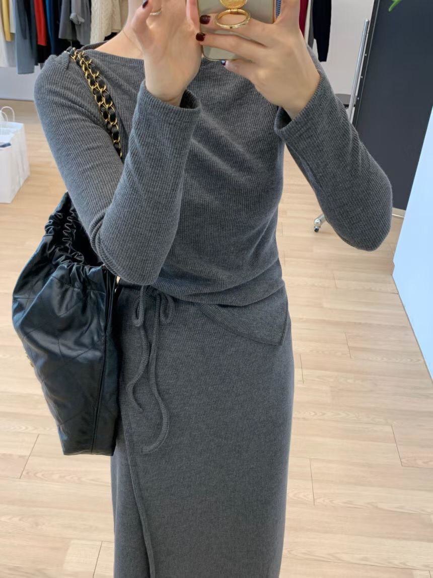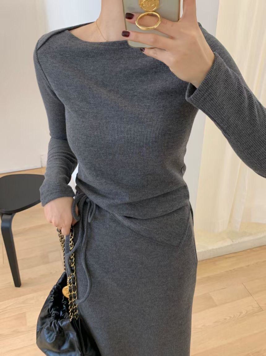 斜肩寬版短腰薄T+低腰抽繩長裙SET