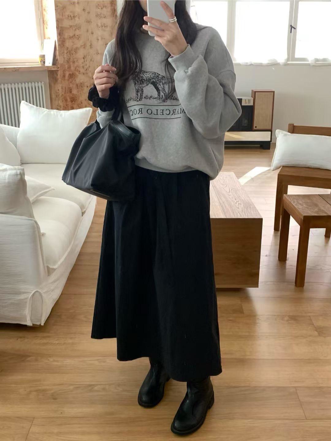 刷毛平領大學T+後開衩磨毛長裙SET
