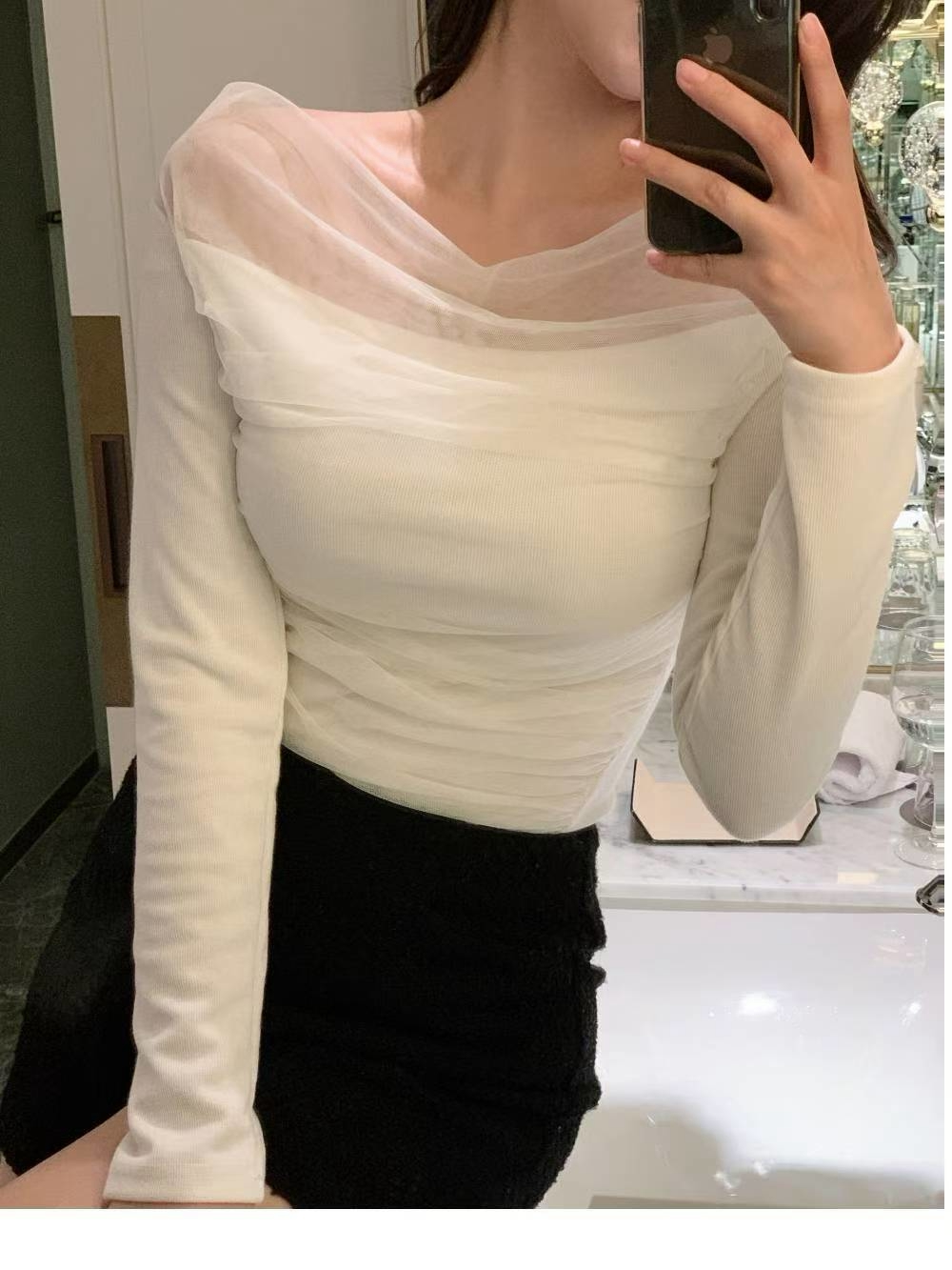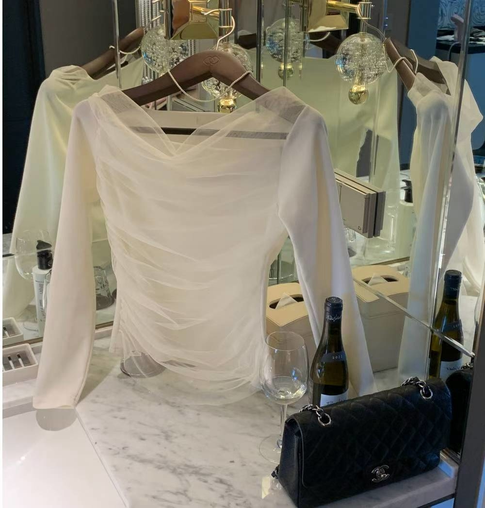 拼接歐根紗側邊抓皺平領上衣