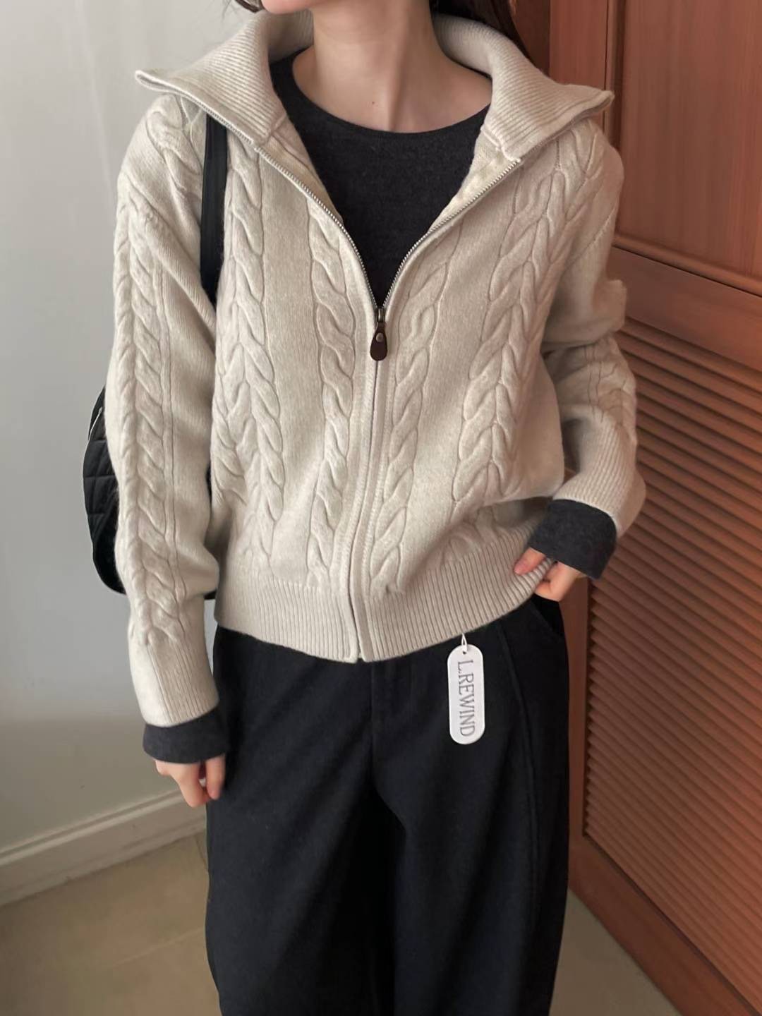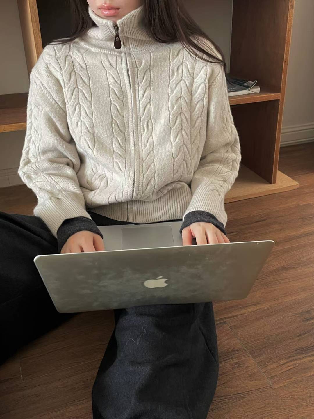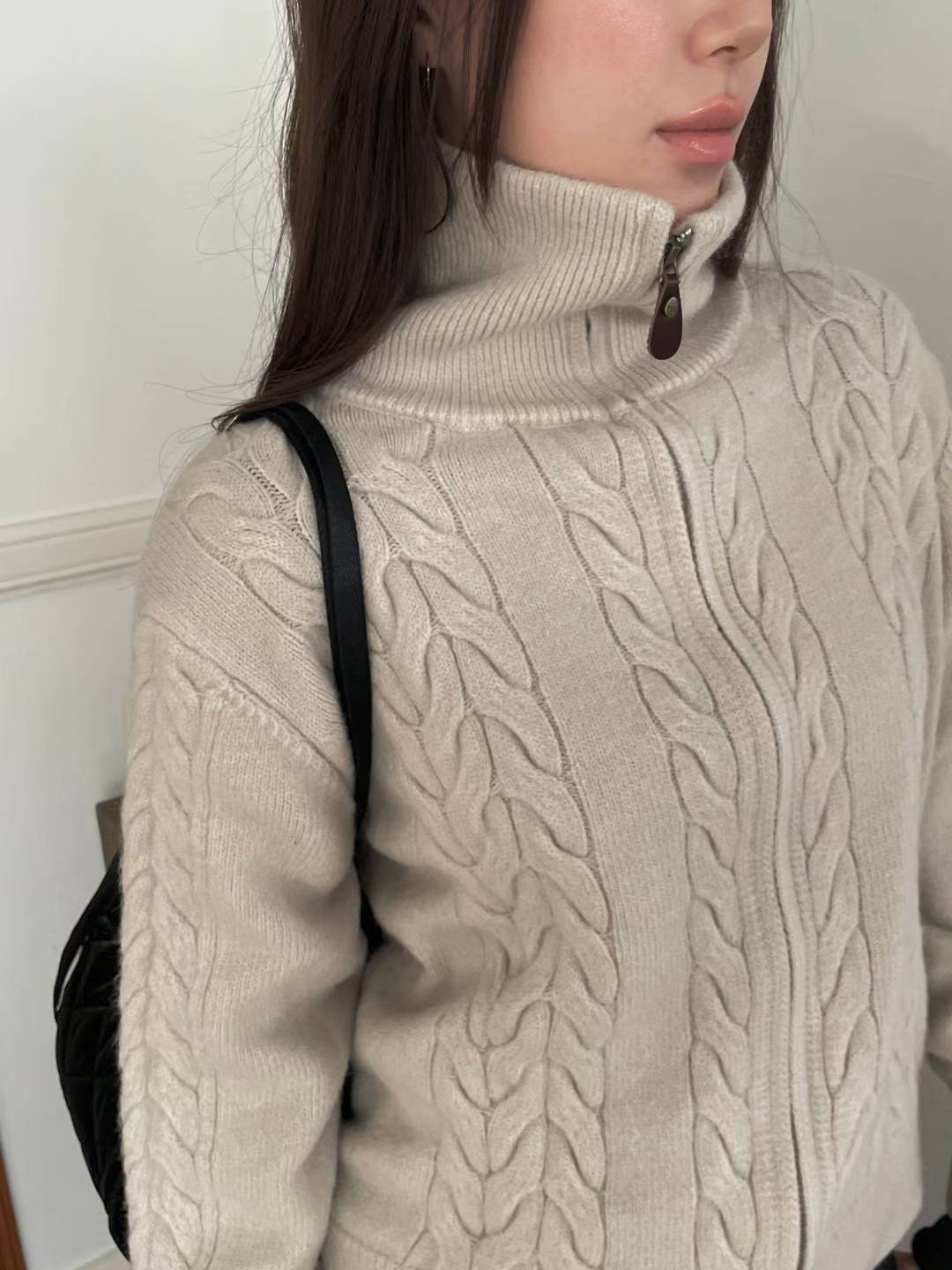 皮革拉鍊翻領麻花針織衣(羊毛30%)