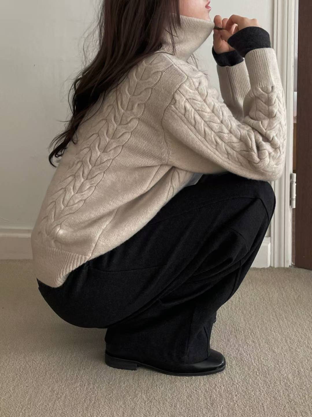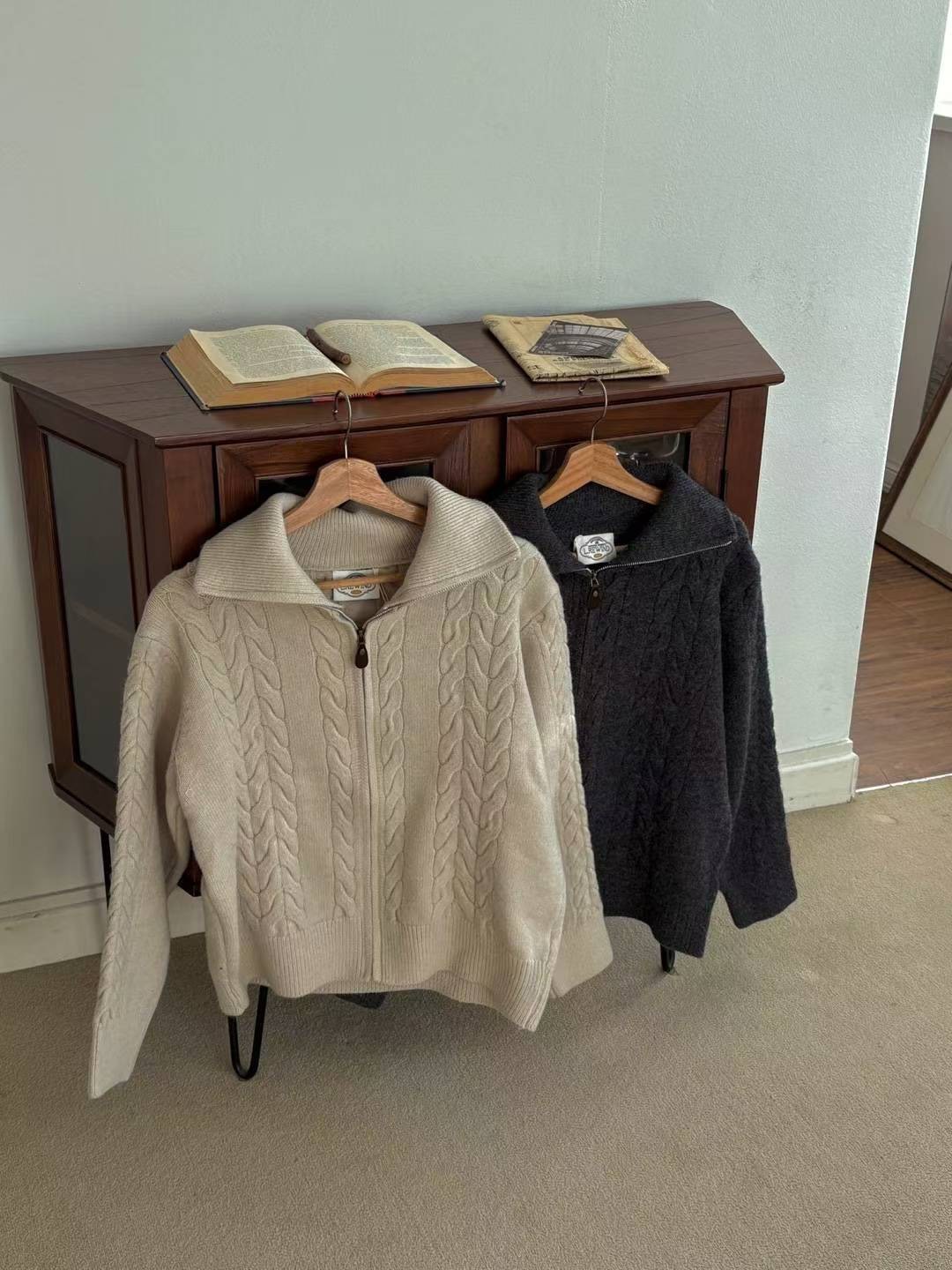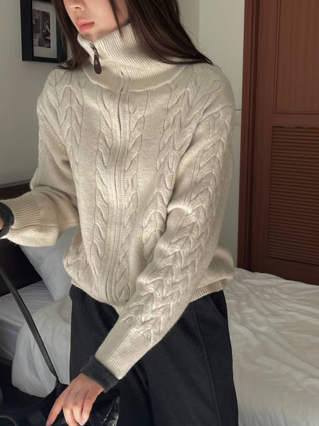 皮革拉鍊翻領麻花針織衣(羊毛30%)