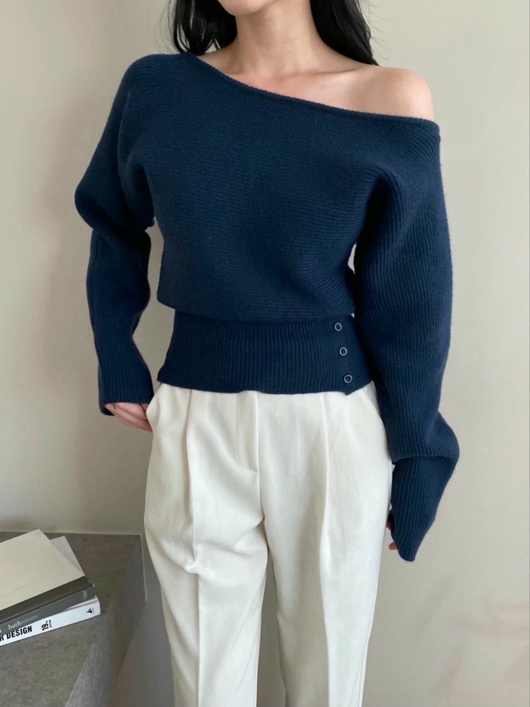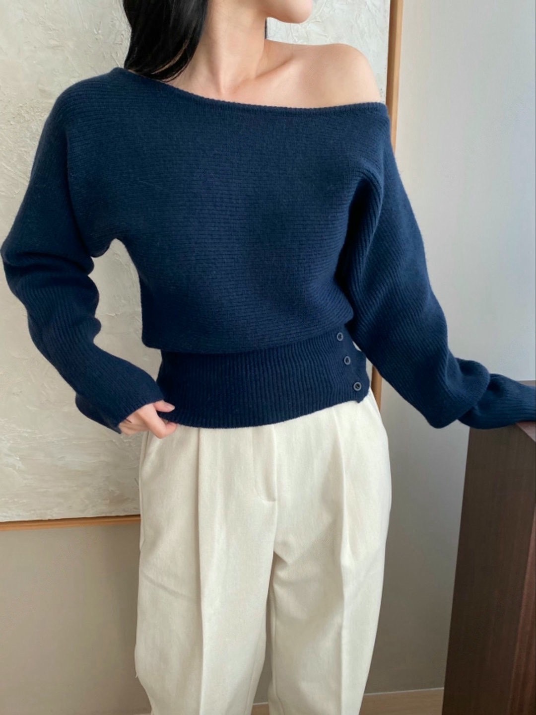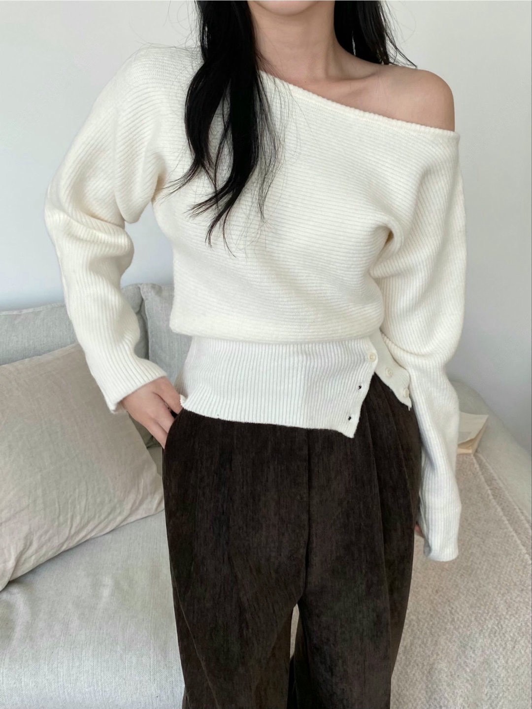翻領坑紋落肩針織衣+鬆緊短褲SET