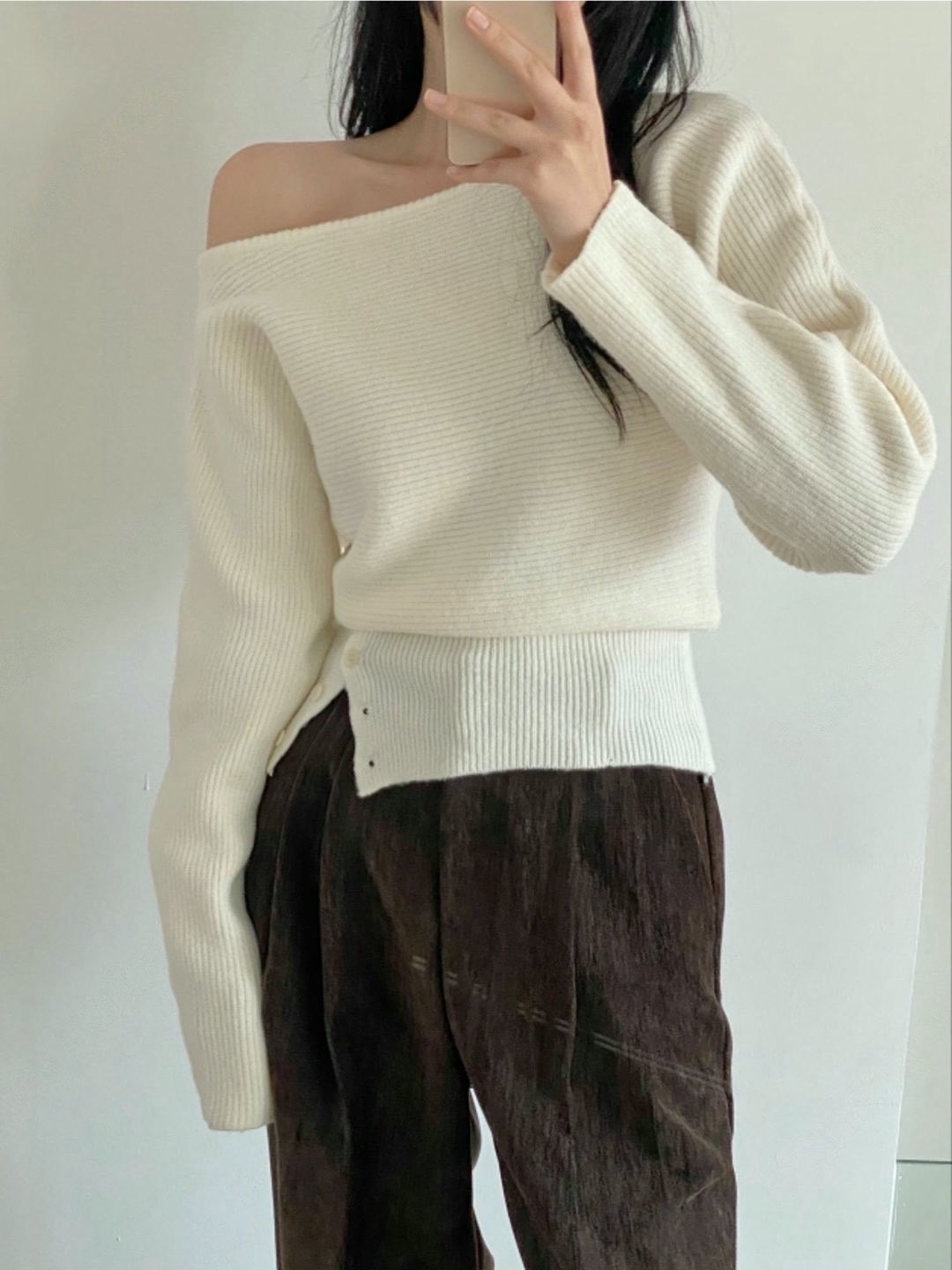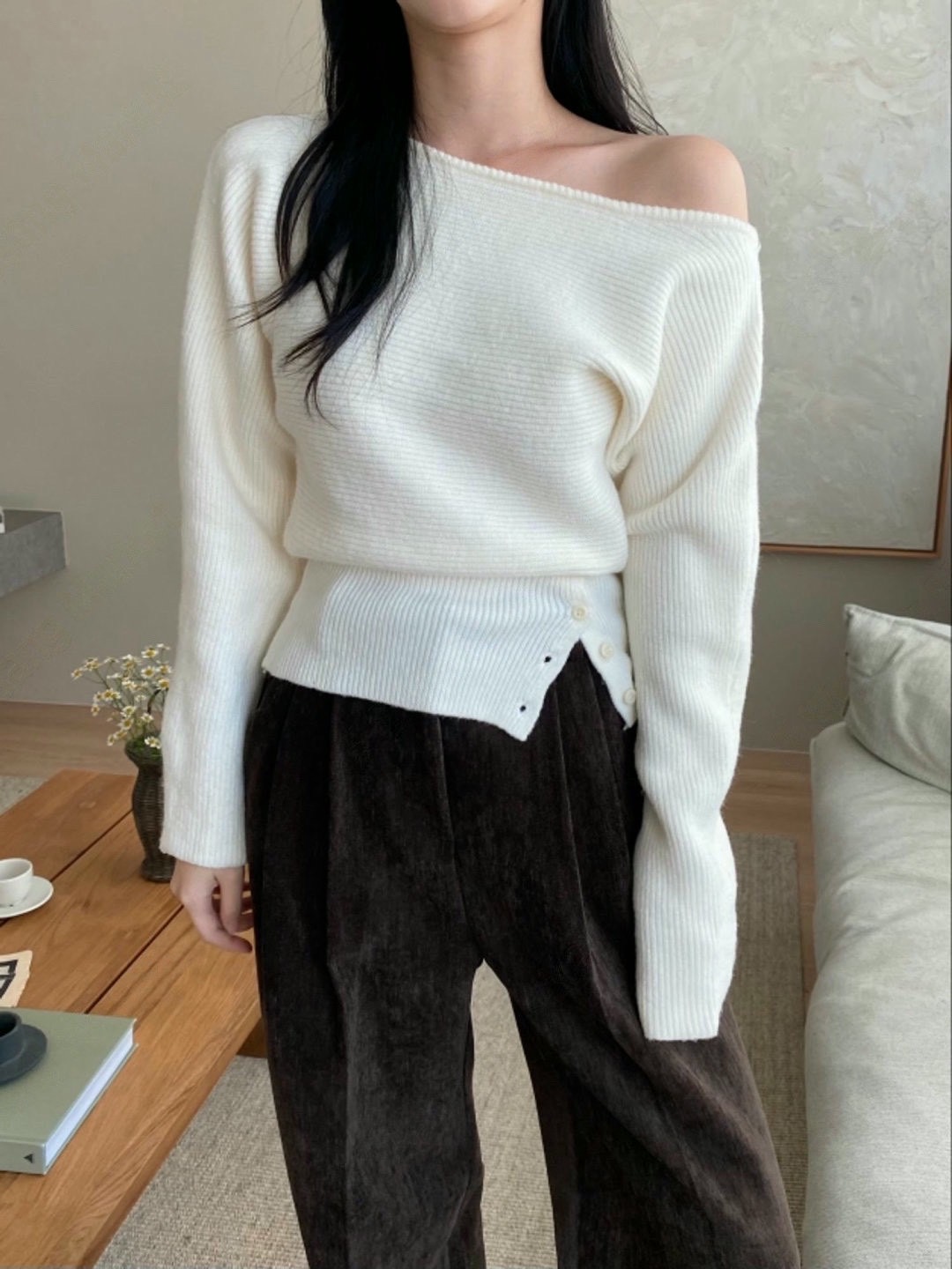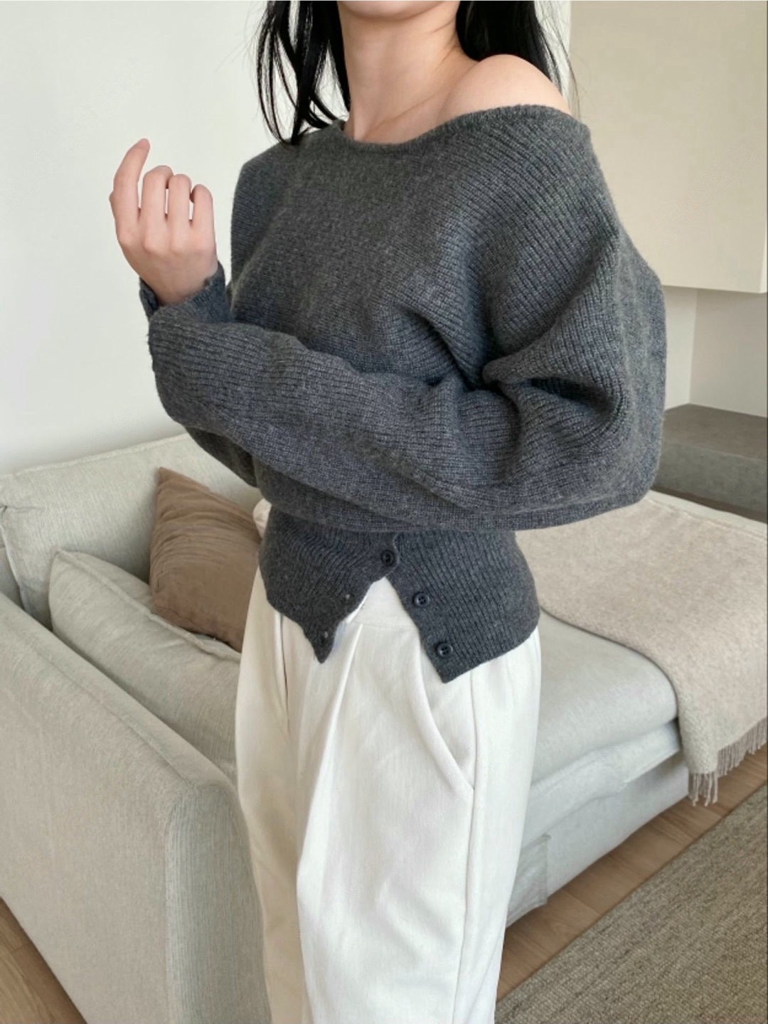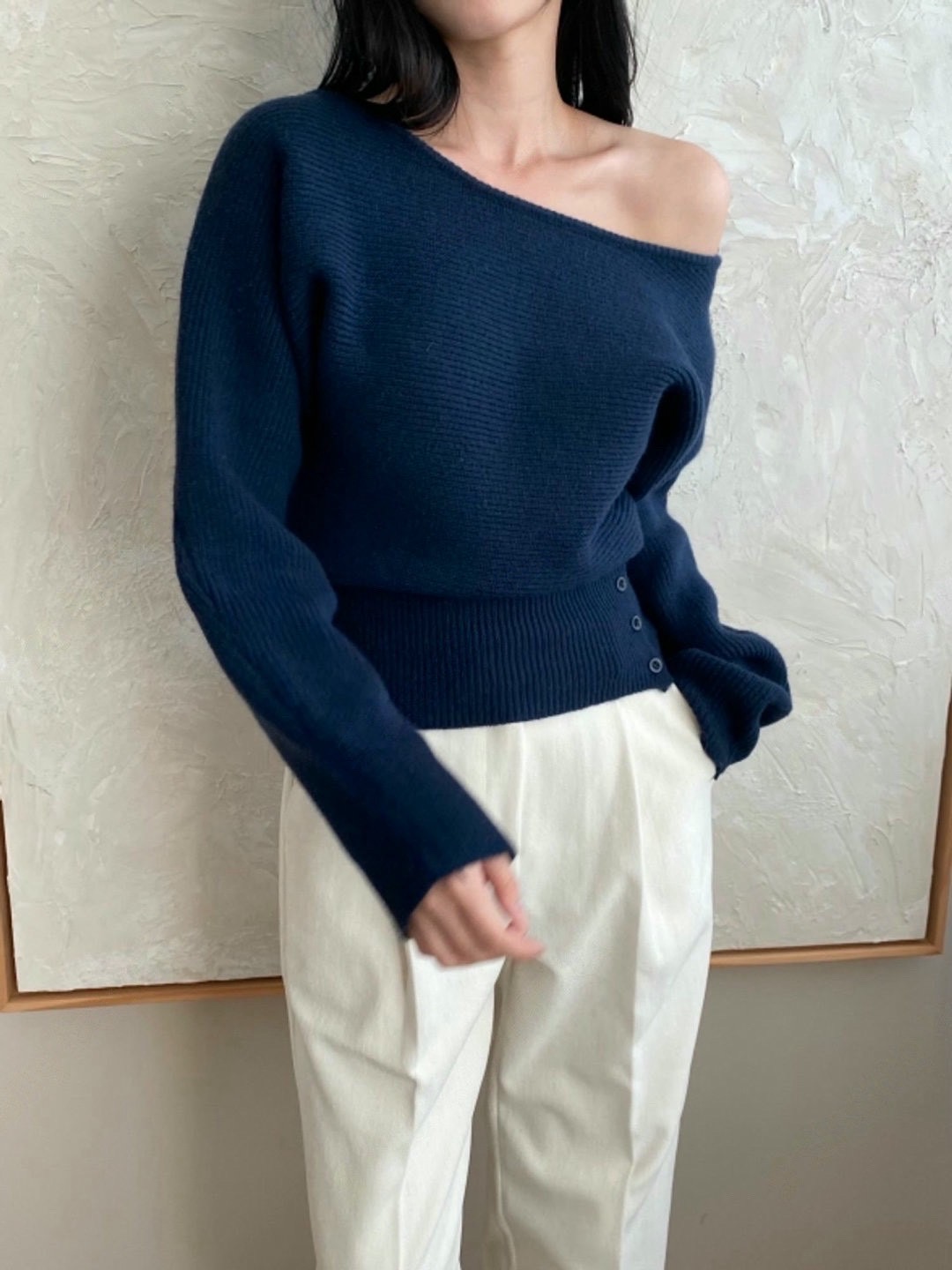 翻領坑紋落肩針織衣+鬆緊短褲SET