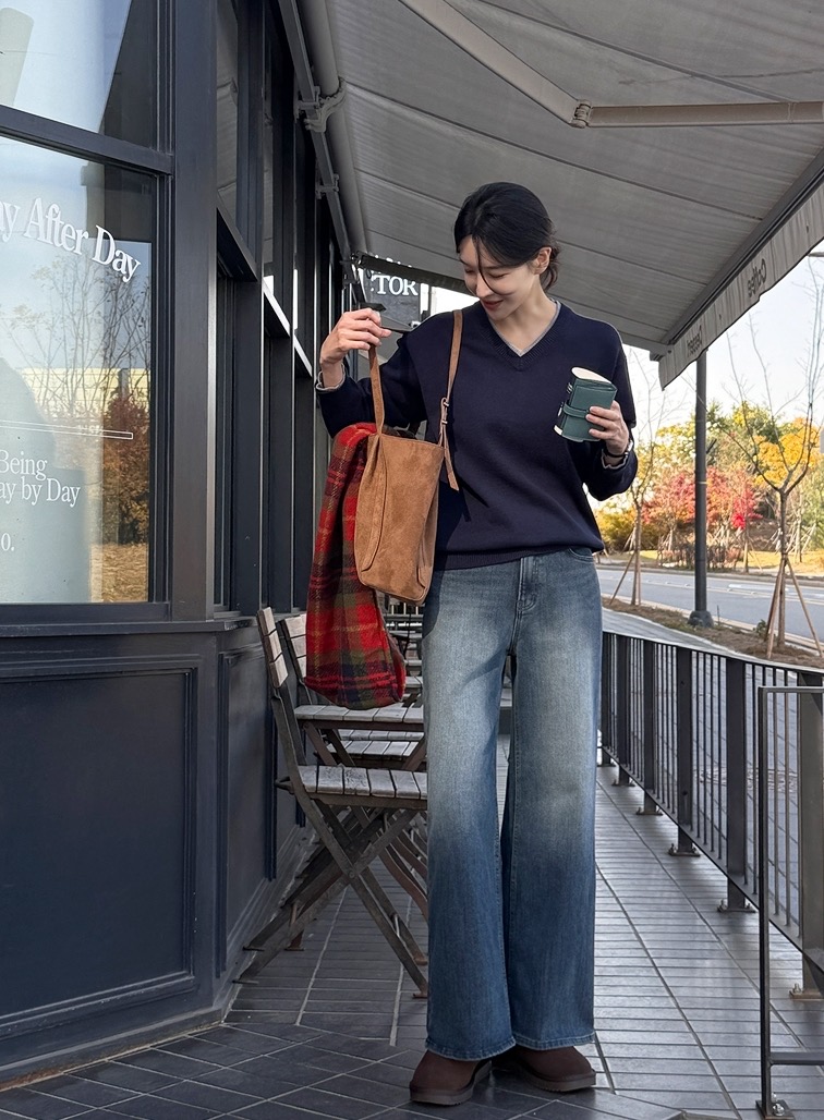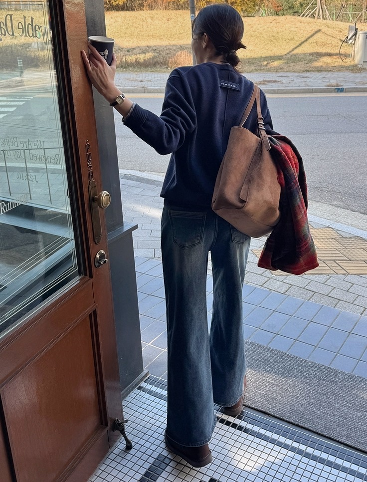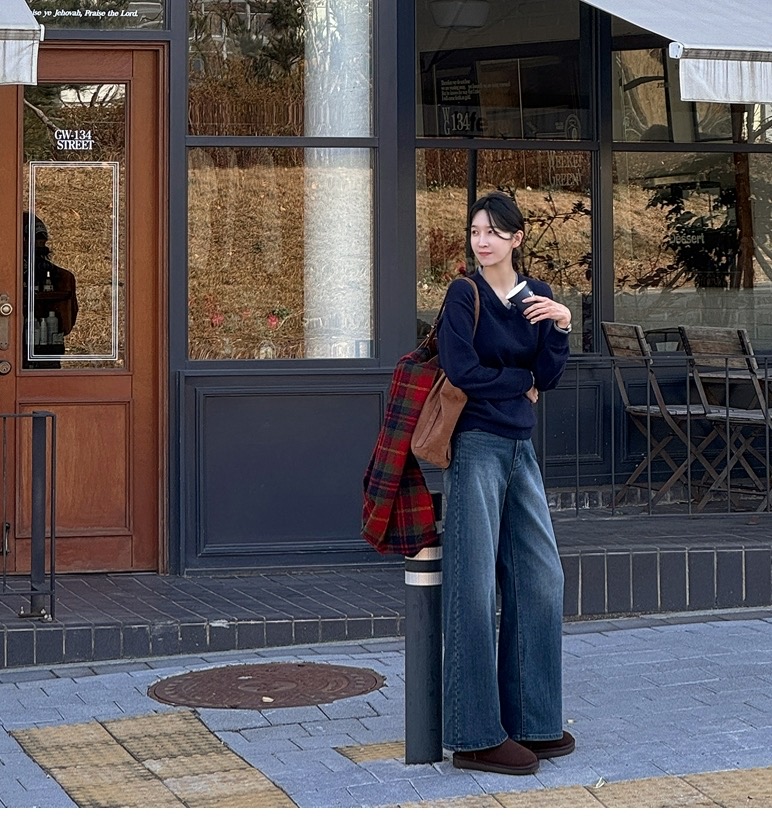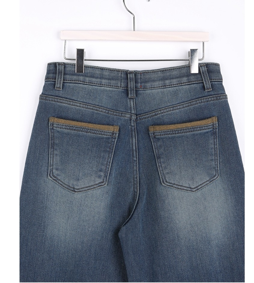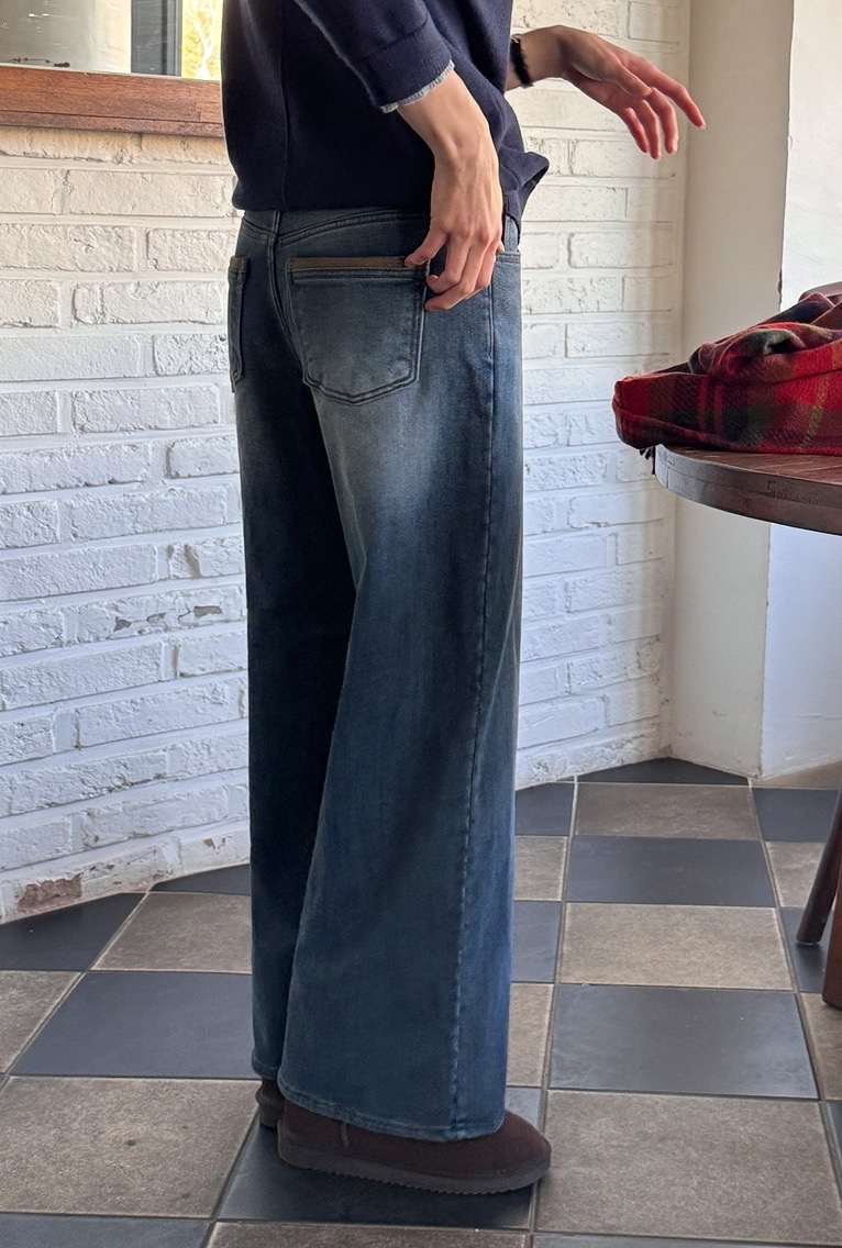 後口袋磨毛滾邊內刷薄毛直筒牛仔褲