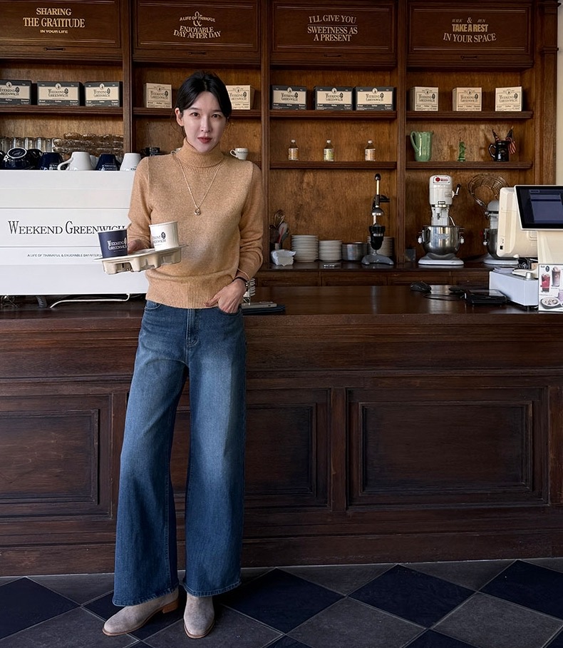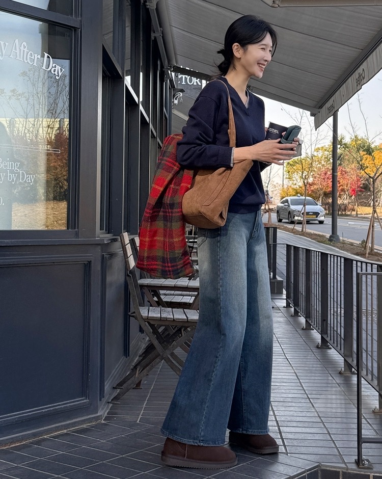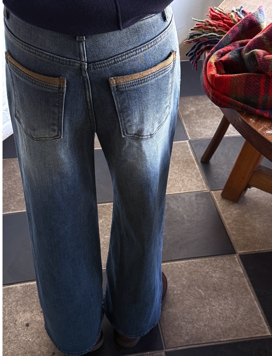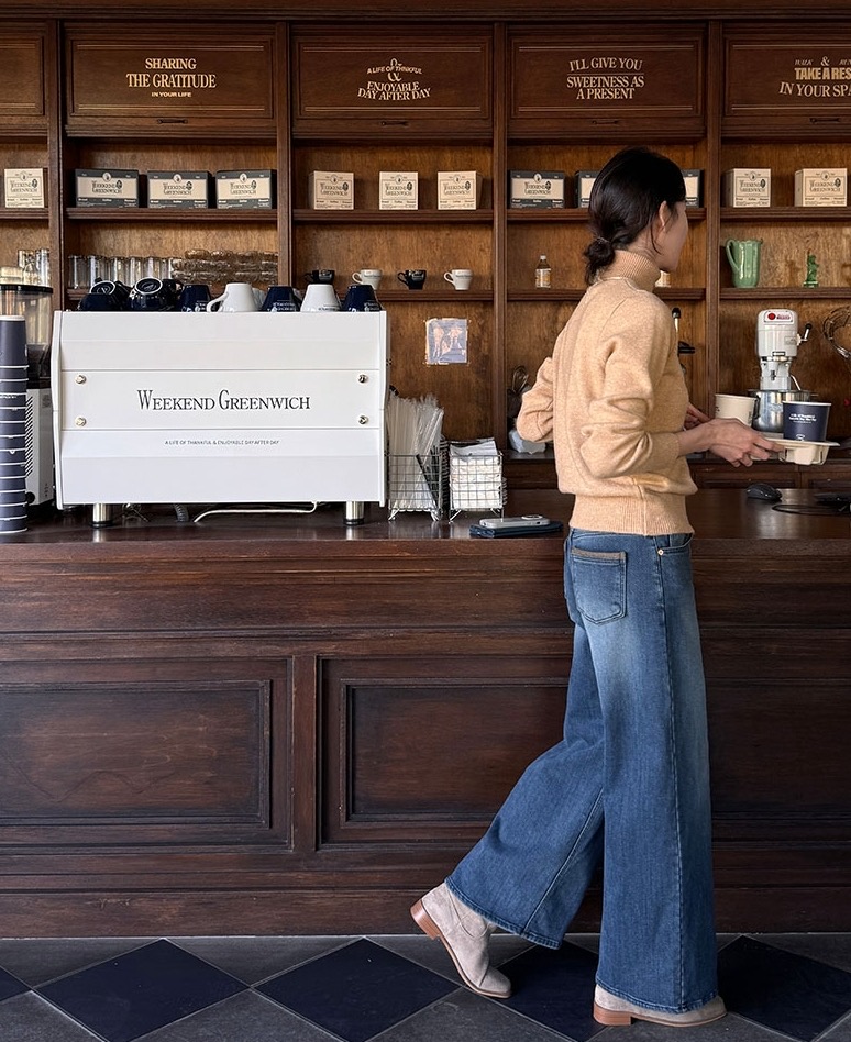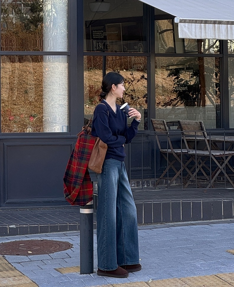 後口袋磨毛滾邊內刷薄毛直筒牛仔褲