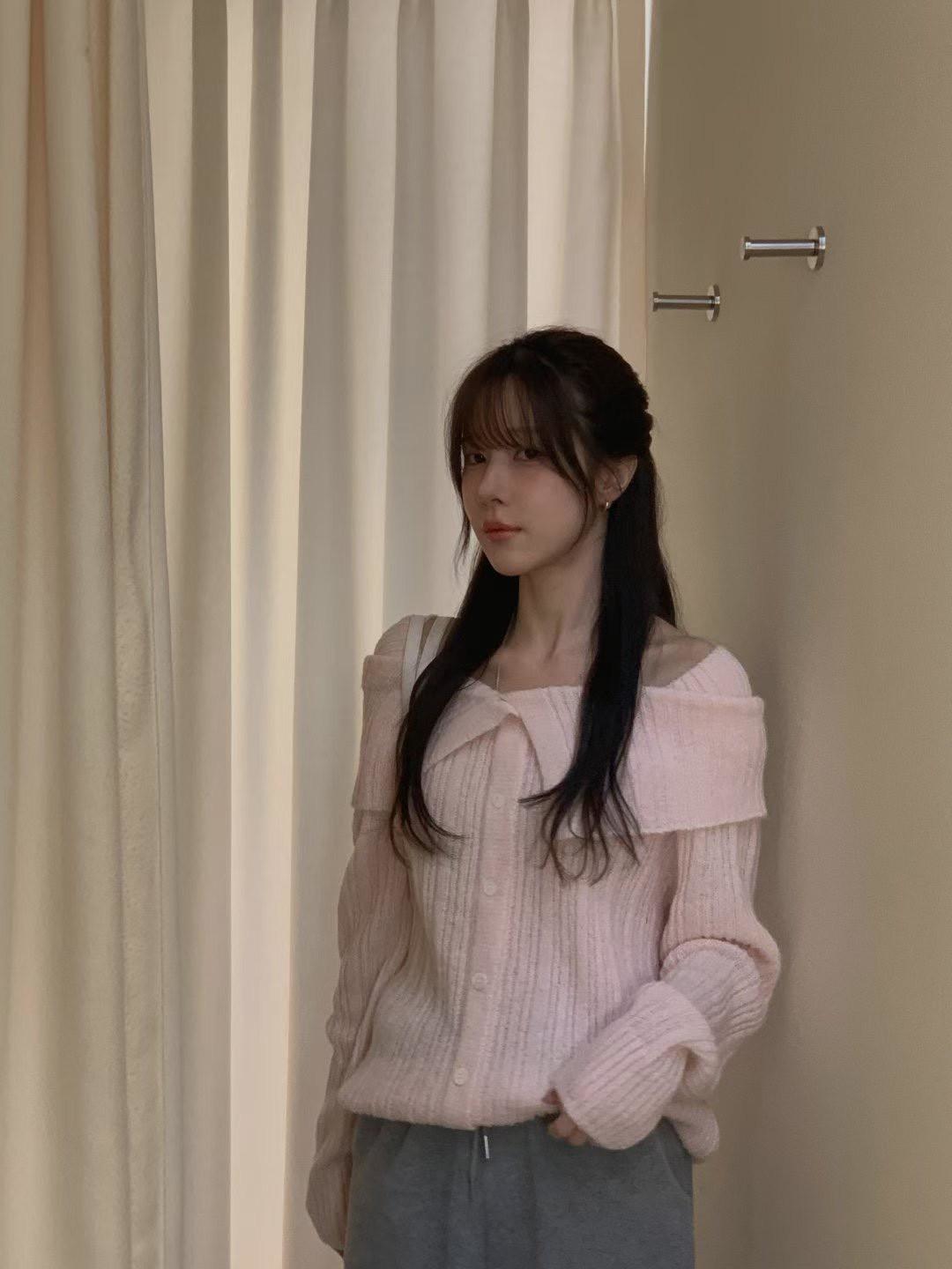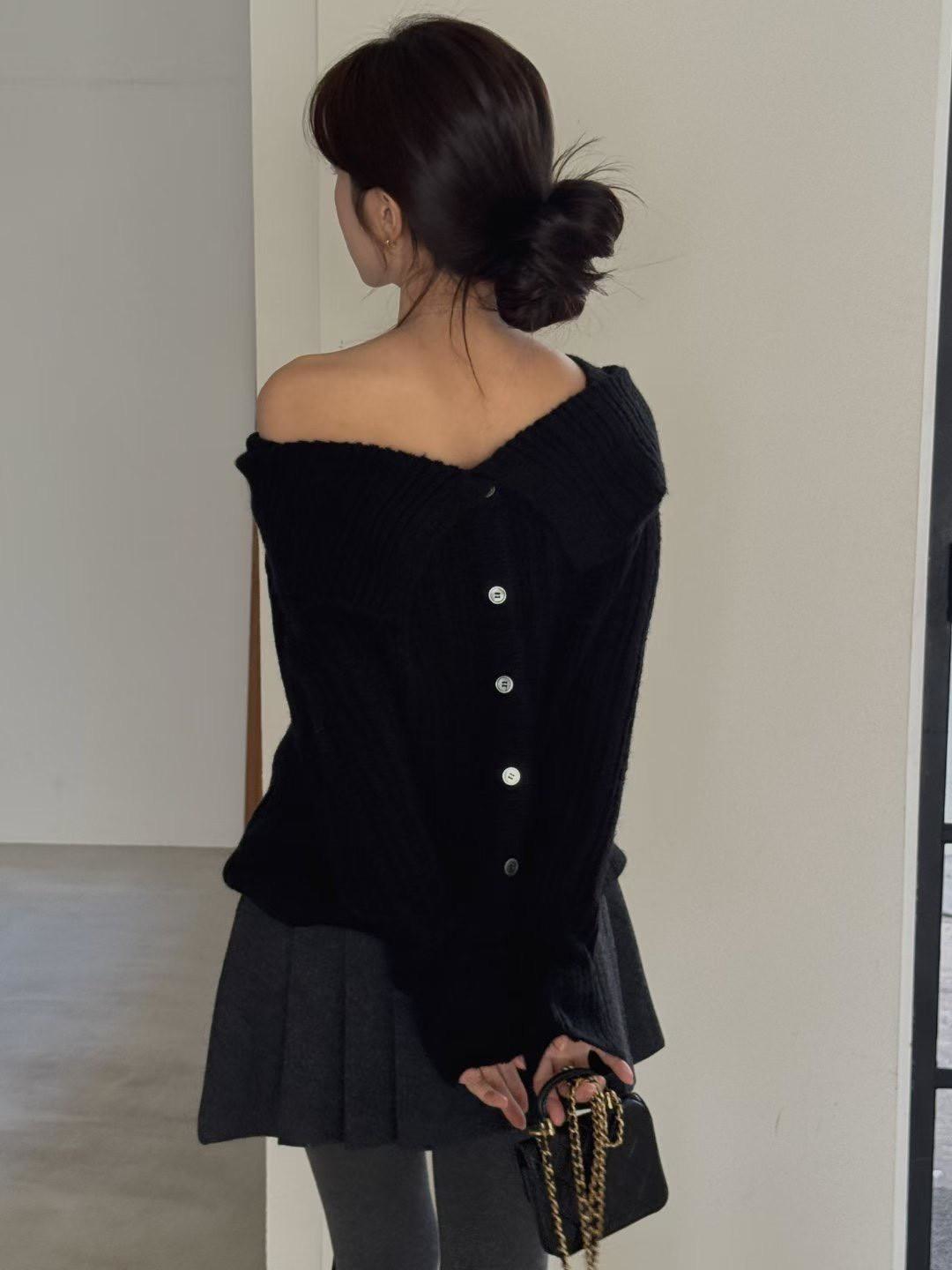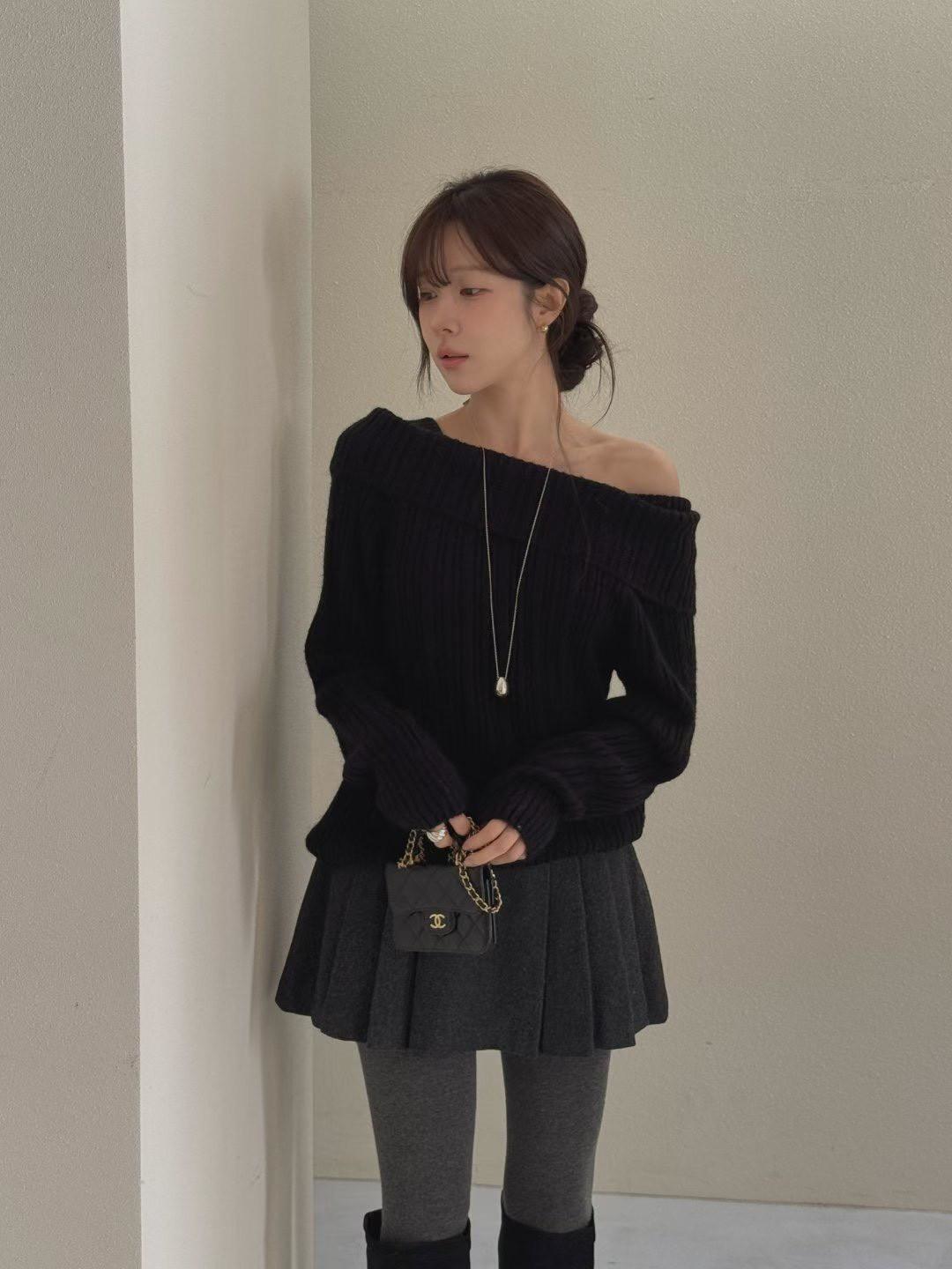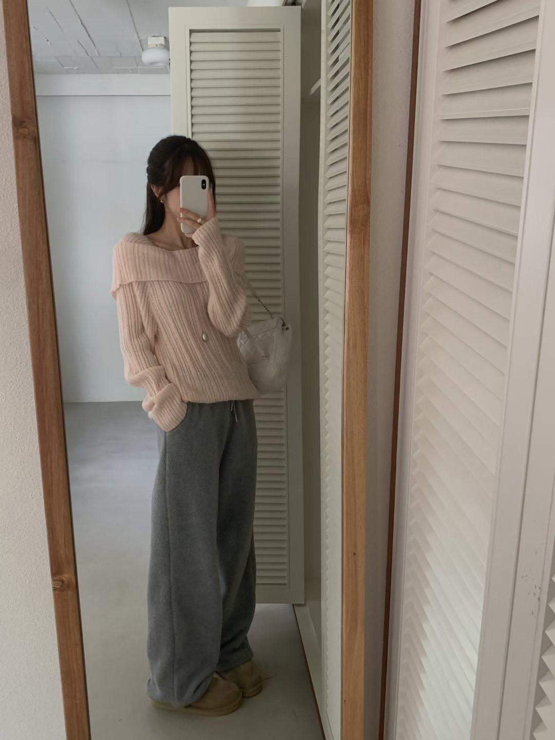 反摺平領羊毛針織衣+鬆緊短褲SET