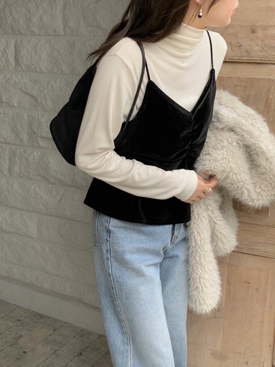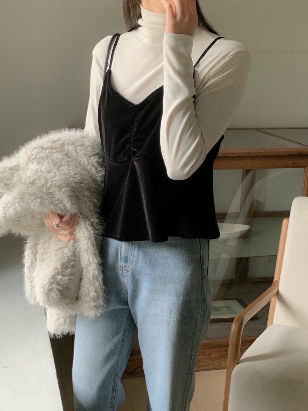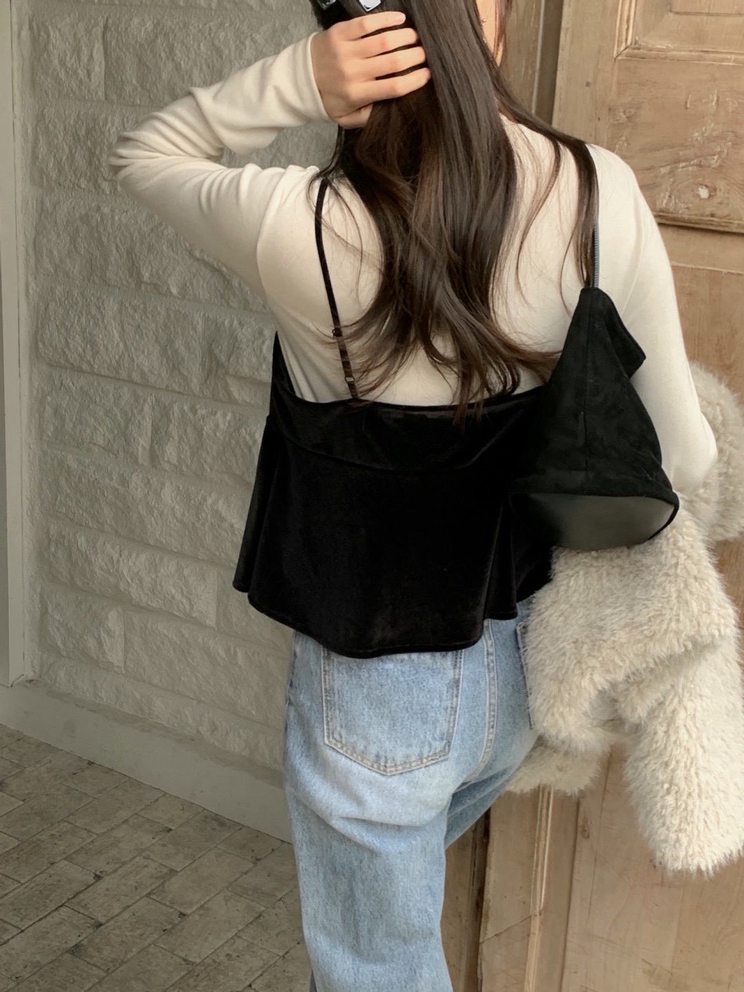 細肩荷葉下襬絲絨背心