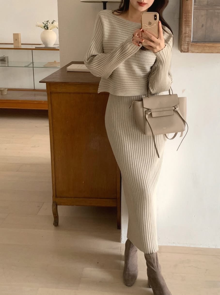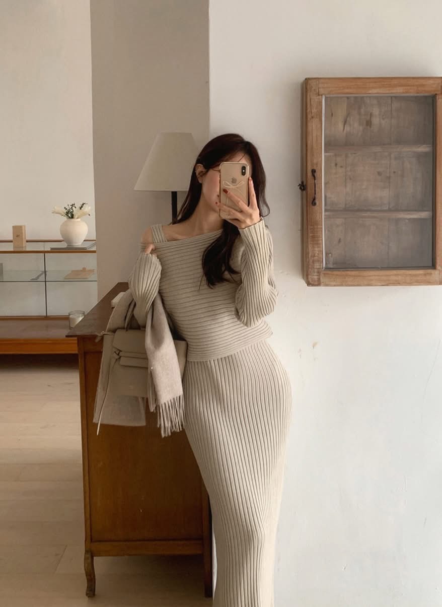 斜肩長版麻花針織衣+鬆緊落地長裙SET