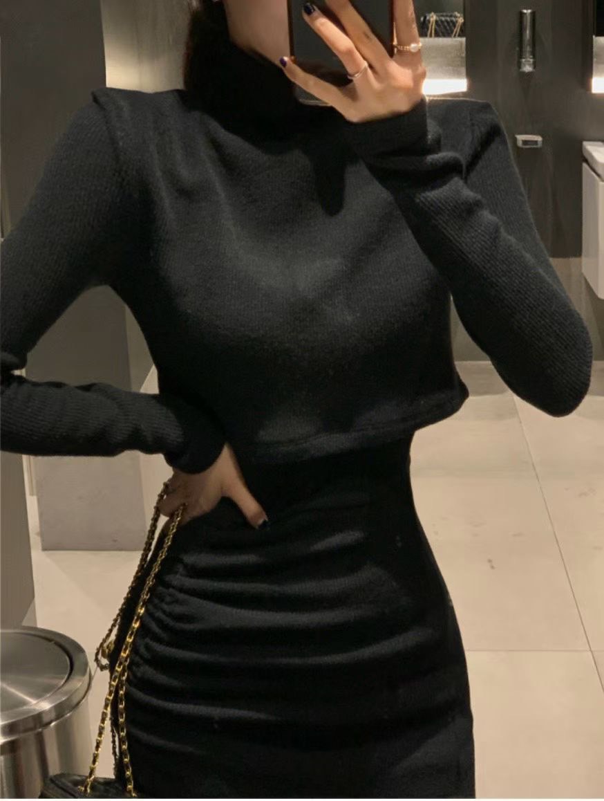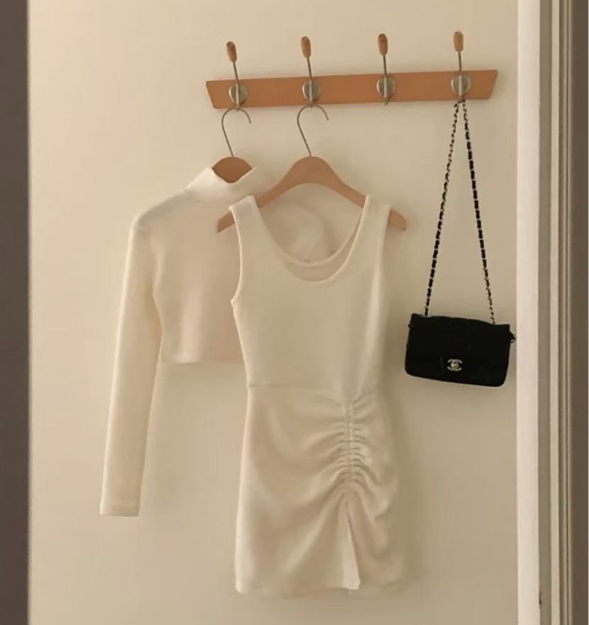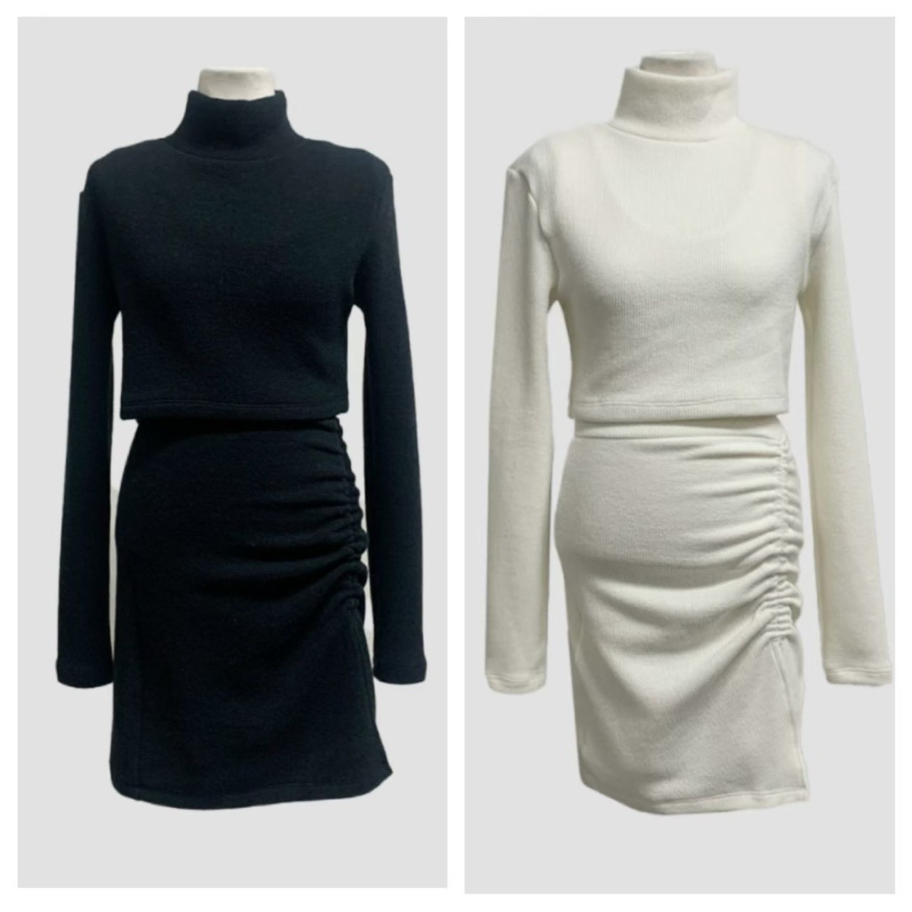 短版高領素色上衣+側抓皺背心短洋SET