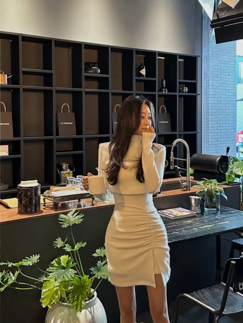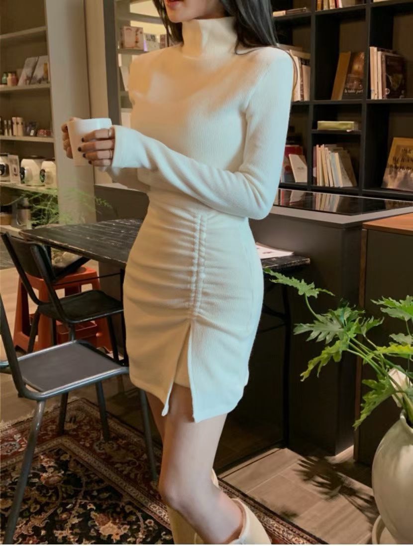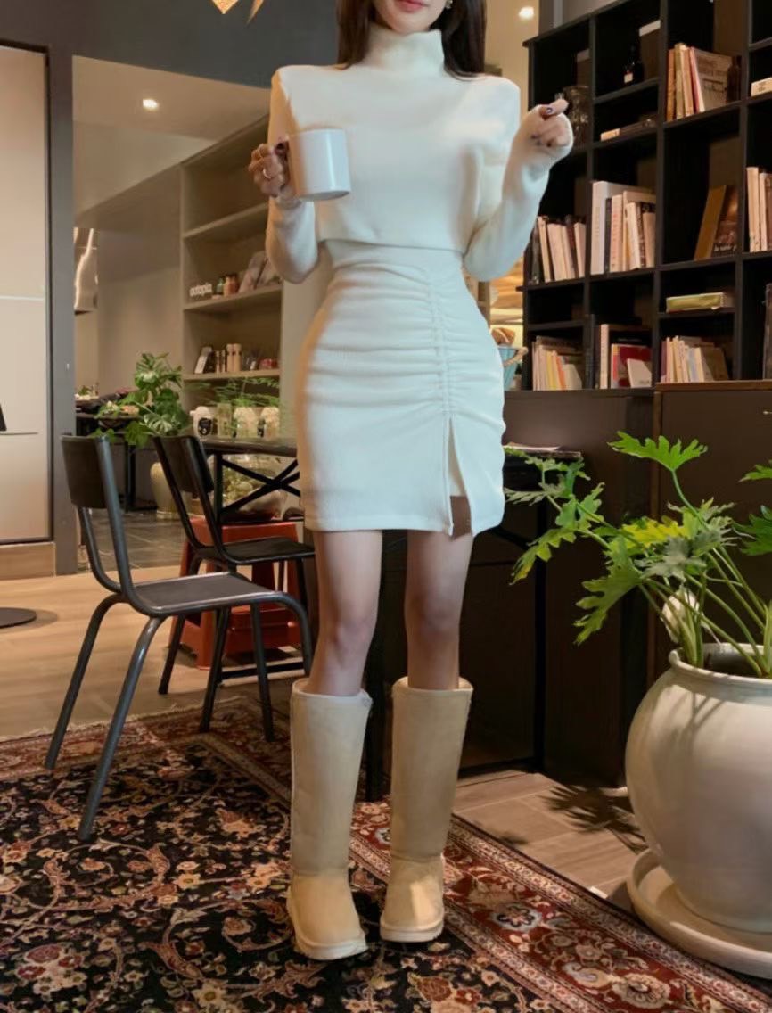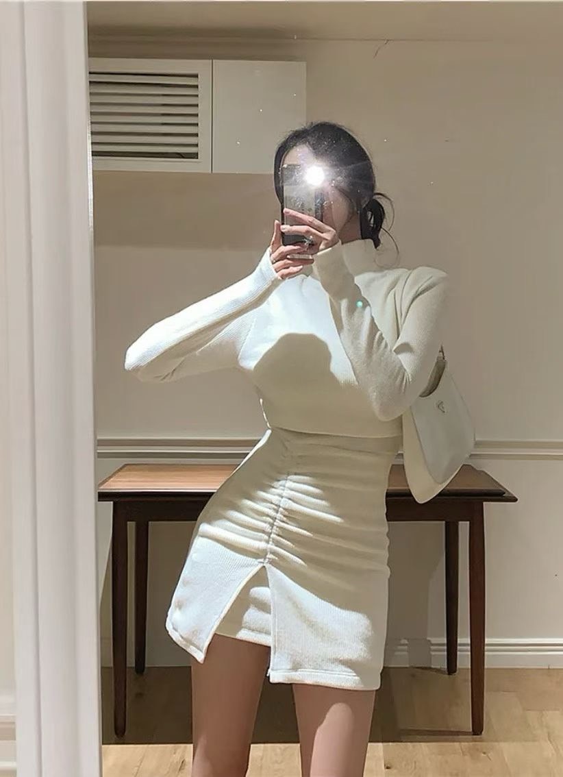 短版高領素色上衣+側抓皺背心短洋SET