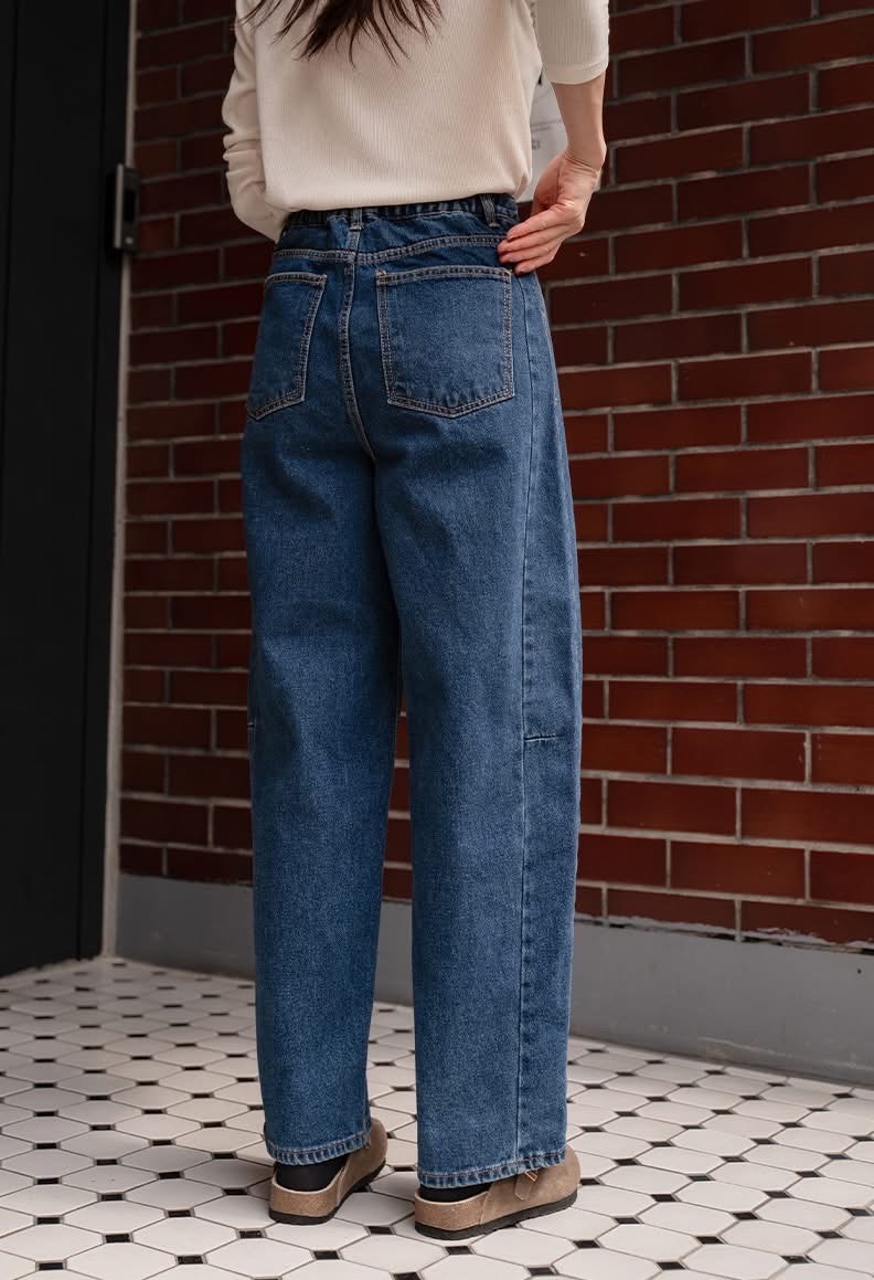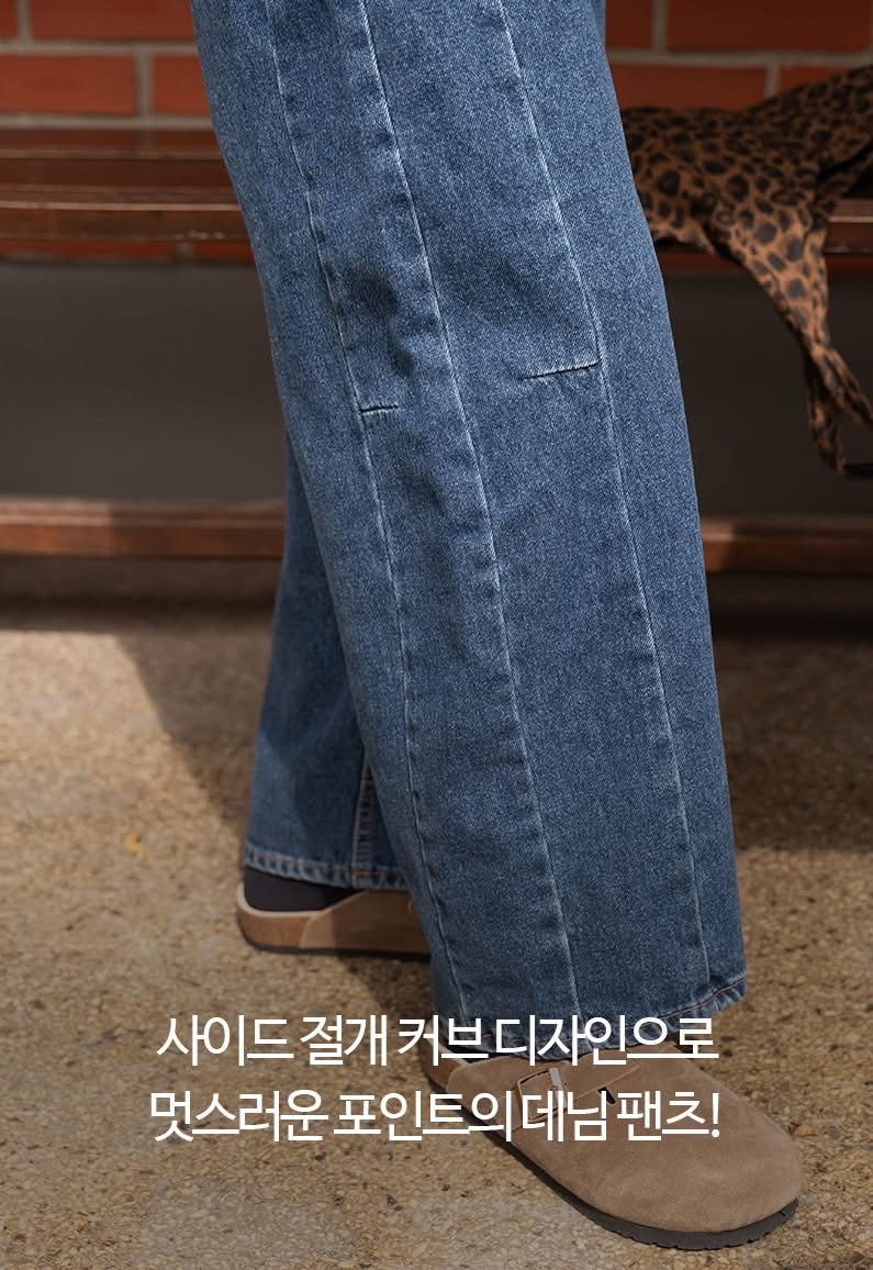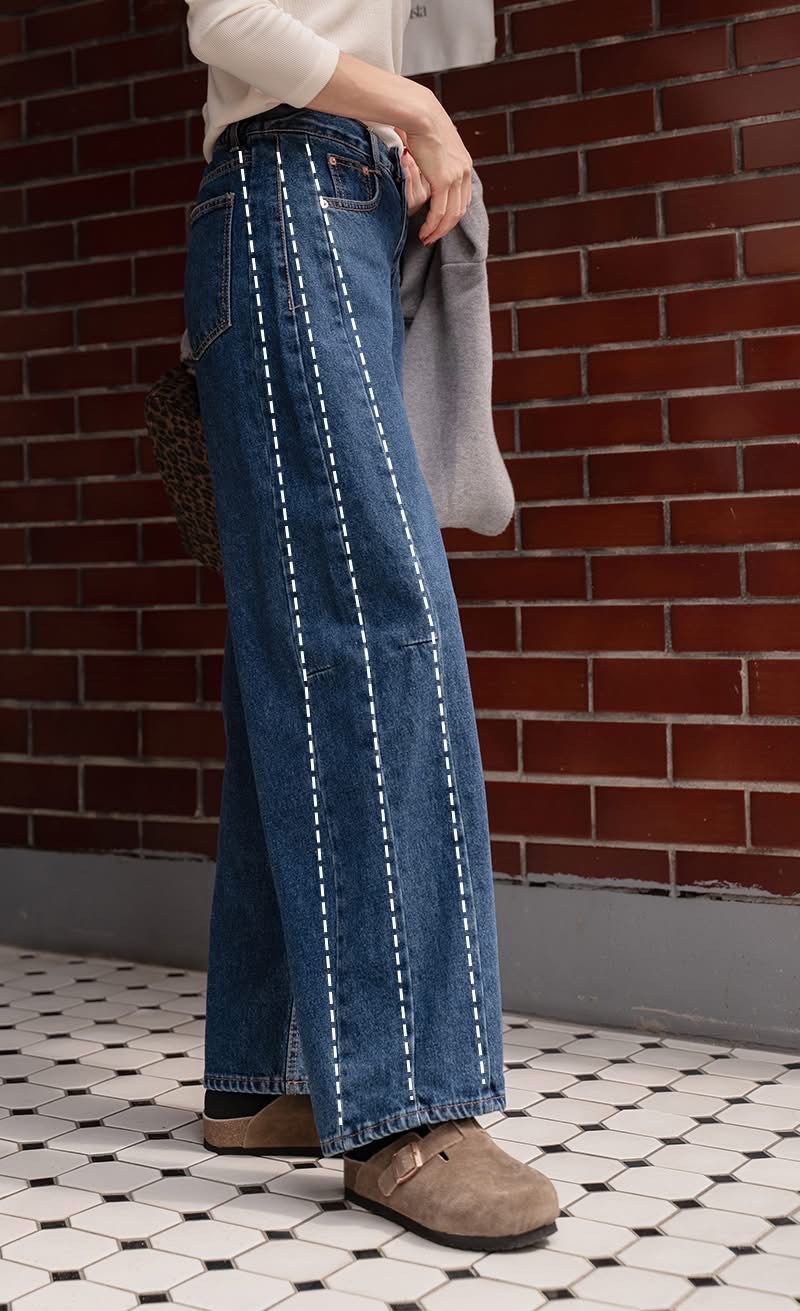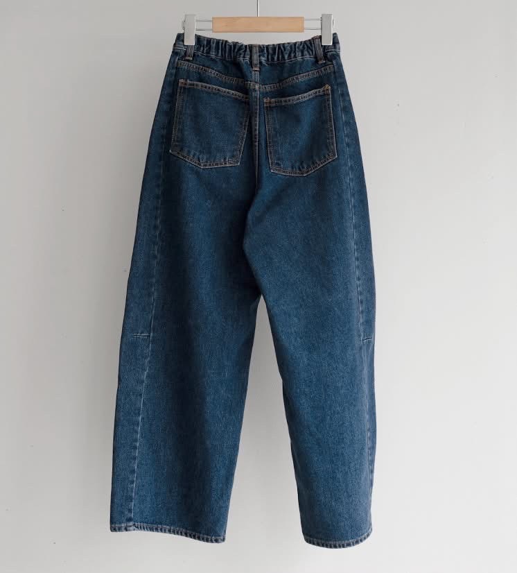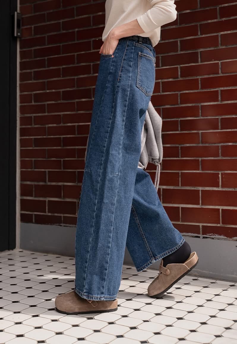 兩側壓線裁切寬版後鬆緊牛仔褲