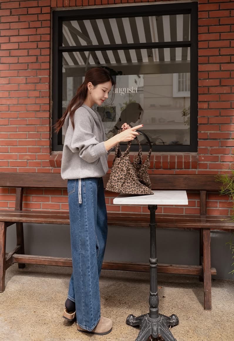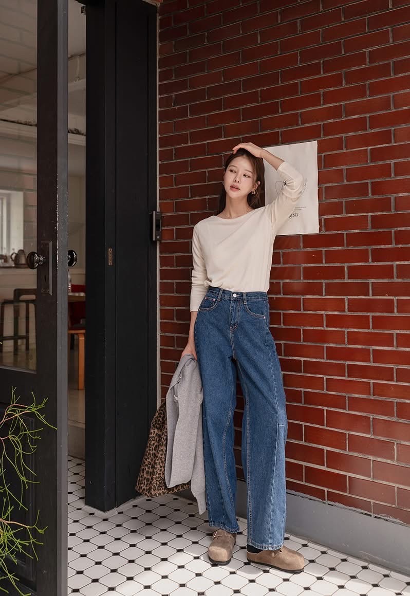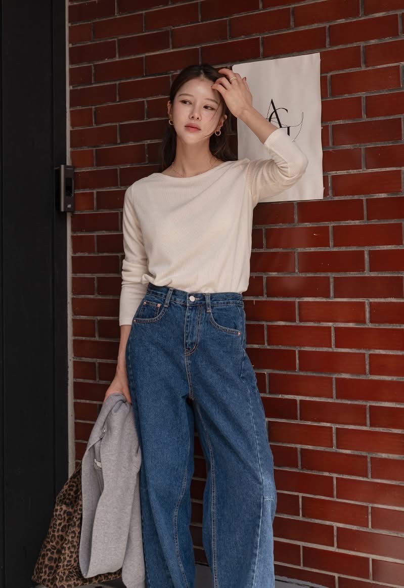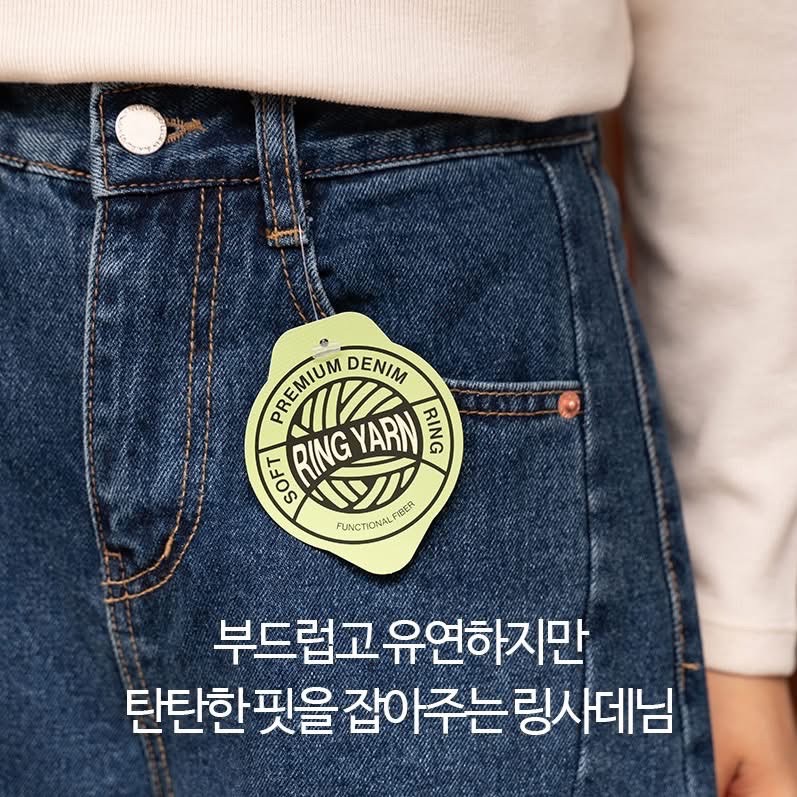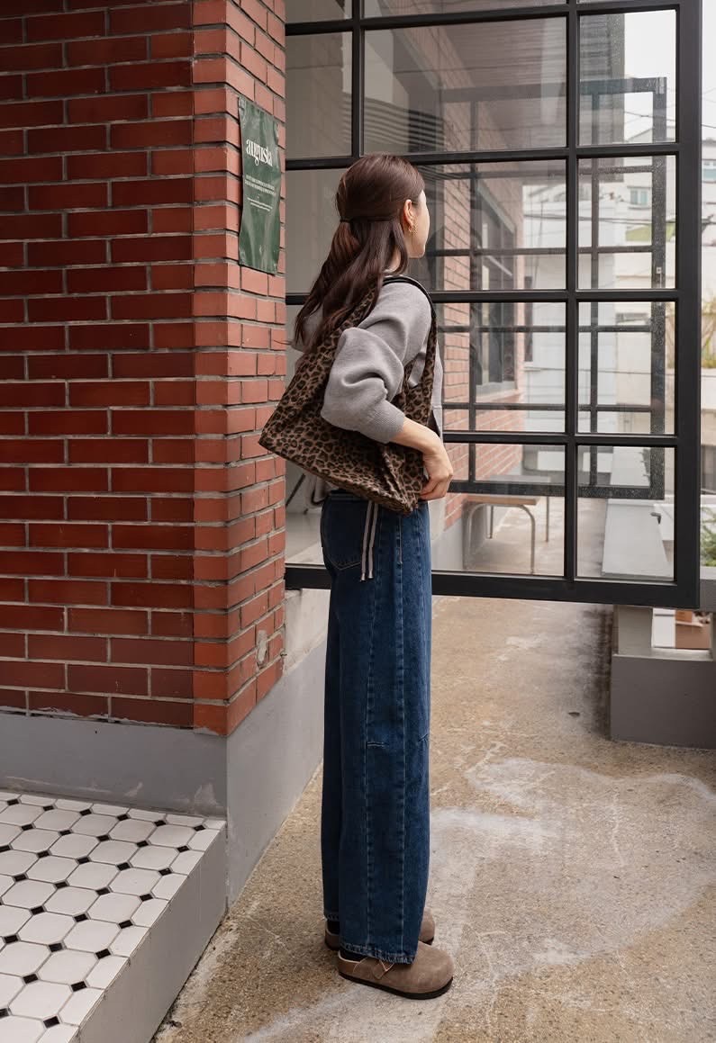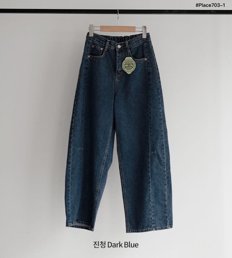兩側壓線裁切寬版後鬆緊牛仔褲