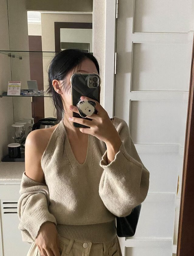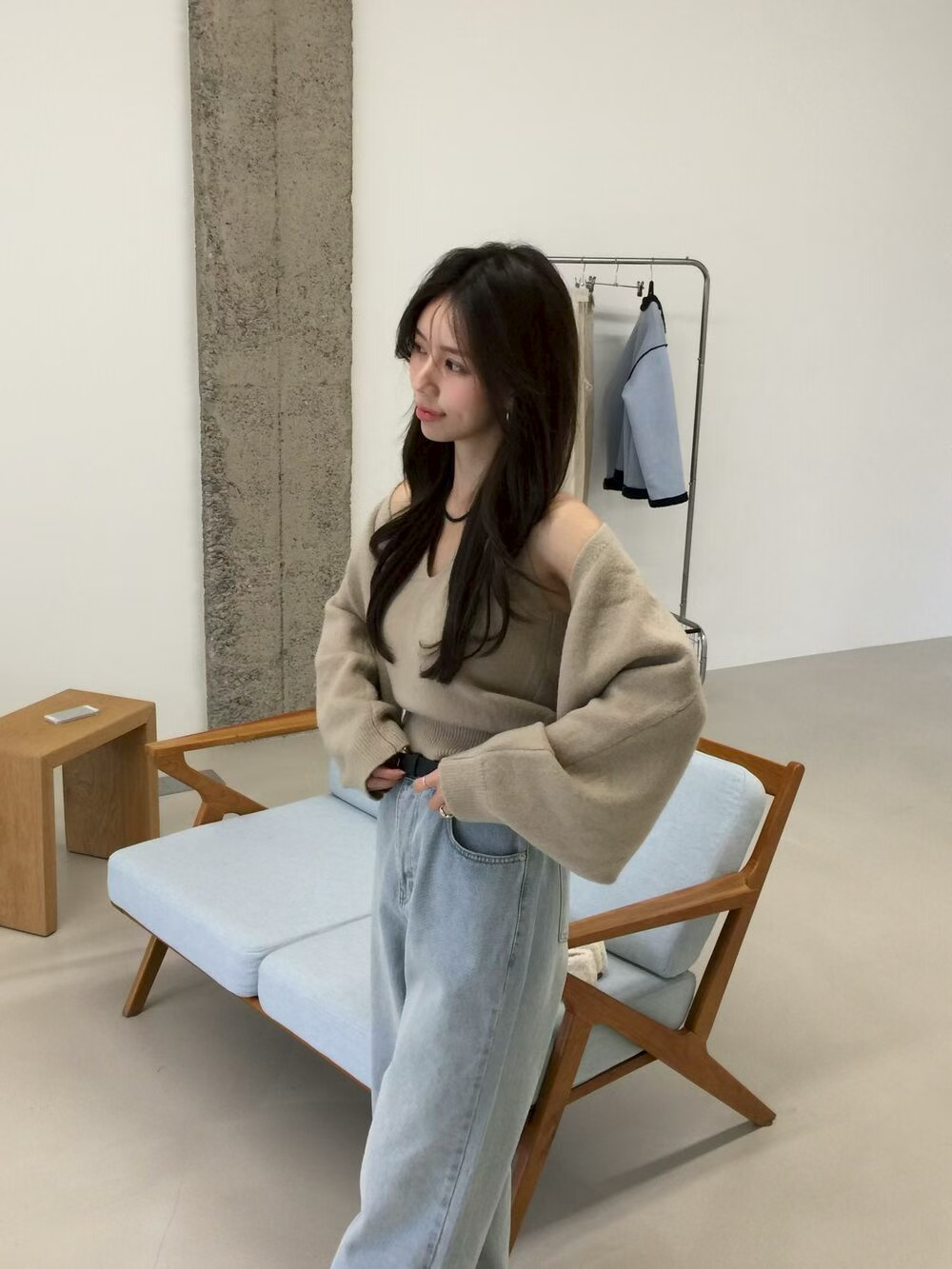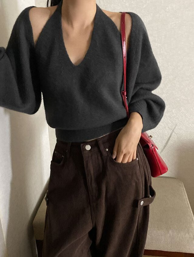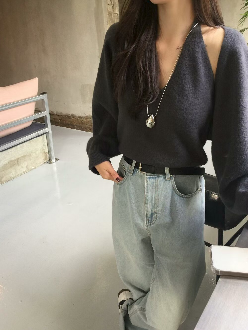 落肩寬鬆橫紋鏤空微透薄針織衫